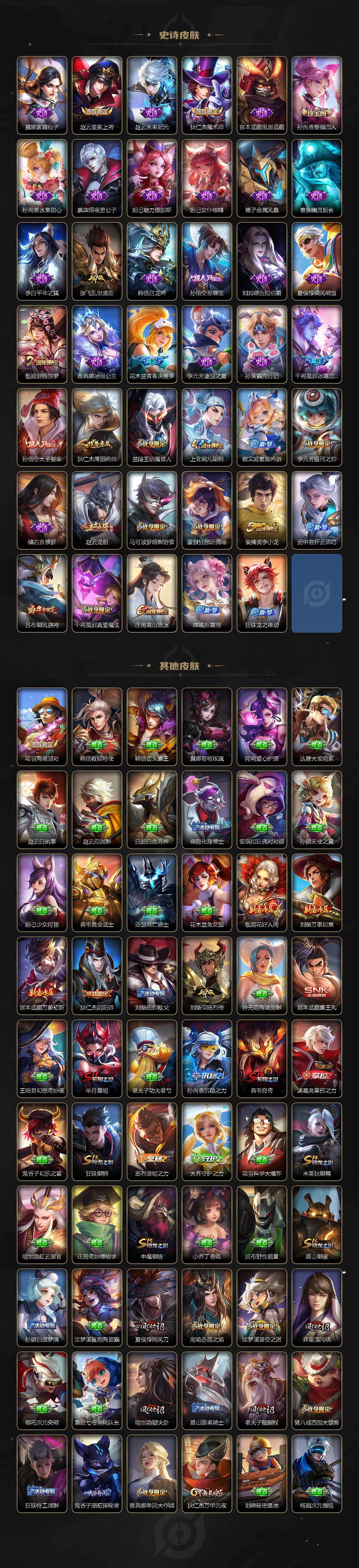 【史诗皮肤】:露娜紫霞仙子,赵云皇家上将,赵云未来纪元,狄仁杰魔术师,宫本武藏鬼剑武藏,孙尚香蔷薇恋人,孙尚香水果甜心,嬴政暗夜贵公子,妲己魅力维加斯,妲己女仆咖啡,墨子金属风暴,曹操幽灵船长,李白千年之狐,张飞乱世虎臣,韩信白龙吟,孙悟空至尊宝,刘邦德古拉伯爵,夏侯惇乘风破浪,甄姬游园惊梦,雅典娜冰冠公主,花木兰青春决赛季,李元芳逐浪之夏,孙策猫狗日记,干将莫邪冰霜恋舞曲,孙悟空大圣娶亲,狄仁杰鹰眼统帅,兰陵王驯魔猎人,上官婉儿梁祝,蔡文姬繁星吟游,李元芳银河之约,橘右京修罗,赵云龙胆,马可波罗暗影游猎,蒙犽狂想玩偶喵,裴擒虎李小龙,云中君纤云弄巧,吕布御风骁将,干将莫邪真爱魔法,庄周高山流水,嫦