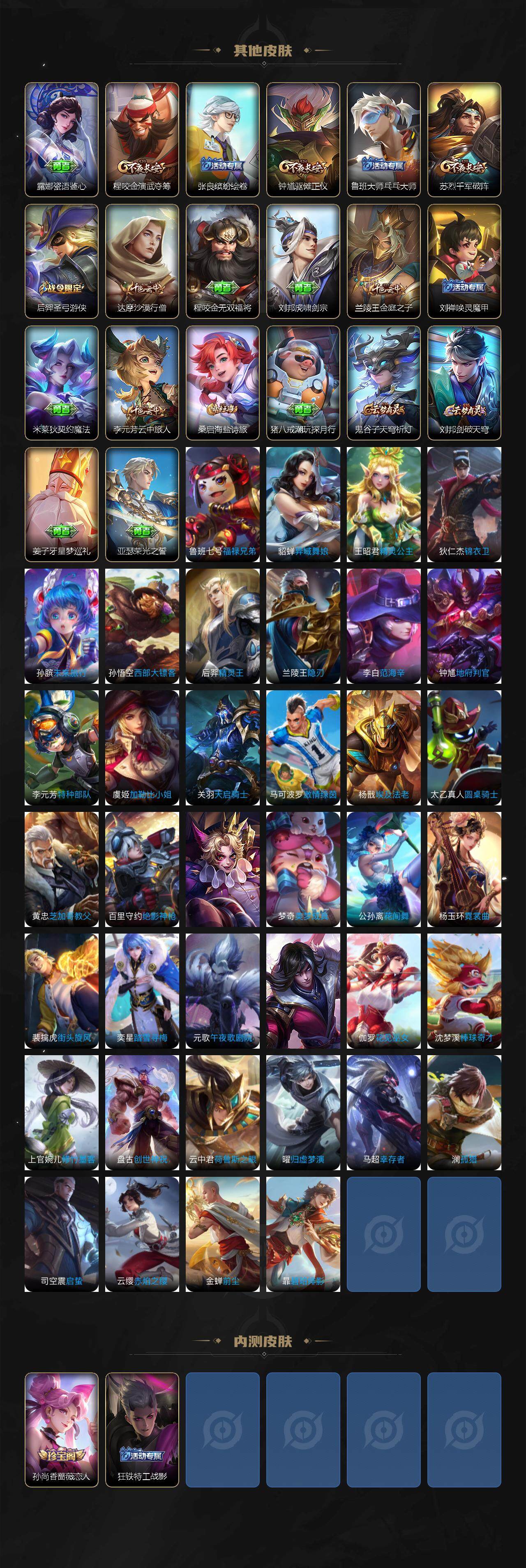 【赛季限定】:芈月重明,夏侯惇朔风刀,典韦穷奇,狄仁杰万华元夜,达摩沙漠行僧,老夫子醍醐杖,程咬金演武夺筹,兰陵王金庭之子,牛魔御旌,李元芳云中旅人,钟馗驱傩正仪,鬼谷子原初探秘者,苏烈千军破阵,弈星混沌棋,明世隐疑决卦,狂铁御狮,米莱狄御霄,盾山御銮,桑启海盐诗旅,鬼谷子天穹祈灯,刘邦剑破天穹