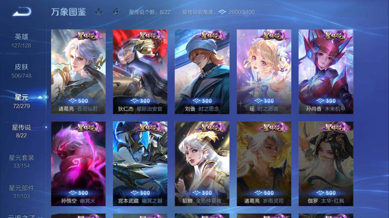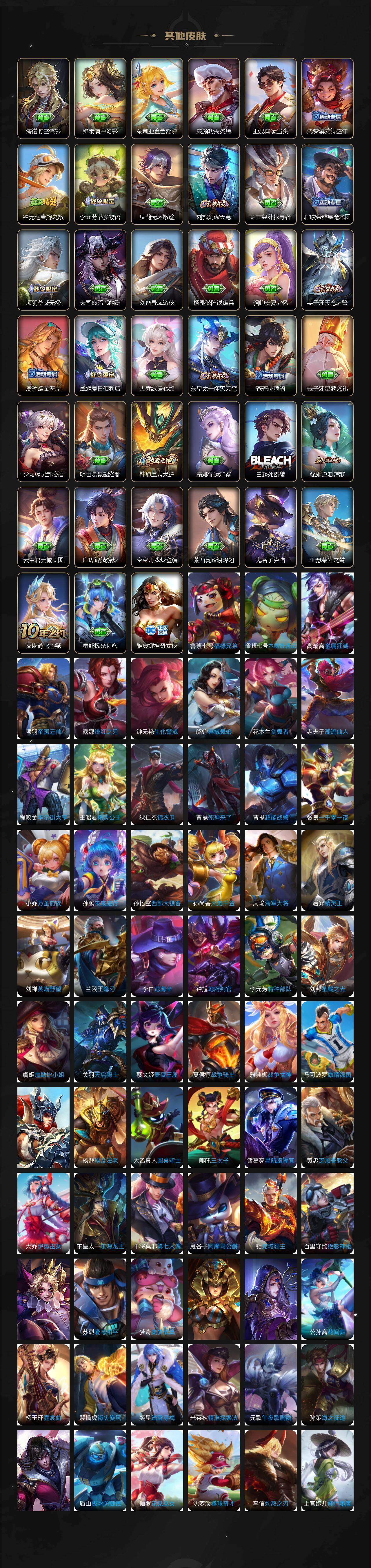 小乔青蛇,大乔白蛇,瑶遇见神鹿,娜可露露晚萤,伽罗箭羽风息,李元芳逐浪之夏,不知火舞魅语,公孙离无限星赏官,大乔猫狗日记,孙策猫狗日记,阿轲节奏热浪,露娜紫霞仙子,诸葛亮黄金分割率,王昭君偶像歌手,韩信白龙吟,项羽苍穹之光,孙尚香时之恋人,阿轲暗夜猫娘,雅典娜冰冠公主,吕布末日机甲,鲁班七号电玩小子,蒙犽龙鼓争鸣,橘右京修罗,墨子龙骑士,嬴政摇滚巨星,刘禅绅士熊喵,刘禅天才门将,白起星夜王子,安琪拉心灵骇客,安琪拉时之奇旅,程咬金功夫厨神,刘邦德古拉伯爵,兰陵王暗隐猎兽者,曹操幽灵船长,宫本武藏鬼剑武藏,司马懿暗渊魔法,亚瑟心灵战警,钟馗乐园奇幻夜,杨戬天秀·启明,蔡文姬舞动绿茵,廉颇地狱岩魂,西施诗语江南,小乔缤纷独角兽,夏侯惇乘风破浪,花木兰水晶猎龙者,铠曙光守护者,百里玄策热力回旋,墨子金属风暴,百里玄策原初追逐者,吕布圣诞狂欢,貂蝉圣诞恋歌,百里守约特工魅影,嬴政暗夜贵公子,嫦娥拒霜思,雅典娜黎明之约,李白千年之狐,哪吒雪上飞焰,夏洛特永昼,澜赏金猎手,艾琳奇遇舞章,貂蝉唤灵魅影,高渐离天秀·音浪,张良千筹问战,弈星滕王阁序,刘禅电玩·爆裂旋风,蒙犽百解令,周瑜雪夜绮愿,高渐离燃音魔法,伽罗琥珀纪元,大乔乘龙·忆丹青,安琪拉乘龙·聚宝船,曹操夜都魔契