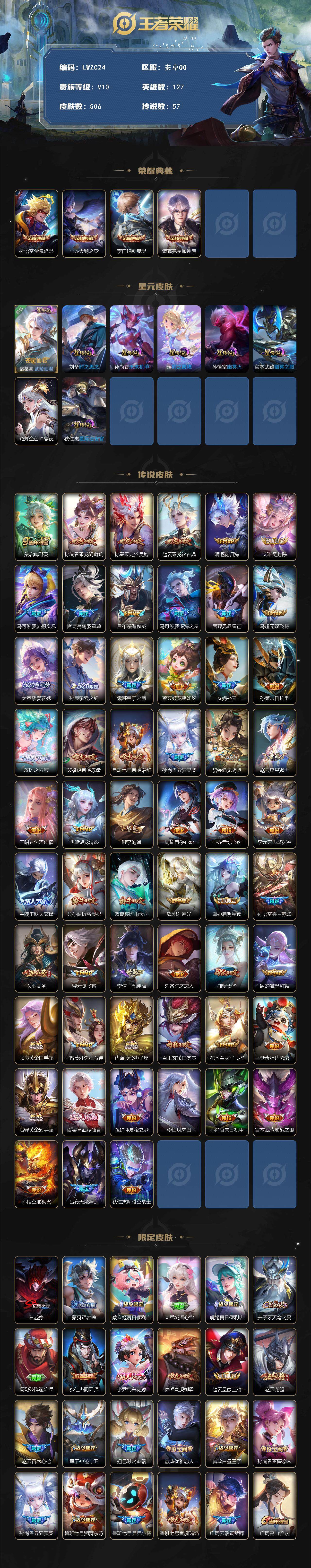 - [12062121]V8 2典藏 1无双 25传说 125英雄 295皮肤 可修改实名 优质装备:九霄神辉(木兰典藏),银白咏叹调(倪克斯侍卫),韩信群星魔术团(韩信无双),黄金狮子座,黄金射手座,云鹰飞将(小将军),炽阳神光,一念神魔,末日机甲-孙尚香(绿蚂蚱),零号·赤焰,地狱之眼,时之恋人-刘备(电焊工),无双飞将,碎云,山海·苍雷引(电光曜子),画中仙,澜逐花归海,琥珀纪元铠 传说皮:乘龙·淬吴钩(孙策年限),典韦战鼓燎原 珍宝阁皮:妄想食味,蔷薇恋人 限定皮:愿照·山河定(司空震年限),愿照·千秋盛(女娲年限),鸣野蒿,至尊宝,白晶晶,飞衡(韩信年限),遇见飞天,诗剑行,齐天大圣,怒海麟威,游园惊梦,梁祝,天狼狩猎者,李小龙,默契交锋-花木兰,孙行者,大圣娶亲,深海之息(深海大菠萝) 史诗皮:器灵·浮梦炉,灵蛊蚀心,星界战将,茶境仙,百相守梦-百里守约,紫霞仙子,苍穹之光,电玩小子(小书包),白龙吟,黄金分割率,特工魅影,千年之狐,魅语,高渐离燃音魔法,蒙恬荣光圣徽,冰冠公主,青蛇,百相守梦(刘备),暗夜猫娘,龙骑士(小龙虾),末日机甲-吕布,猫狗日记-大乔,时之恋人-孙尚香,乱世虎臣,节奏热浪,修罗,女仆咖啡,摇滚巨星,水果甜心,绅士熊喵,星夜王子,功夫厨神,德古拉伯爵,暗隐猎兽者,幽灵船长,鬼剑武藏,暗渊魔法,心灵战警,乐园奇幻夜,地狱岩魂,纤云弄巧,繁星吟游(呼啦呼啦),缤纷独角兽,乘风破浪,水晶猎龙者,曙光守护者,箭羽风息,金属风暴,原初追逐者,圣诞狂欢,鹰眼统帅,暗夜贵公子,魅力维加斯,无心,未来纪元-赵云