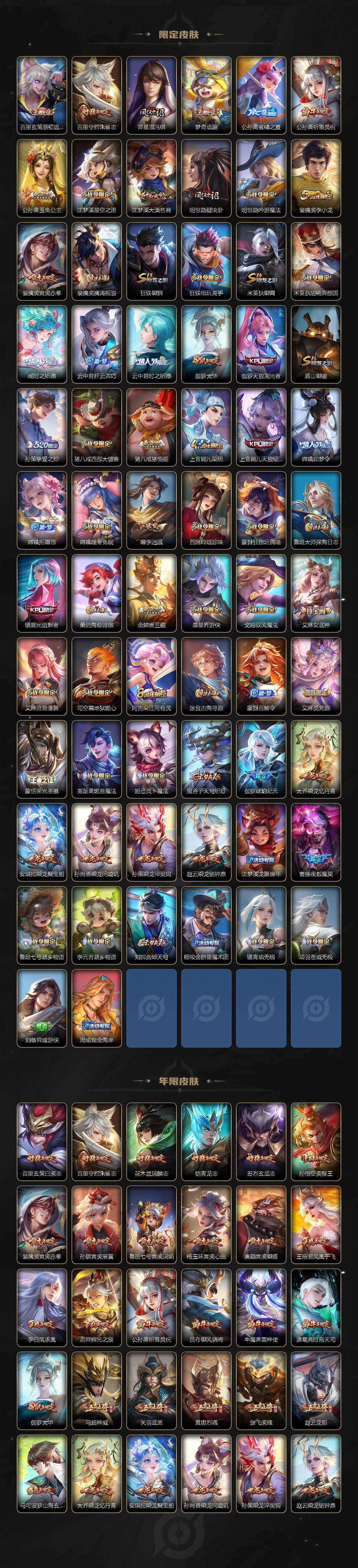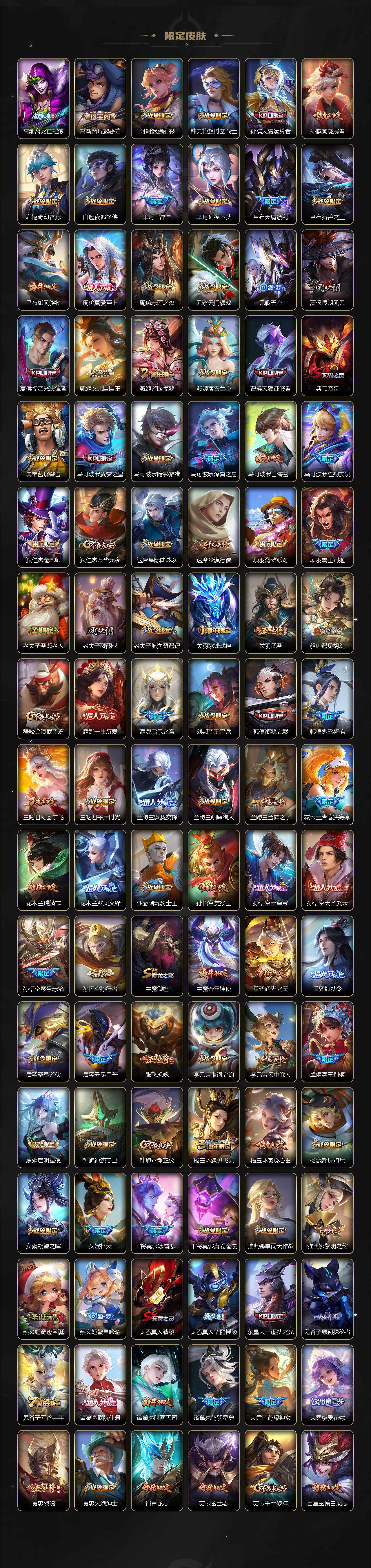 【限定皮肤】:白起狰,蒙犽顽岩魄,蔡文姬夏日便利店,大乔绒语心约,虞姬夏日便利店,姜子牙天穹之誓,杨戬破阵退雄兵,狄仁杰阴阳师,小乔纯白花嫁,廉颇寅虎御盾,赵云皇家上将,赵云龙胆,赵云百木心枪,墨子神迹守卫,妲己时之彼端,嬴政优雅恋人,嬴政白昼王子,孙尚香蔷薇恋人,孙尚香异界灵契,鲁班七号狮舞东方,鲁班七号乒乒小将,鲁班七号寅虎瑞焰,庄周云端筑梦师,庄周高山流水,高渐离死亡摇滚,高渐离玩趣恶龙,阿轲迷踪丽影,钟无艳超时空战士,孙膑天狼运算者,孙膑寅虎展翼,扁鹊奇幻香踪,白起夜都怪侠,芈月白晶晶,芈月幻夜卜梦,吕布天魔缭乱,吕布猎兽之王,吕布御风骁将,周瑜真爱至上,周瑜赤莲之焰,元歌云间偶戏,元歌无心,夏侯惇朔风刀,夏侯惇匿光决锋者,甄姬女儿国国王,甄姬游园惊梦,甄姬落雪兰心,曹操天狼征服者,典韦穷奇,典韦蓝屏警告,马可波罗逐梦之星,马可波罗暗影游猎,马可波罗深海之息,马可波罗山海玄木吟,马可波罗妄
