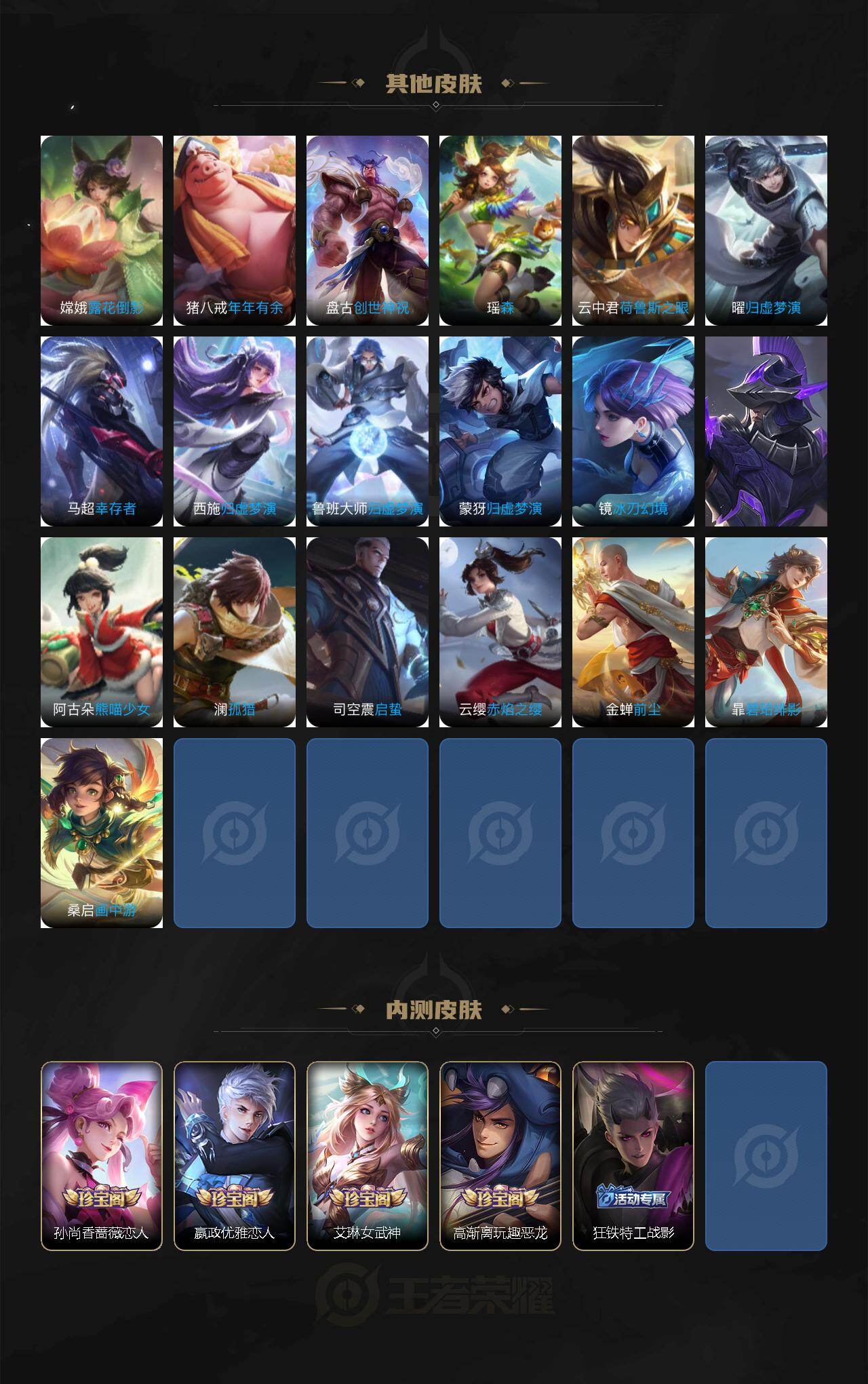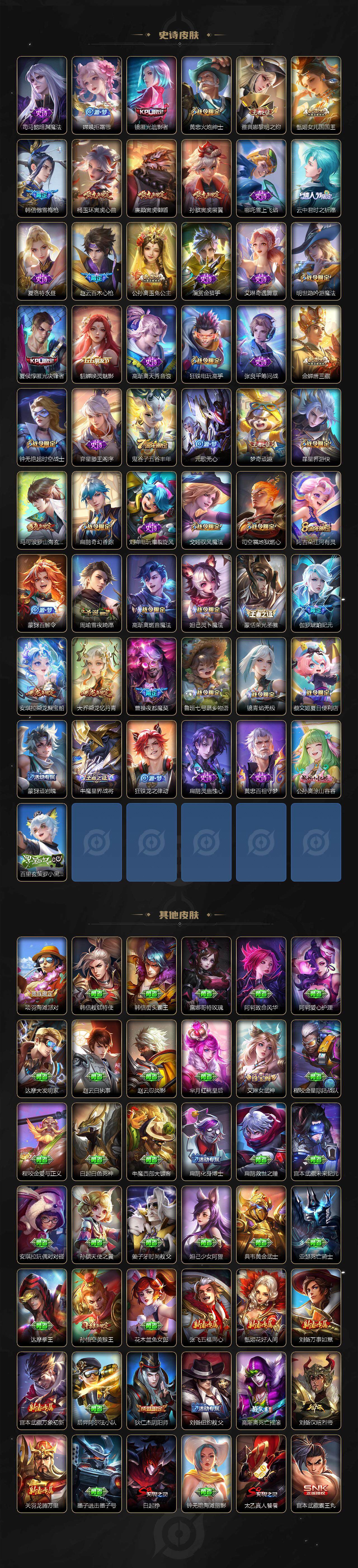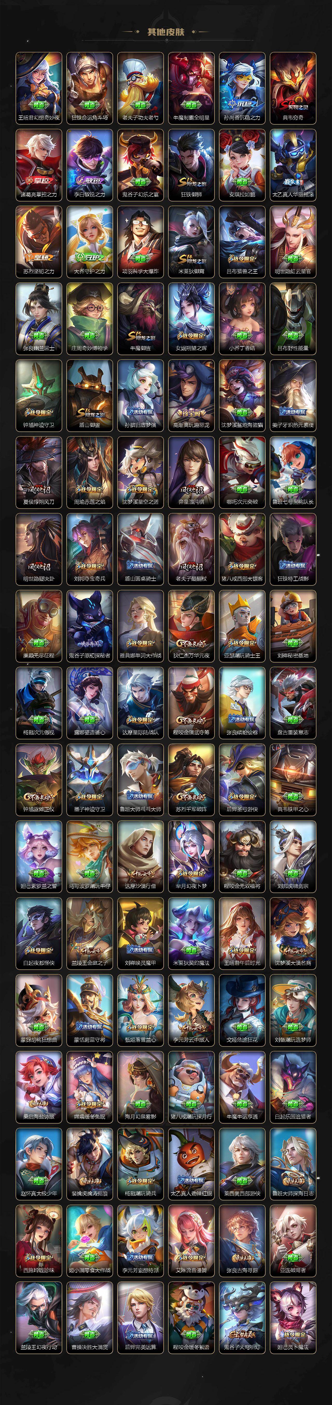 关羽冰锋战神,裴擒虎李小龙,上官婉儿梁祝,牛魔奔雷神使,公孙离祈雪灵祝,吕布御风骁将,诸葛亮时雨天司,赵云龙胆,关羽武圣,黄忠烈魂,张飞虎魄,马超神威,后羿辉光之辰,伽罗太华,曹操天狼征服者,孙膑天狼运算者,上官婉儿天狼绘梦者,伽罗天狼溯光者,马可波罗逐梦之星,韩信逐梦之影,东皇太一逐梦之光,铠青龙志,百里玄策白虎志,花木兰瑞麟志,苏烈玄武志,百里守约朱雀志,王昭君凤凰于飞,项羽霸王别姬,虞姬霸王别姬,小乔纯白花嫁,周瑜真爱至上,孙悟空大圣娶亲,露娜一生所爱,花木兰默契交锋,兰陵王默契交锋,后羿如梦令,嫦娥如梦令,孙悟空至尊宝,雅典娜神奇女侠,干将莫邪冰霜恋舞曲,花木兰青春决赛季,蔡文姬奇迹圣诞,妲己时之彼端,公孙离蜜橘之夏,芈月白晶晶,孙悟空美猴王,庄周云端筑梦师,鲁班七号乒乒小将,大乔白鹤梁神女,猪八戒猪悟能,廉颇寅虎·御盾,孙尚香异界灵契,老夫子圣诞老人,孙悟空孙行者,甄姬女儿国国王,镜匿光追影者,韩信傲雪梅枪,鲁班七号寅虎·瑞焰,孙膑寅虎·展翼,杨玉环寅虎·心曲,裴擒虎寅虎·赤拳,云中君时之祈愿,瑶时之祈愿,女娲补天,赵云百木心枪,公孙离玉兔公主,露娜启示之音,夏侯惇匿光决锋者,后羿无尽星芒,马可波罗深海之息,金蝉唐三藏,马可波罗山海·玄木吟,桑启鸣野蒿