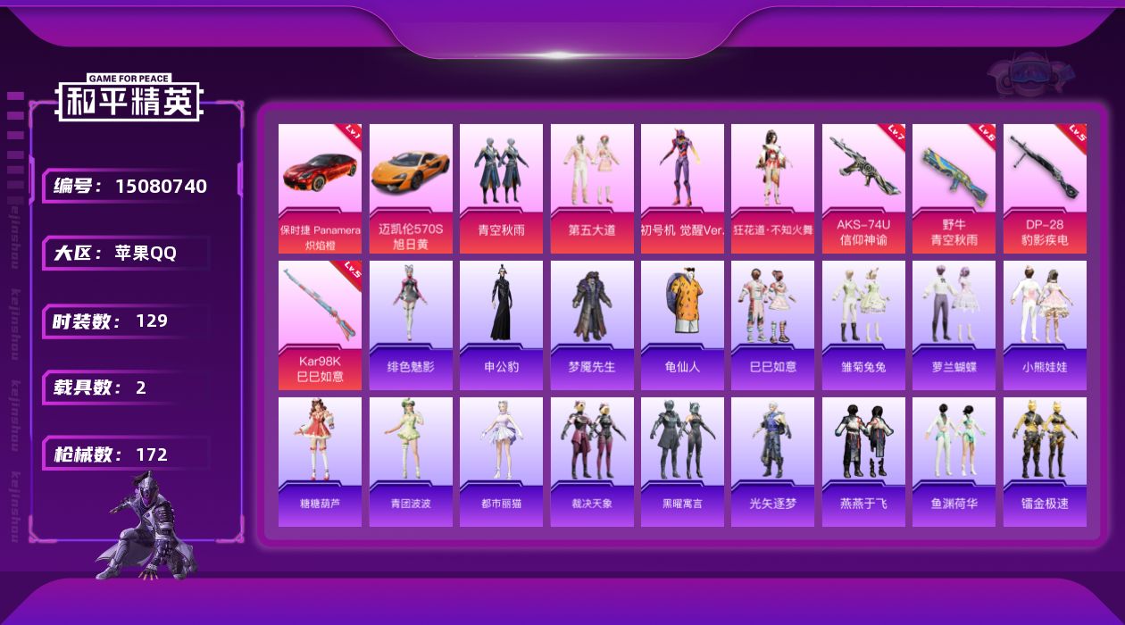 [15080740]【店主推荐捡漏号!可直接换绑】/素材身法号 苹果 手Q-4粉装-4特效枪-2载具-4粉色飞行器-5.4w热力值-10王牌印记-129套装-172枪皮【红色载具】:保时捷Panamera(炽焰橙)(一级)【热门品类】:套装-龟仙人【粉色载具】:迈凯伦570S(旭日黄),保时捷Panamera(炽焰橙)【粉色套装】:粉装-青空秋雨,粉装-第五大道,角色-初号机 觉醒Ver.,角色-狂花道·不知火舞【粉色枪皮等级】:野牛-青空秋雨(六级),AKS-74U-信仰神谕(七级),Kar98K-巳巳如意(五级),DP-28-豹影疾电(五级)【粉色飞行器】:酣梦熊熊飞行器,千面幻镜飞行器