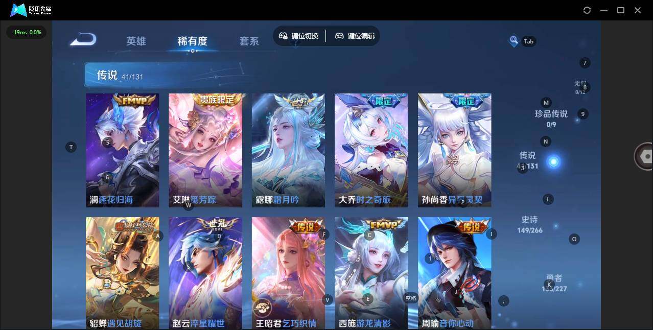 【传说皮肤】:澜逐花归海,艾琳觅芳踪,露娜霜月吟,大乔时之奇旅,孙尚香异界灵契,貂蝉遇见胡旋,赵云淬星耀世,王昭君乞巧织情,西施游龙清影,周瑜音你心动,小乔音你心动,李元芳飞鸢探春,公孙离祈雪灵祝,诸葛亮时雨天司,铠绛天战甲,镜炽阳神光,虞姬启明星使,孙悟空零号赤焰,曜云鹰飞将,李信一念神魔,刘备时之恋人,伽罗太华,貂蝉猫影幻舞,张良黄金白羊座,干将莫邪久胜战神,虞姬云霓雀翎,达摩黄金狮子座,百里玄策白虎志,花木兰冠军飞将,梦奇胖达荣荣,后羿黄金射手座,杨戬永曜之星,诸葛亮武陵仙君,貂蝉仲夏夜之梦,李白凤求凰,孙尚香末日机甲,宫本武藏地狱之眼,孙悟空地狱火,吕布天魔缭乱,武则天海洋之心,狄仁杰超时空战士