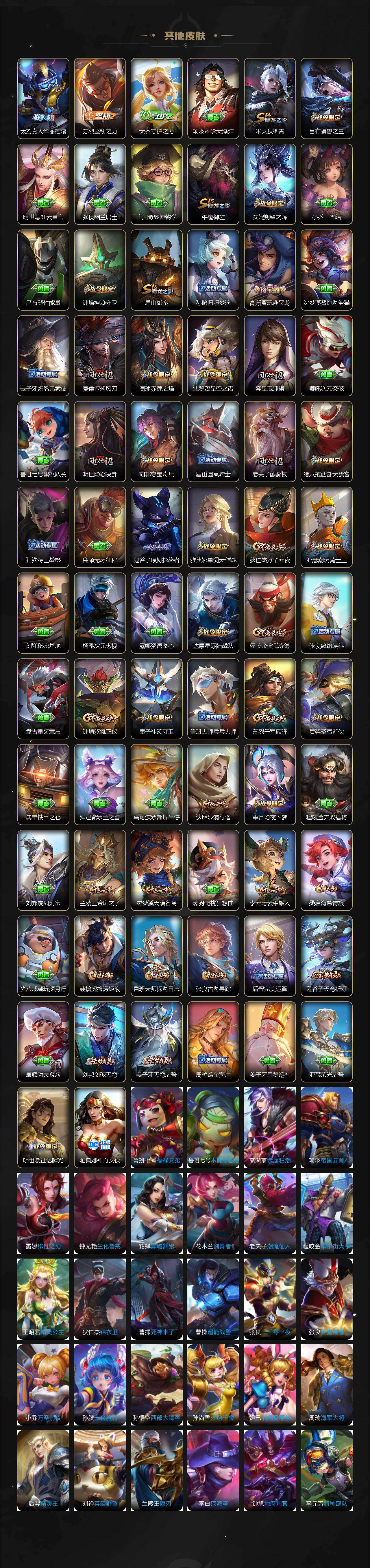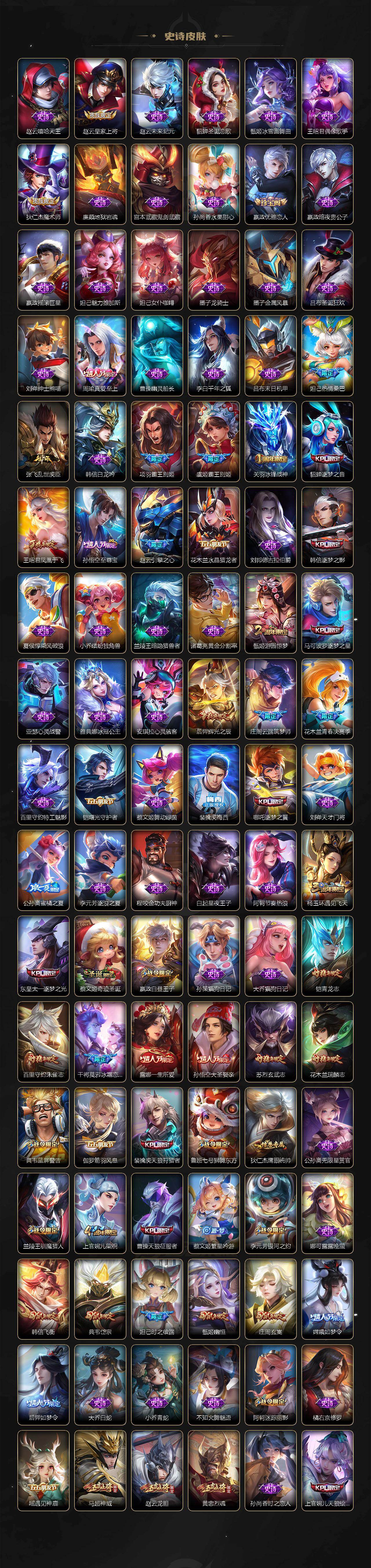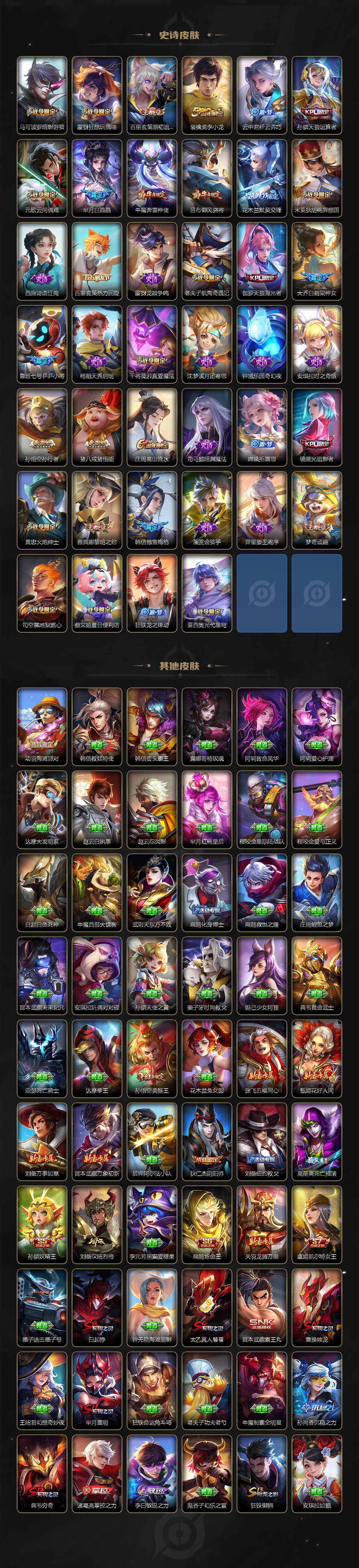 【限定皮肤】:白起狰,蔡文姬夏日便利店,姜子牙天穹之誓,狄仁杰阴阳师,虞姬凯尔特女王,赵云皇家上将,赵云引擎之心,赵云龙胆,墨子神迹守卫,妲己热情桑巴,妲己时之彼端,嬴政优雅恋人,嬴政白昼王子,孙尚香异界灵契,鲁班七号狮舞东方,鲁班七号乒乒小将,庄周云端筑梦师,庄周玄嵩,庄周高山流水,高渐离死亡摇滚,高渐离玩趣恶龙,阿轲迷踪丽影,钟无艳王者之锤,孙膑妖精王,孙膑天狼运算者,扁鹊炼金王,芈月重明,芈月白晶晶,芈月幻夜卜梦,吕布天魔缭乱,吕布猎兽之王,吕布御风骁将,周瑜真爱至上,周瑜赤莲之焰,元歌云间偶戏,夏侯惇朔风刀,甄姬幽恒,甄姬游园惊梦,曹操烛龙,曹操天狼征服者,典韦穷奇,典韦蓝屏警告,典韦岱宗,马可波罗逐梦之星,马可波罗暗影游猎,狄仁杰魔术师,狄仁杰万华元夜,达摩星际陆战队,达摩沙漠行僧,项羽海滩派对,项羽霸王别姬,老夫子醍醐杖,老夫子航海奇遇记,关羽冰锋战神,貂蝉逐梦之音,貂蝉遇见胡旋,程咬金演武夺筹,露娜一生所爱,刘邦夺宝奇兵,韩信逐梦之影,韩信飞衡,韩信傲雪梅枪,王昭君凤凰于飞,兰陵王驯魔猎人,兰陵王金庭之子,花木兰青春决赛季,花木兰瑞麟志,花木兰默契交锋,亚瑟潮玩骑士王,孙悟空美猴王,孙悟空至尊宝,孙悟空大圣娶亲,