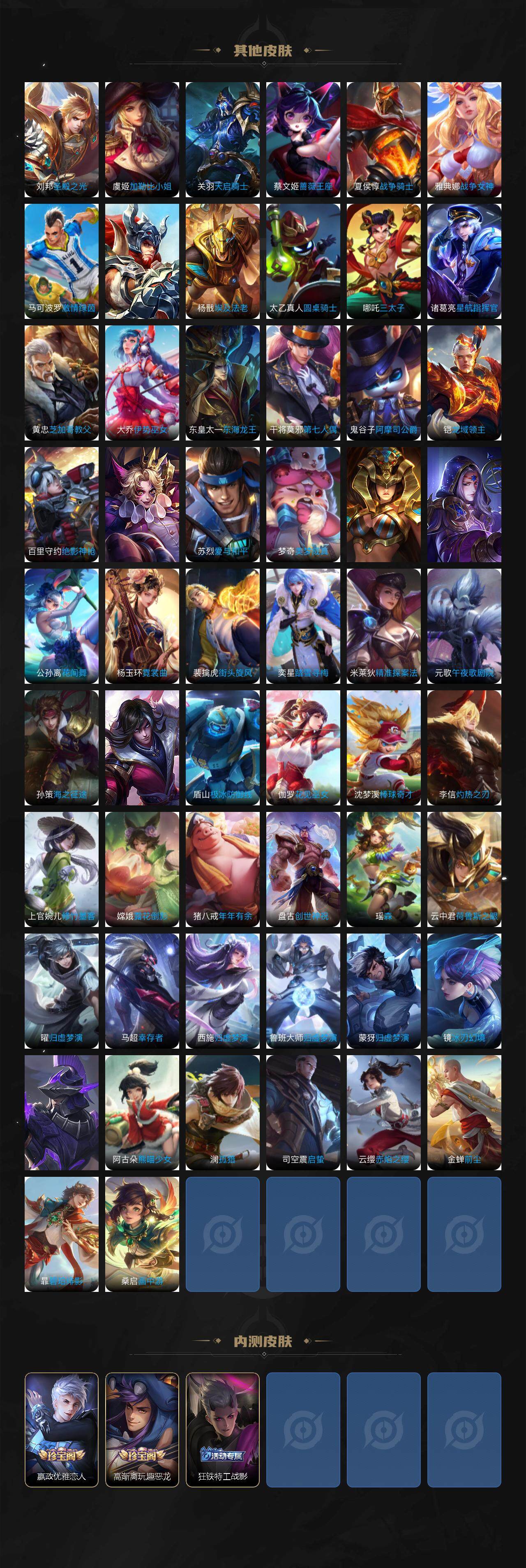 关羽冰锋战神,裴擒虎李小龙,上官婉儿梁祝,牛魔奔雷神使,貂蝉逐梦之音,公孙离祈雪灵祝,吕布御风骁将,诸葛亮时雨天司,赵云龙胆,黄忠烈魂,马超神威,后羿辉光之辰,庄周玄嵩,典韦岱宗,甄姬幽恒,韩信飞衡,伽罗太华,曹操天狼征服者,裴擒虎天狼狩猎者,孙膑天狼运算者,上官婉儿天狼绘梦者,伽罗天狼溯光者,哪吒逐梦之翼,马可波罗逐梦之星,韩信逐梦之影,东皇太一逐梦之光,铠青龙志,百里玄策白虎志,花木兰瑞麟志,苏烈玄武志,百里守约朱雀志,王昭君凤凰于飞,项羽霸王别姬,虞姬霸王别姬,周瑜真爱至上,孙悟空大圣娶亲,露娜一生所爱,花木兰默契交锋,后羿如梦令,嫦娥如梦令,孙悟空至尊宝,裴擒虎梅西,雅典娜神奇女侠,妲己热情桑巴,干将莫邪冰霜恋舞曲,花木兰青春决赛季,蔡文姬奇迹圣诞,妲己时之彼端,公孙离蜜橘之夏,芈月白晶晶,赵云引擎之心,孙悟空美猴王,庄周云端筑梦师,鲁班七号乒乒小将,大乔白鹤梁神女,猪八戒猪悟能,孙尚香异界灵契,孙悟空孙行者,镜匿光追影者,韩信傲雪梅枪