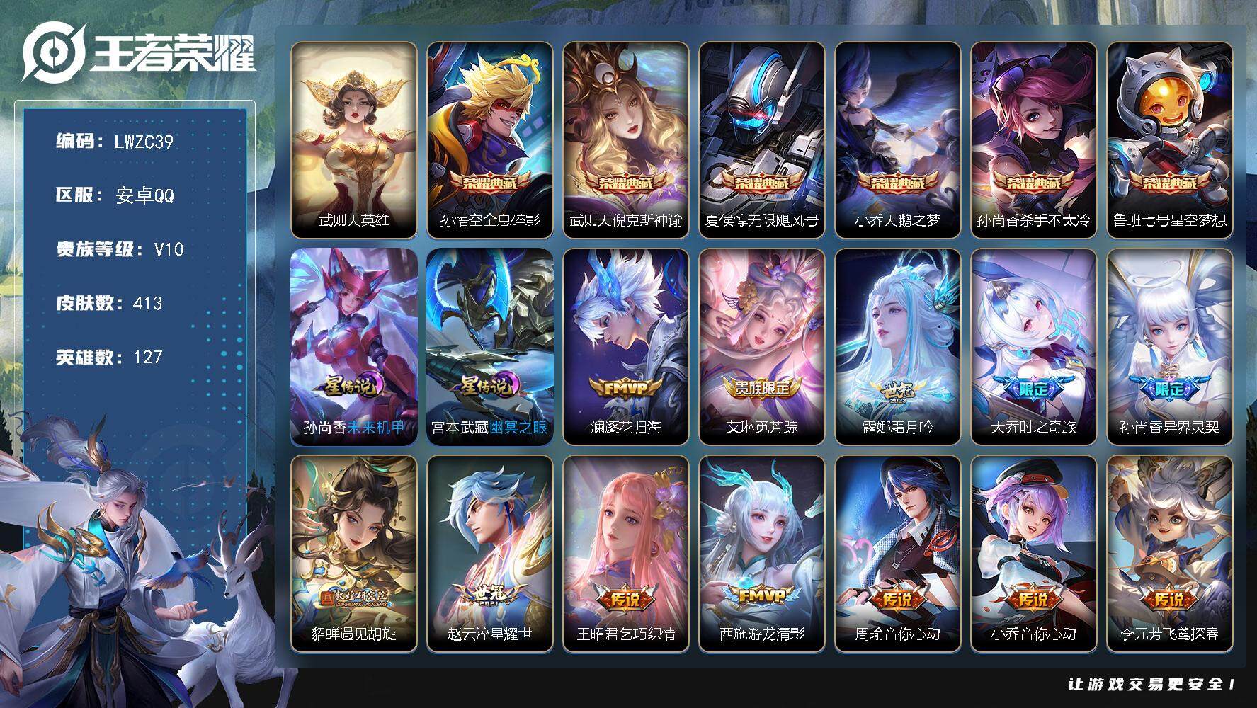 - [15131201]【店主推荐捡漏号!可直接换绑】安卓Q-V5-最强王者段位-125英雄-238皮肤-1典藏-4传说-59史诗 【英雄全皮】:孙权全皮,蒙恬全皮,影全皮 【荣耀典藏】:李白鸣剑曳影 【传说皮肤】:后羿神树通天,桑启鸣野蒿,干将莫邪久胜战神,貂蝉仲夏夜之梦 【限定皮肤】:姜子牙天穹之誓,杨戬破阵退雄兵,狄仁杰阴阳师,赵云皇家上将,孙尚香蔷薇恋人,庄周高山流水,高渐离玩趣恶龙,芈月重明,夏侯惇朔风刀,曹操烛龙,典韦穷奇,狄仁杰万华元夜,达摩沙漠行僧,项羽海滩派对,老夫子醍醐杖,程咬金演武夺筹,兰陵王金庭之子,孙悟空孙行者,牛魔御旌,后羿圣弓游侠,李元芳云中旅人,钟馗驱傩正仪,杨玉环遇见飞天,干将莫邪真爱魔法,雅典娜黎明之约,太乙真人饕餮,鬼谷子原初探秘者,鬼谷子五谷丰年,苏烈千军破阵,百里玄策原初追逐者,弈星混沌棋,梦奇顽趣,沈梦溪大漠名商,明世隐疑决卦,裴擒虎李小龙,裴擒虎擒涛扼浪,狂铁御狮,米莱狄御霄,猪八戒猪悟能,上官婉儿梁祝,嫦娥拒霜思,西施玲珑珍味,鲁班大师探海日志,桑启海盐诗旅,阿古朵江河有灵,张良古海寻踪,蒙犽百解令,蒙恬荣光圣徽,鬼谷子天穹祈灯,刘邦剑破天穹,镜青焰无极,项羽苍威无极,周瑜熔金海岸 【赛季限定】:芈月重明,夏侯惇朔风刀,曹操烛龙,典韦穷奇,狄仁杰万华元夜,达摩沙漠行僧,老夫子醍醐杖,程咬金演武夺筹,兰陵王金庭之子,张良古海寻踪,牛魔御旌,李元芳云中旅人,钟馗驱傩正仪,雅典娜黎明之约,太乙真人饕餮,鬼谷子原初探秘者,苏烈千军破阵,百里玄策原初追逐者,弈星混沌棋,梦奇顽趣,沈梦溪大漠名商,明世隐疑决卦,裴擒虎擒涛扼浪,狂铁御狮,米莱狄御霄,鲁班大师探海日志,桑启海盐诗旅,鬼谷子天穹祈灯,蒙恬荣光圣徽,刘邦剑破天穹,姜子牙天穹之誓 【战令限定】:后羿圣弓游侠,干将莫邪真爱魔法,西施玲珑珍味,镜青焰无极,项羽苍威无极 【史诗皮肤】:露娜紫霞仙子,赵云皇家上将,赵云未来纪元,貂蝉圣诞恋歌,甄姬冰雪圆舞曲,廉颇地狱岩魂,宫本武藏鬼剑武藏,孙尚香蔷薇恋人,孙尚香水果甜心,妲己魅力维加斯,妲己女仆咖啡,墨子龙骑士,吕布圣诞狂欢,刘禅绅士熊喵,曹操幽灵船长,李白千年之狐,吕布末日机甲,张飞乱世虎臣,花木兰水晶猎龙者,夏侯惇乘风破浪,小乔缤纷独角兽,兰陵王暗隐猎兽者,诸葛亮黄金分割率,安琪拉心灵骇客,百里守约特工魅影,铠曙光守护者,蔡文姬舞动绿茵,刘禅天才门将