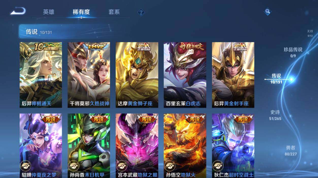 【传说皮肤】:后羿神树通天,干将莫邪久胜战神,达摩黄金狮子座,百里玄策白虎志,后羿黄金射手座,貂蝉仲夏夜之梦,孙尚香末日机甲,宫本武藏地狱之眼,孙悟空地狱火,狄仁杰超时空战士
