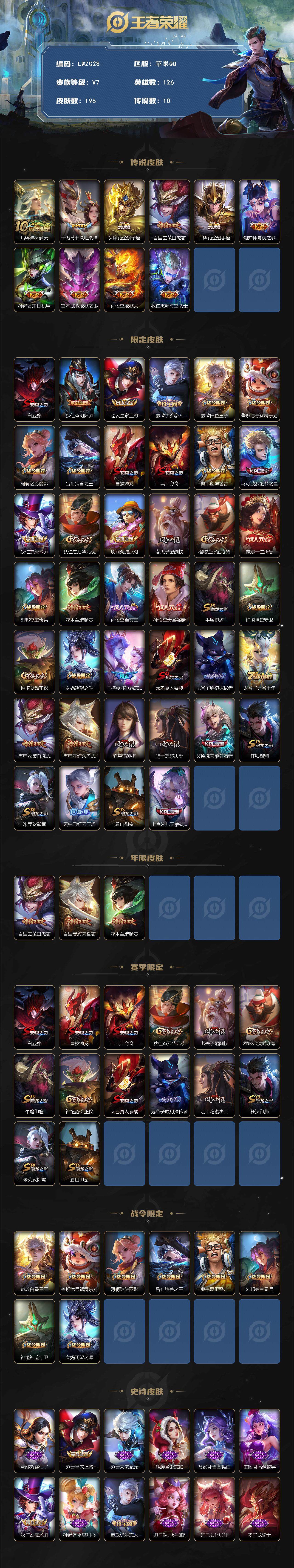- [12037627]【暑期末清货/特价急出/永久包赔】:苹果Q-V10-至尊星耀V段位-125英雄-411皮肤-7典藏-52传说-129史诗【荣耀典藏】:武则天英雄,孙悟空全息碎影,武则天倪克斯神谕,夏侯惇无限飓风号,小乔天鹅之梦,诸葛亮星域神启,貂蝉幻阙歌【传说皮肤】:狄仁杰超时空战士,武则天海洋之心,吕布天魔缭乱,孙尚香末日机甲,李白凤求凰,貂蝉仲夏夜之梦,诸葛亮武陵仙君,杨戬永曜之星,后羿黄金射手座,梦奇胖达荣荣,花木兰冠军飞将,百里玄策白虎志,达摩黄金狮子座,虞姬云霓雀翎,干将莫邪久胜战神,张良黄金白羊座,貂蝉猫影幻舞,伽罗太华,刘备时之恋人,李信一念神魔,曜云鹰飞将,关羽武圣,孙悟空零号赤焰,虞姬启明星使,镜炽阳神光,铠绛天战甲,诸葛亮时雨天司,公孙离祈雪灵祝,兰陵王默契交锋,李元芳飞鸢探春,小乔音你心动,西施游龙清影,王昭君乞巧织情,赵云淬星耀世,貂蝉遇见胡旋,孙尚香异界灵契,鲁班七号寅虎瑞焰,裴擒虎寅虎赤拳,瑶时之祈愿,女娲补天,蔡文姬花朝如约,露娜启示之音,孙策挚爱之约,大乔挚爱花嫁,马超无双飞将,后羿无尽星芒,李信山海炽霜斩,艾琳觅芳踪,桑启鸣野蒿,云缨幻光神枪,虞姬愿照岁时盈,妲己愿照众生和【年限皮肤】:百里玄策白虎志,苏烈玄武志,裴擒虎寅虎赤拳,孙膑寅虎展翼,鲁班七号寅虎瑞焰,杨玉环寅虎心曲,廉颇寅虎御盾,李白凤求凰,杨戬永曜之星,公孙离祈雪灵祝,吕布御风骁将,牛魔奔雷神使,诸葛亮时雨天司,伽罗太华,甄姬幽恒,韩信飞衡,典韦岱宗,庄周玄嵩,马超神威,关羽武圣,黄忠烈魂,张飞虎魄,赵云龙胆,李信山海炽霜斩