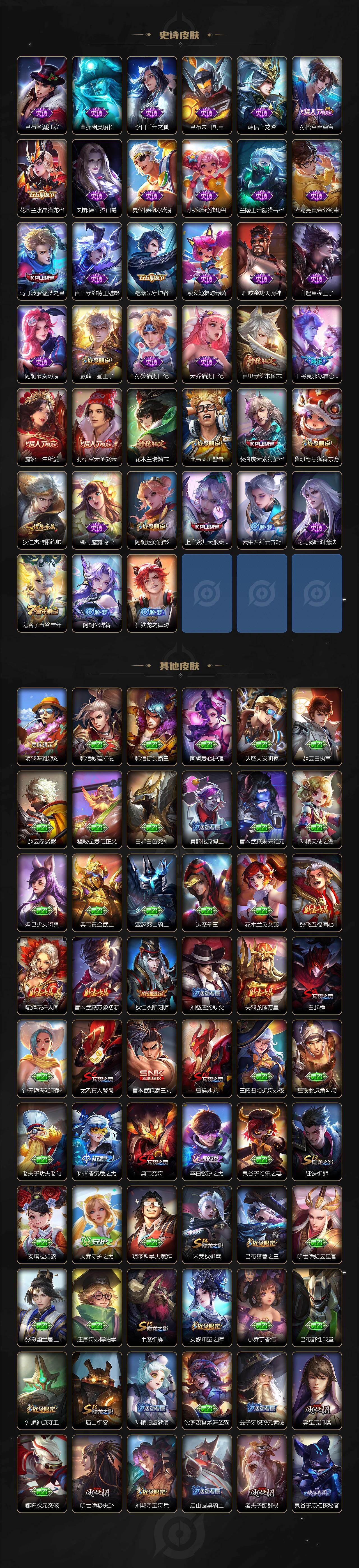 【史诗皮肤】:露娜紫霞仙子,赵云皇家上将,赵云未来纪元,貂蝉圣诞恋歌,甄姬冰雪圆舞曲,王昭君偶像歌手,狄仁杰魔术师,孙尚香水果甜心,嬴政优雅恋人,妲己魅力维加斯,妲己女仆咖啡,墨子龙骑士,吕布圣诞狂欢,曹操幽灵船长,李白千年之狐,吕布末日机甲,韩信白龙吟,孙悟空至尊宝,花木兰水晶猎龙者,刘邦德古拉伯爵,夏侯惇乘风破浪,小乔缤纷独角兽,兰陵王暗隐猎兽者,诸葛亮黄金分割率,马可波罗逐梦之星,百里守约特工魅影,铠曙光守护者,蔡文姬舞动绿茵,程咬金功夫厨神,白起星夜王子,阿轲节奏热浪,嬴政白昼王子,孙策猫狗日记,大乔猫狗日记,百里守约朱雀志,干将莫邪冰霜恋舞曲,露娜一生所爱,孙悟空大圣娶亲,花木兰瑞麟志,典韦蓝屏警告,裴擒虎天狼狩猎者,鲁班七号狮舞东方,狄仁杰鹰眼统帅,娜可露露晚萤