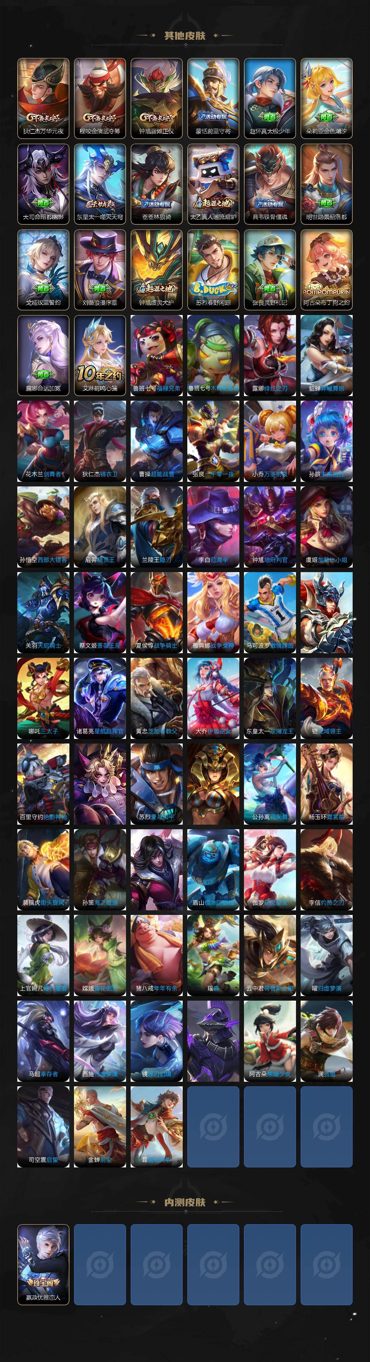 【限定皮肤】:白起狰,狄仁杰阴阳师,赵云皇家上将,嬴政优雅恋人,嬴政白昼王子,鲁班七号狮舞东方,阿轲迷踪丽影,吕布猎兽之王,曹操烛龙,典韦穷奇,典韦蓝屏警告,马可波罗逐梦之星,狄仁杰魔术师,狄仁杰万华元夜,项羽海滩派对,老夫子醍醐杖,程咬金演武夺筹,露娜一生所爱,刘邦夺宝奇兵,花木兰瑞麟志,孙悟空至尊宝,孙悟空大圣娶亲,牛魔御旌,钟馗神迹守卫,钟馗驱傩正仪,女娲朔望之晖,干将莫邪冰霜恋舞曲,太乙真人饕餮,鬼谷子原初探秘者,鬼谷子五谷丰年,百里玄策白虎志,百里守约朱雀志,弈星混沌棋,明世隐疑决卦,裴擒虎天狼狩猎者,狂铁御狮,米莱狄御霄,云中君纤云弄巧,盾山御銮,上官婉儿天狼绘梦者