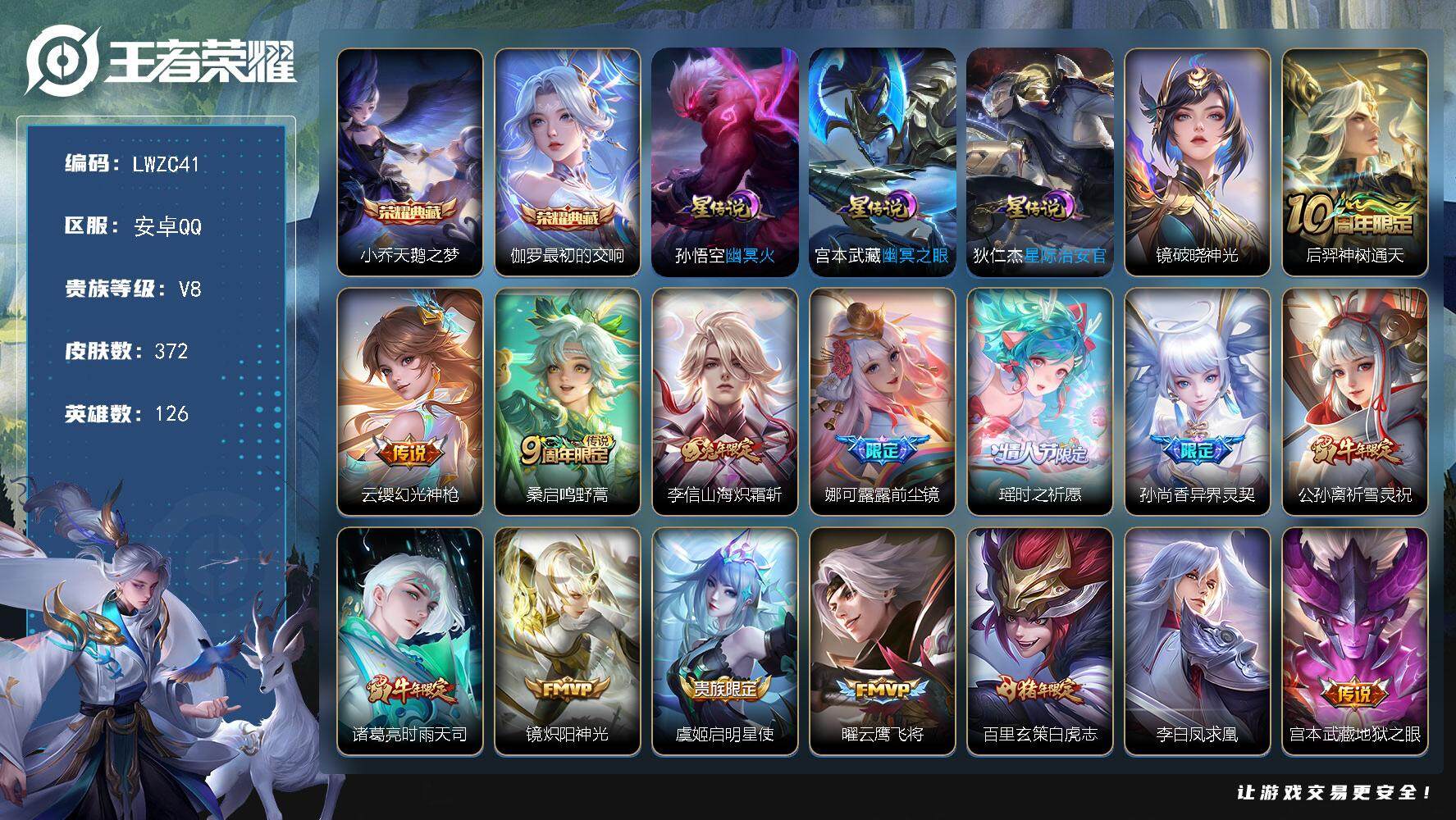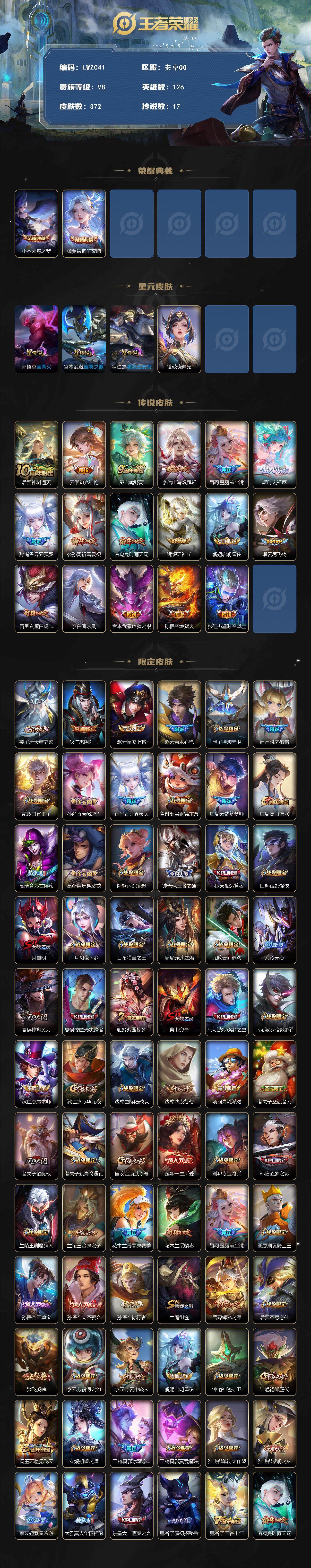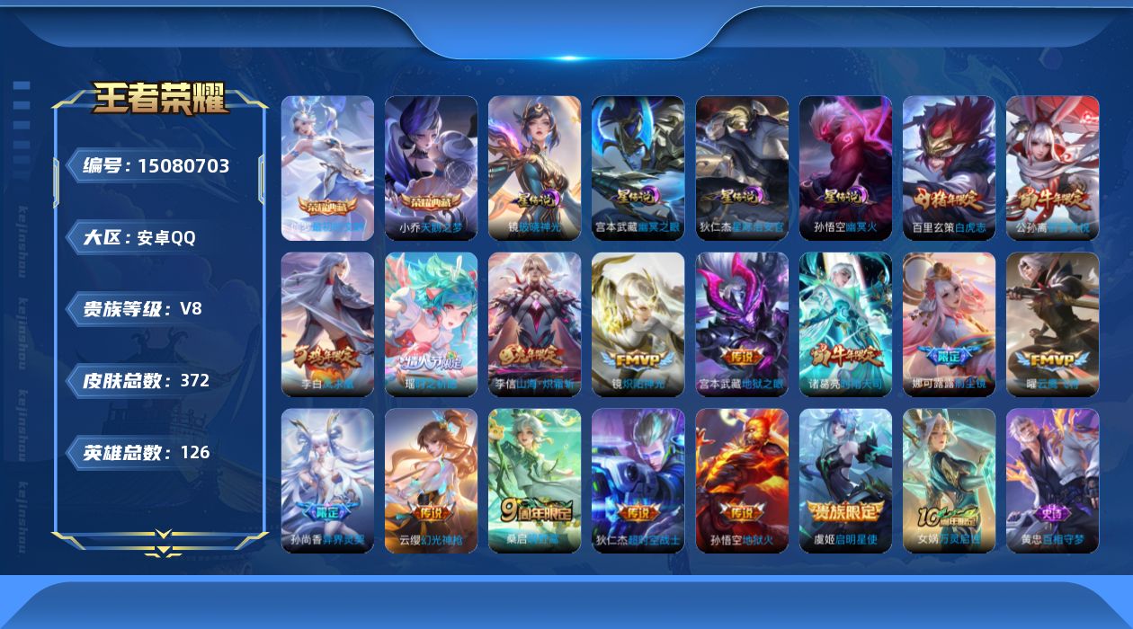- [15633030]安卓Q-V10-最强王者段位-128英雄-423皮肤-12典藏-50传说-142史诗-4星传 【英雄全皮】:元歌全皮,孙权全皮,影全皮 【荣耀典藏】:武则天英雄,孙悟空全息碎影,武则天倪克斯神谕,夏侯惇无限飓风号,小乔天鹅之梦,孙尚香杀手不太冷,鲁班七号星空梦想,芈月大秦宣太后,程咬金活力突击,李白鸣剑曳影,诸葛亮星域神启,花木兰九霄神辉 【传说皮肤】:后羿神树通天,元歌诡秘之主,澜逐花归海,艾琳觅芳踪,蔡文姬花朝如约,女娲补天,孙策末日机甲,瑶时之祈愿,裴擒虎寅虎赤拳,鲁班七号寅虎瑞焰,孙尚香异界灵契,貂蝉遇见胡旋,赵云淬星耀世,王昭君乞巧织情,西施游龙清影,曜李逍遥 ,周瑜音你心动,小乔音你心动,李元芳飞鸢探春,兰陵王默契交锋,公孙离祈雪灵祝,诸葛亮时雨天司,铠绛天战甲,镜炽阳神光,虞姬启明星使,孙悟空零号赤焰,关羽武圣,曜云鹰飞将,李信一念神魔,刘备时之恋人,伽罗太华,貂蝉猫影幻舞,张良黄金白羊座,干将莫邪久胜战神,虞姬云霓雀翎,达摩黄金狮子座,百里玄策白虎志,花木兰冠军飞将,梦奇胖达荣荣,后羿黄金射手座,杨戬永曜之星,诸葛亮武陵仙君,貂蝉仲夏夜之梦,李白凤求凰,孙尚香末日机甲,宫本武藏地狱之眼,孙悟空地狱火,吕布天魔缭乱,武则天海洋之心,狄仁杰超时空战士 【限定皮肤】:白起狰,狄仁杰阴阳师,小乔纯白花嫁,虞姬凯尔特女王,廉颇寅虎御盾,赵云皇家上将,赵云引擎之心,赵云百木心枪,墨子神迹守卫,妲己时之彼端,嬴政优雅恋人,嬴政白昼王子,孙尚香异界灵契,鲁班七号狮舞东方,鲁班七号乒乒小将,鲁班七号寅虎瑞焰,庄周蜃楼王,庄周云端筑梦师,庄周高山流水,高渐离死亡摇滚,钟无艳王者之锤,孙膑妖精王,孙膑天狼运算者,孙膑寅虎展翼,扁鹊炼金王,芈月白晶晶,芈月幻夜卜梦,吕布天魔缭乱,吕布猎兽之王,吕布御风骁将,周瑜真爱至上,周瑜赤莲之焰,元歌云间偶戏,元歌无心,夏侯惇朔风刀,甄姬女儿国国王,甄姬游园惊梦,曹操烛龙,典韦穷奇,典韦蓝屏警告,马可波罗逐梦之星,狄仁杰魔术师,狄仁杰万华元夜,达摩沙漠行僧,项羽海滩派对,项羽霸王别姬,老夫子航海奇遇记,关羽冰锋战神,关羽武圣,貂蝉逐梦之音,貂蝉遇见胡旋,安琪拉魔法小厨娘,露娜一生所爱,韩信逐梦之影,韩信傲雪梅枪,王昭君凤凰于飞,兰陵王默契交锋,兰陵王金庭之子,花木兰青春决赛季,花木兰瑞麟志,花木兰默契交锋,亚瑟潮玩骑士王,孙悟空美猴王