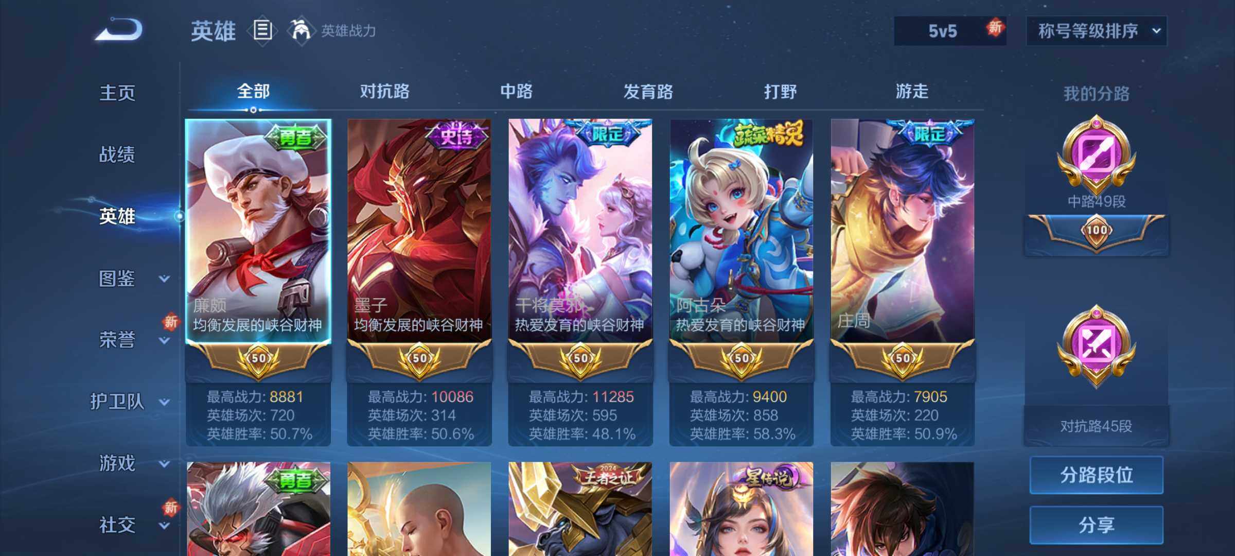 [15080703]可二次【特价出售/店主推荐】万战墨子、万战干将莫邪,中路49段、对抗路45段、打野42段、游走42段、发育路39段,安卓Q-V8-最强王者段位-126英雄-372皮肤-2典藏皮肤-4星传说-17传说-119史诗