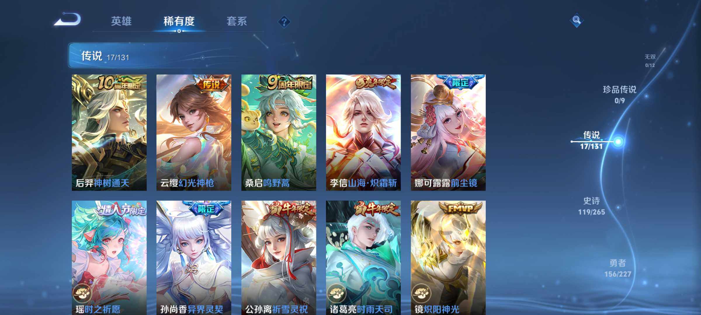 【传说皮肤】:后羿神树通天,云缨幻光神枪,桑启鸣野蒿,李信山海炽霜斩,娜可露露前尘镜,瑶时之祈愿,孙尚香异界灵契,公孙离祈雪灵祝,诸葛亮时雨天司,镜炽阳神光,虞姬启明星使,曜云鹰飞将,百里玄策白虎志,李白凤求凰,宫本武藏地狱之眼,孙悟空地狱火,狄仁杰超时空战士