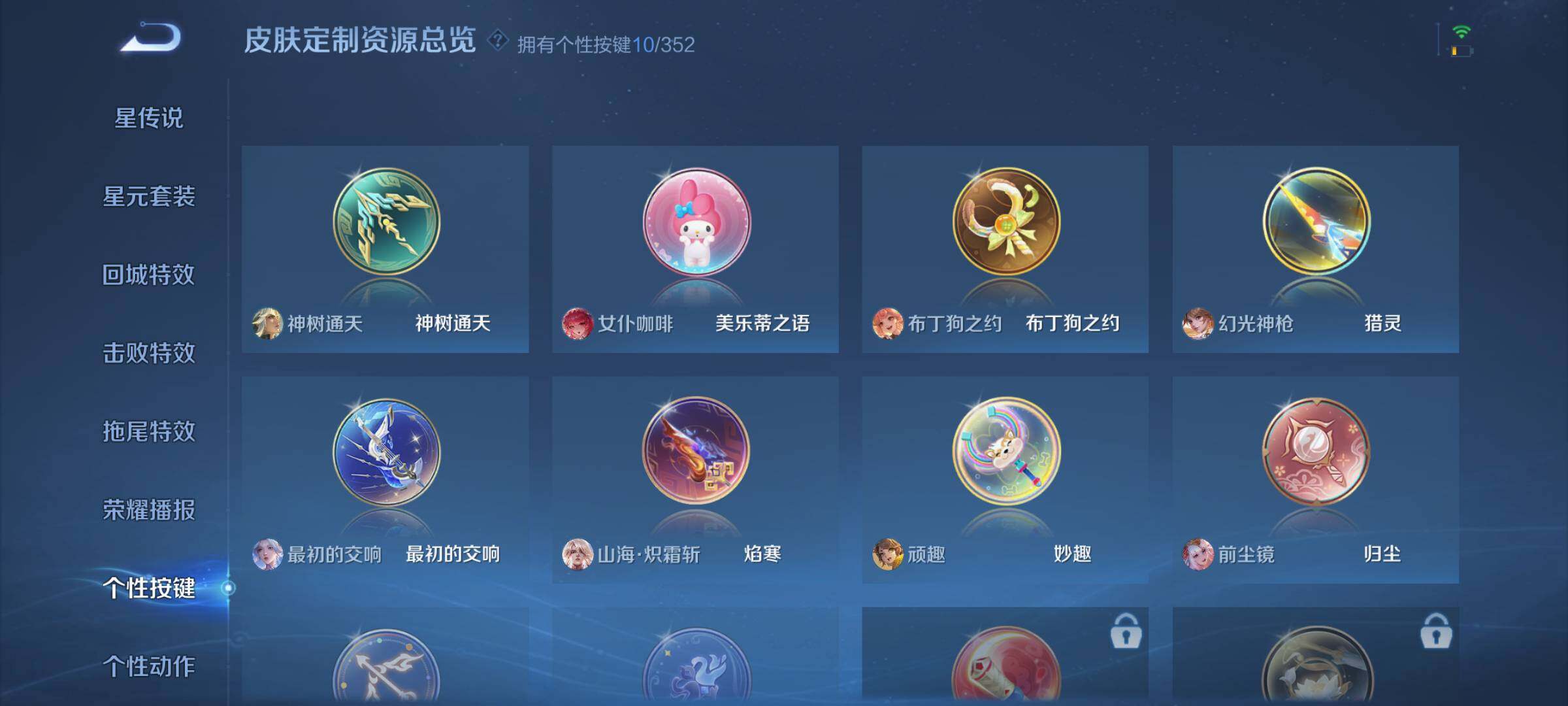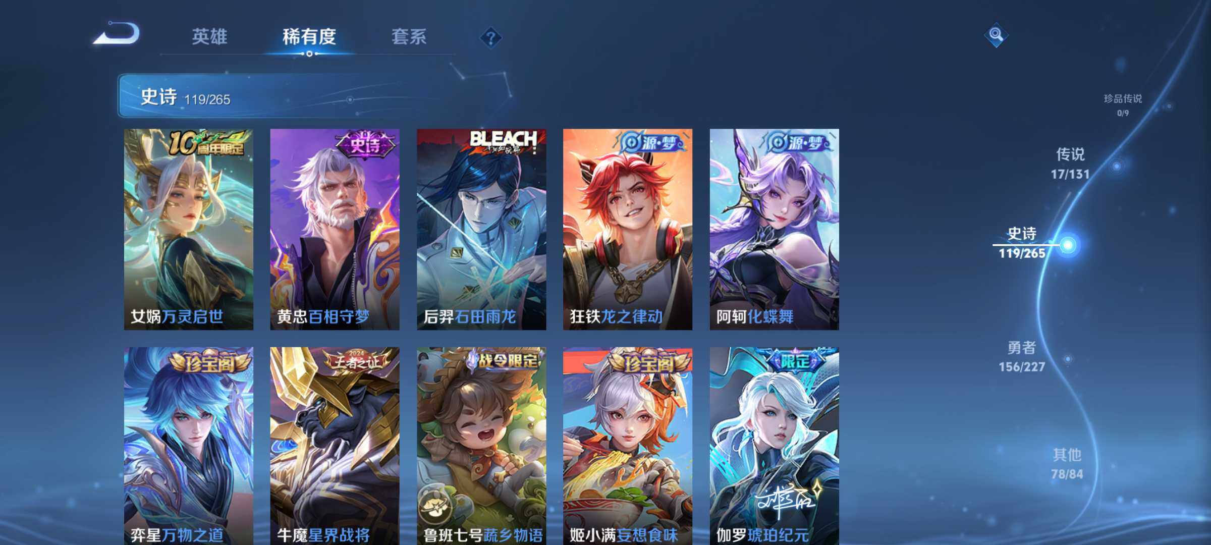 芈月重明,典韦穷奇,狂铁御狮,米莱狄御霄,牛魔御旌,盾山御銮,夏侯惇朔风刀,明世隐疑决卦,老夫子醍醐杖,鬼谷子原初探秘者,狄仁杰万华元夜,程咬金演武夺筹,钟馗驱傩正仪,苏烈千军破阵,吕布猎兽之王,嬴政白昼王子,女娲朔望之晖,钟馗神迹守卫,鲁班七号狮舞东方,沈梦溪星空之诺,李元芳银河之约,刘邦夺宝奇兵,马可波罗暗影游猎,蒙犽狂想玩偶喵,元歌云间偶戏,弈星混沌棋,达摩沙漠行僧,兰陵王金庭之子,沈梦溪大漠名商,李元芳云中旅人,桑启海盐诗旅,裴擒虎擒涛扼浪,鲁班大师探海日志,张良古海寻踪