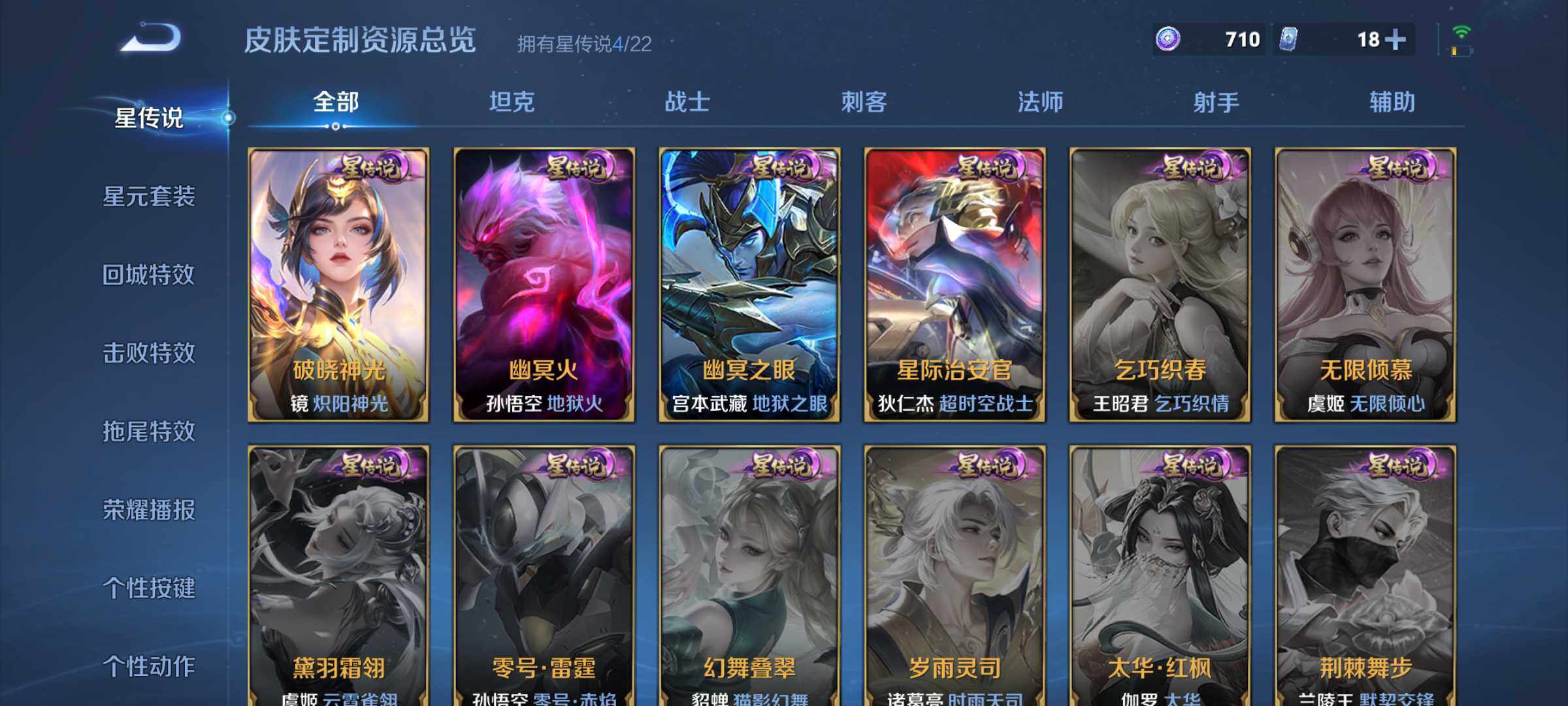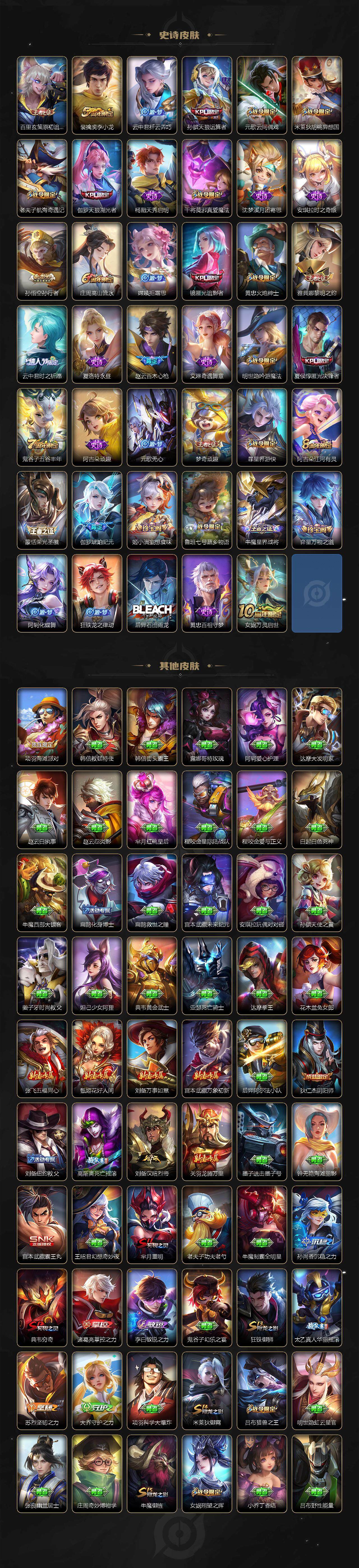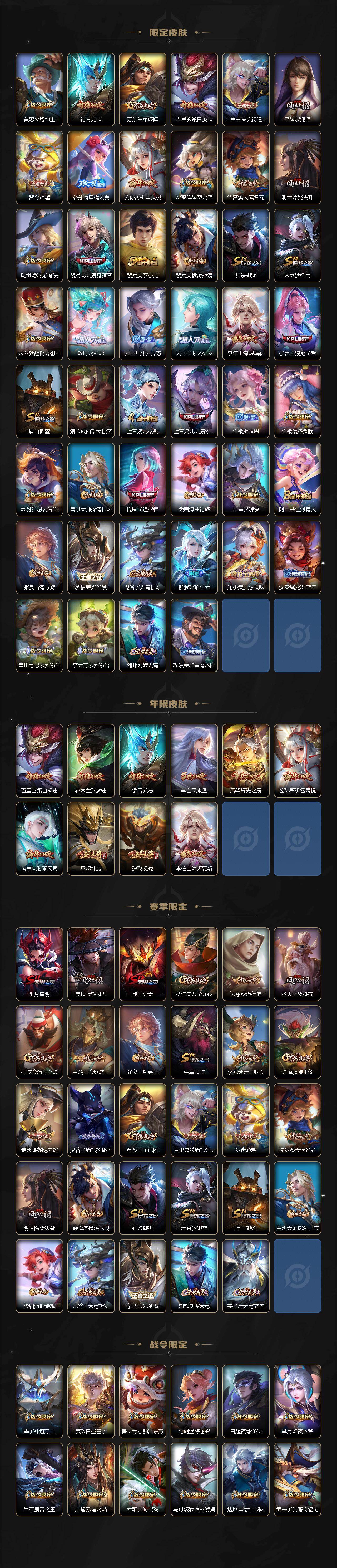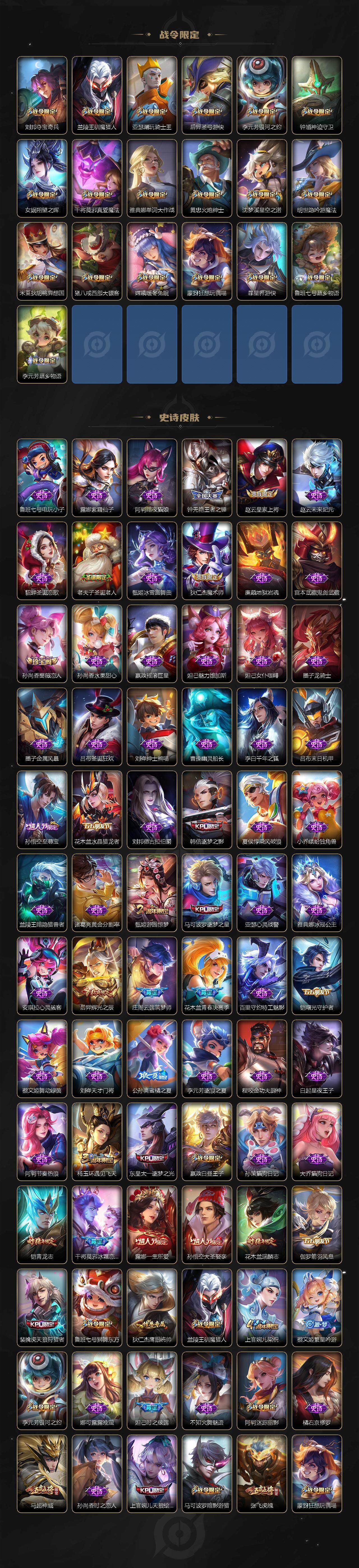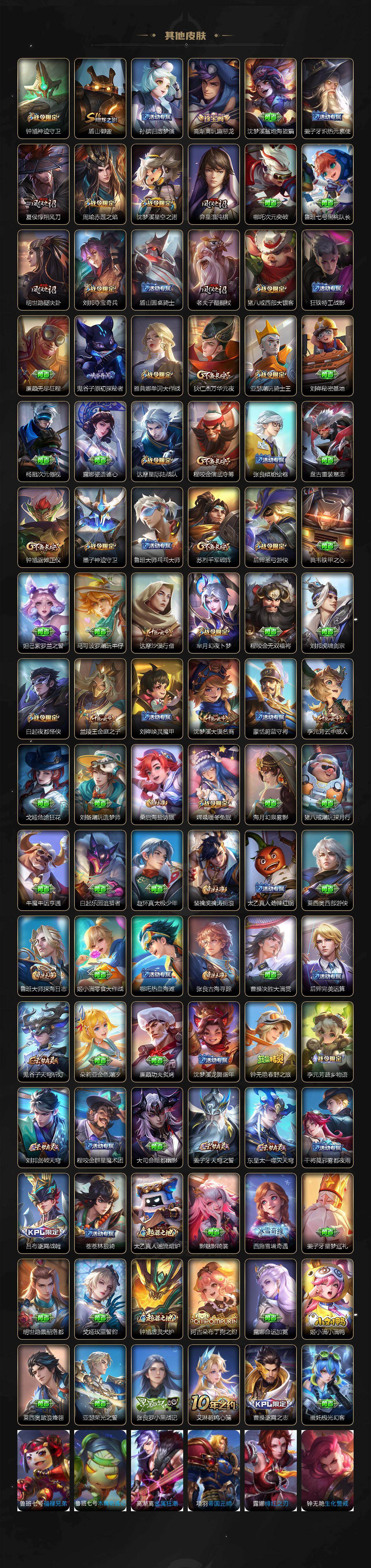 【限定皮肤】:姜子牙天穹之誓,狄仁杰阴阳师,赵云皇家上将,赵云百木心枪,墨子神迹守卫,妲己时之彼端,嬴政白昼王子,孙尚香蔷薇恋人,孙尚香异界灵契,鲁班七号狮舞东方,庄周云端筑梦师,庄周高山流水,高渐离死亡摇滚,高渐离玩趣恶龙,阿轲迷踪丽影,钟无艳王者之锤,孙膑天狼运算者,白起夜都怪侠,芈月重明,芈月幻夜卜梦,吕布猎兽之王,周瑜赤莲之焰,元歌云间偶戏,元歌无心,夏侯惇朔风刀,夏侯惇匿光决锋者,甄姬游园惊梦,典韦穷奇,马可波罗逐梦之星,马可波罗暗影游猎,狄仁杰魔术师,狄仁杰万华元夜,达摩星际陆战队,达摩沙漠行僧,项羽海滩派对,老夫子圣诞老人,老夫子醍醐杖,老夫子航海奇遇记,程咬金演武夺筹,露娜一生所爱,刘邦夺宝奇兵,韩信逐梦之影,兰陵王驯魔猎人,兰陵王金庭之子,花木兰青春决赛季,花木兰瑞麟志,娜可露露前尘镜,亚瑟潮玩骑士王,孙悟空至尊宝,孙悟空大圣娶亲,孙悟空孙行者,牛魔御旌,后羿辉光之辰,后羿圣弓游侠,张飞虎魄,李元芳银河之约,李元芳云中旅人,虞姬启明星使,钟馗神迹守卫,钟馗驱傩正仪,杨玉环遇见飞天,女娲朔望之晖,干将莫邪冰霜恋舞曲,干将莫邪真爱魔法,雅典娜单词大作战,雅典娜黎明之约,蔡文姬繁星吟游,太乙真人华丽摇滚,东皇太一逐梦之光,鬼谷子原初探秘者,鬼谷子五谷丰年,诸葛亮时雨天司,黄忠火炮绅士,铠青龙志,苏烈千军破阵,百里玄策白虎志,百里玄策原初追逐者,弈星混沌棋,梦奇顽趣,公孙离蜜橘之夏,公孙离祈雪灵祝,沈梦溪星空之诺,沈梦溪大漠名商,明世隐疑决卦,明世隐吟游魔法,裴擒虎天狼狩猎者,裴擒虎李小龙,裴擒虎擒涛扼浪,狂铁御狮,米莱狄御霄,米莱狄胡桃异想国,瑶时之祈愿,云中君纤云弄巧,云中君