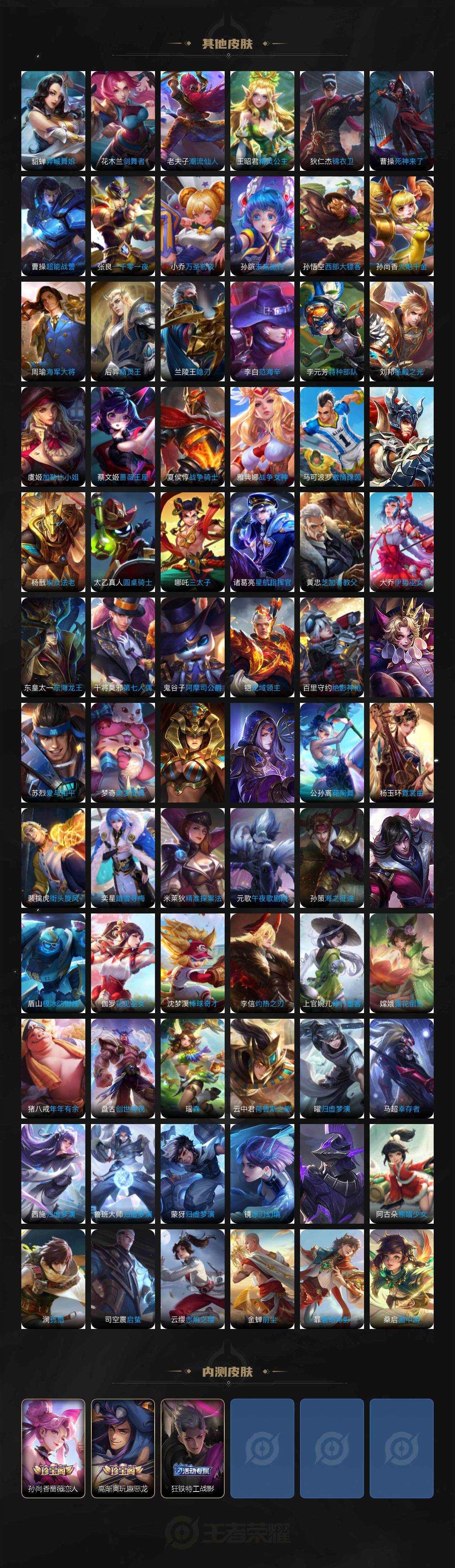 裴擒虎李小龙,上官婉儿梁祝,公孙离祈雪灵祝,诸葛亮时雨天司,张飞虎魄,马超神威,后羿辉光之辰,裴擒虎天狼狩猎者,孙膑天狼运算者,上官婉儿天狼绘梦者,伽罗天狼溯光者,马可波罗逐梦之星,韩信逐梦之影,东皇太一逐梦之光,铠青龙志,百里玄策白虎志,花木兰瑞麟志,孙悟空大圣娶亲,露娜一生所爱,孙悟空至尊宝,干将莫邪冰霜恋舞曲,花木兰青春决赛季,妲己时之彼端,公孙离蜜橘之夏,庄周云端筑梦师,孙尚香异界灵契,老夫子圣诞老人,孙悟空孙行者,镜匿光追影者,云中君时之祈愿,瑶时之祈愿,赵云百木心枪,夏侯惇匿光决锋者,娜可露露前尘镜,桑启鸣野蒿