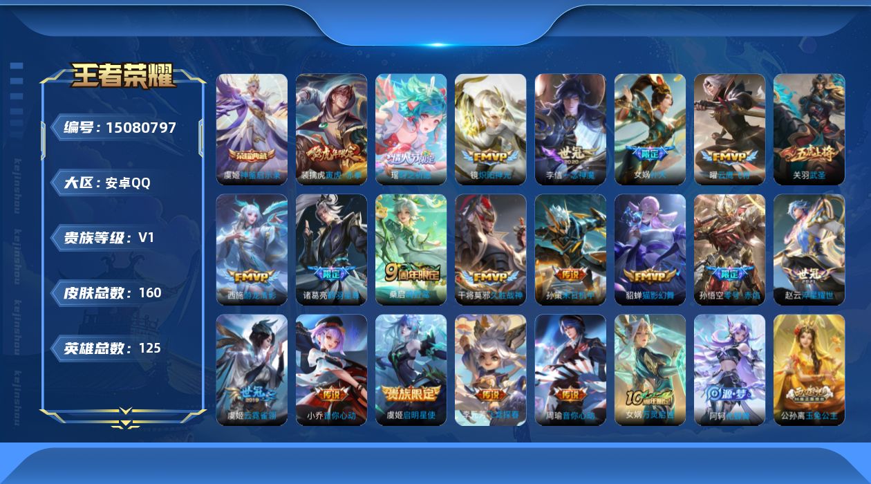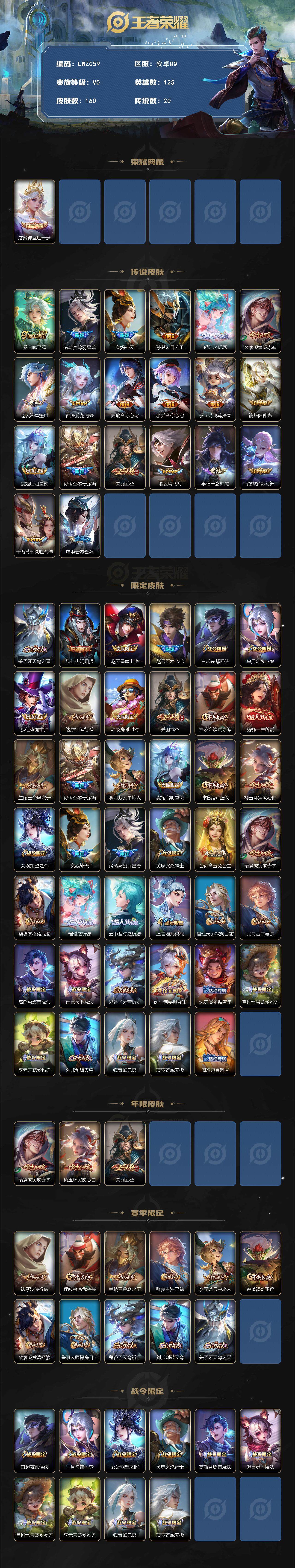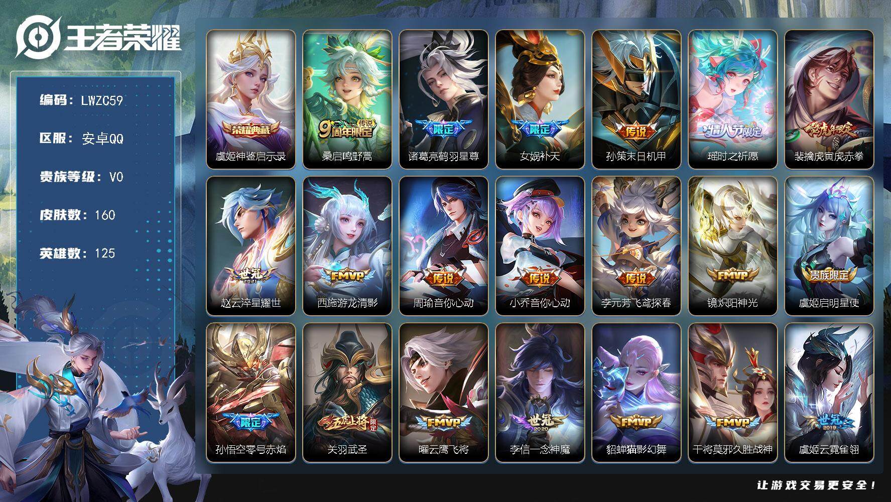 [15080797]【店主推荐捡漏号!可直接换绑】安卓Q-V8-至尊星耀IV段位-125英雄-160皮肤-1典藏皮肤-20传说-52史诗 【荣耀典藏】:虞姬神鉴启示录 【传说皮肤】:桑启鸣野蒿,诸葛亮鹤羽星尊,女娲补天,孙策末日机甲,瑶时之祈愿,裴擒虎寅虎赤拳,赵云淬星耀世,西施游龙清影,周瑜音你心动,小乔音你心动,李元芳飞鸢探春,镜炽阳神光,虞姬启明星使,孙悟空零号赤焰,关羽武圣,曜云鹰飞将,李信一念神魔,貂蝉猫影幻舞,干将莫邪久胜战神,虞姬云霓雀翎 【限定皮肤】:姜子牙天穹之誓,狄仁杰阴阳师,赵云皇家上将,赵云百木心枪,白起夜都怪侠,芈月幻夜卜梦,狄仁杰魔术师,达摩沙漠行僧,项羽海滩派对,关羽武圣,程咬金演武夺筹,露娜一生所爱,兰陵王金庭之子,孙悟空零号赤焰,李元芳云中旅人,虞姬启明星使,钟馗驱傩正仪,杨玉环寅虎心曲,女娲朔望之晖,女娲补天,诸葛亮鹤羽星尊,黄忠火炮绅士,公孙离玉兔公主,裴擒虎寅虎赤拳,裴擒虎擒涛扼浪,瑶时之祈愿,云中君时之祈愿,上官婉儿梁祝,鲁班大师探海日志,张良古海寻踪,高渐离燃音魔法,妲己灵卜魔法,鬼谷子天穹祈灯,姬小满妄想食味,沈梦溪龙舞盛年,鲁班七号蔬乡物语,李元芳蔬乡物语,刘邦剑破天穹,镜青焰无极,项羽苍威无极,周瑜熔金海岸 【年限皮肤】:裴擒虎寅虎赤拳,杨玉环寅虎心曲,关羽武圣 【赛季限定】:达摩沙漠行僧,程咬金演武夺筹,兰陵王金庭之子,张良古海寻踪,李元芳云中旅人,钟馗驱傩正仪,裴擒虎擒涛扼浪,鲁班大师探海日志,鬼谷子天穹祈灯,刘邦剑破天穹,姜子牙天穹之誓 【战令限定】:白起夜都怪侠,芈月幻夜卜梦,女娲朔望之晖,黄忠火炮绅士,高渐离燃音魔法,妲己灵卜魔法,鲁班七号蔬乡物语,李元芳蔬乡物语,镜青焰无极,项羽苍威无极 【史诗皮肤】:露娜紫霞仙子,赵云皇家上将,赵云未来纪元,甄姬冰雪圆舞曲,狄仁杰魔术师,宫本武藏鬼剑武藏,孙尚香水果甜心,妲己女仆咖啡,墨子金属风暴,吕布圣诞狂欢,曹操幽灵船长,李白千年之狐,吕布末日机甲,张飞乱世虎臣,花木兰水晶猎龙者,刘邦德古拉伯爵,夏侯惇乘风破浪,兰陵王暗隐猎兽者,诸葛亮黄金分割率,百里守约特工魅影,铠曙光守护者,程咬金功夫厨神,白起星夜王子,阿轲节奏热浪,孙策猫狗日记,大乔猫狗日记,露娜一生所爱,伽罗箭羽风息,狄仁杰鹰眼统帅,公孙离无限星赏官,上官婉儿梁祝,娜可露露晚萤,大乔白蛇,不知火舞魅语,橘右京修罗,孙尚香时之
