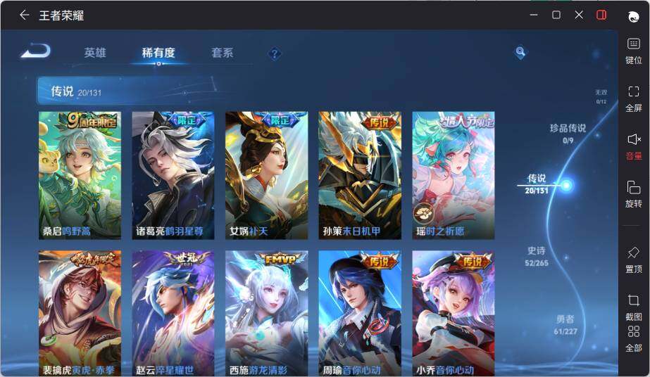 【传说皮肤】:桑启鸣野蒿,诸葛亮鹤羽星尊,女娲补天,孙策末日机甲,瑶时之祈愿,裴擒虎寅虎赤拳,赵云淬星耀世,西施游龙清影,周瑜音你心动,小乔音你心动,李元芳飞鸢探春,镜炽阳神光,虞姬启明星使,孙悟空零号赤焰,关羽武圣,曜云鹰飞将,李信一念神魔,貂蝉猫影幻舞,干将莫邪久胜战神,虞姬云霓雀翎