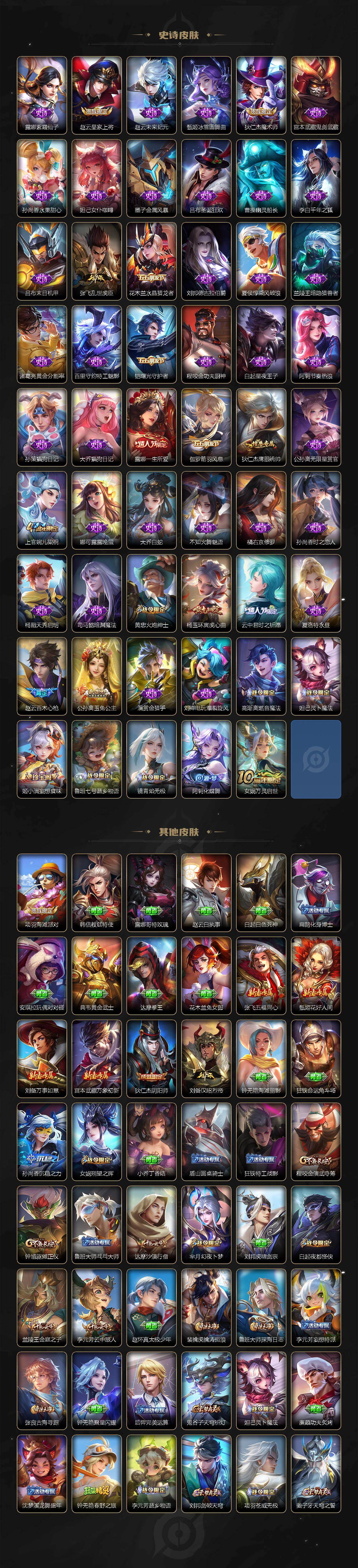 【史诗皮肤】:露娜紫霞仙子,赵云皇家上将,赵云未来纪元,甄姬冰雪圆舞曲,狄仁杰魔术师,宫本武藏鬼剑武藏,孙尚香水果甜心,妲己女仆咖啡,墨子金属风暴,吕布圣诞狂欢,曹操幽灵船长,李白千年之狐,吕布末日机甲,张飞乱世虎臣,花木兰水晶猎龙者,刘邦德古拉伯爵,夏侯惇乘风破浪,兰陵王暗隐猎兽者,诸葛亮黄金分割率,百里守约特工魅影,铠曙光守护者,程咬金功夫厨神,白起星夜王子,阿轲节奏热浪,孙策猫狗日记,大乔猫狗日记,露娜一生所爱,伽罗箭羽风息,狄仁杰鹰眼统帅,公孙离无限星赏官,上官婉儿梁祝,娜可露露晚萤,大乔白蛇,不知火舞魅语,橘右京修罗,孙尚香时之