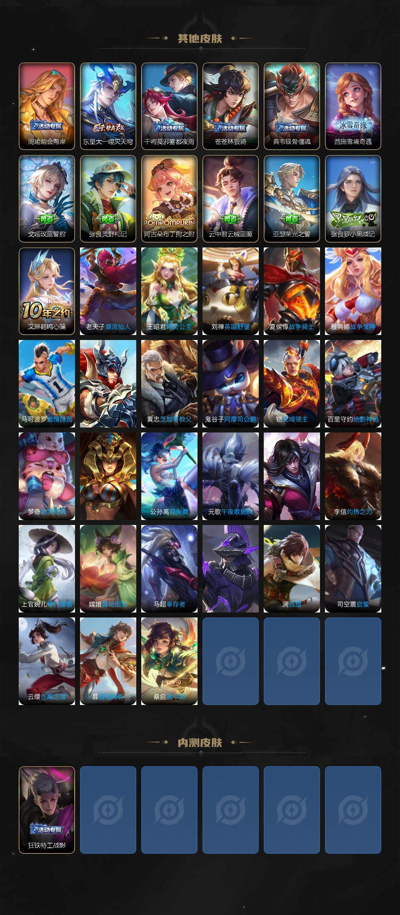 【限定皮肤】:姜子牙天穹之誓,狄仁杰阴阳师,赵云皇家上将,赵云百木心枪,白起夜都怪侠,芈月幻夜卜梦,狄仁杰魔术师,达摩沙漠行僧,项羽海滩派对,关羽武圣,程咬金演武夺筹,露娜一生所爱,兰陵王金庭之子,孙悟空零号赤焰,李元芳云中旅人,虞姬启明星使,钟馗驱傩正仪,杨玉环寅虎心曲,女娲朔望之晖,女娲补天,诸葛亮鹤羽星尊,黄忠火炮绅士,公孙离玉兔公主,裴擒虎寅虎赤拳,裴擒虎擒涛扼浪,瑶时之祈愿,云中君时之祈愿,上官婉儿梁祝,鲁班大师探海日志,张良古海寻踪,高渐离燃音魔法,妲己灵卜魔法,鬼谷子天穹祈灯,姬小满妄想食味,沈梦溪龙舞盛年,鲁班七号蔬乡物语,李元芳蔬乡物语,刘邦剑破天穹,镜青焰无极,项羽苍威无极,周瑜熔金海岸