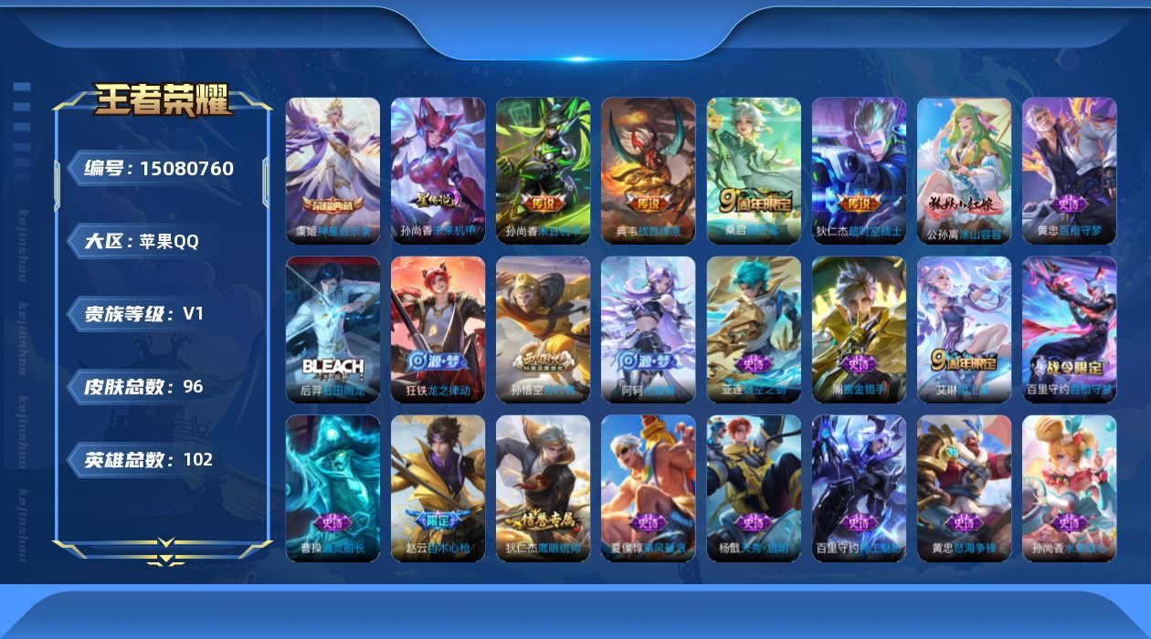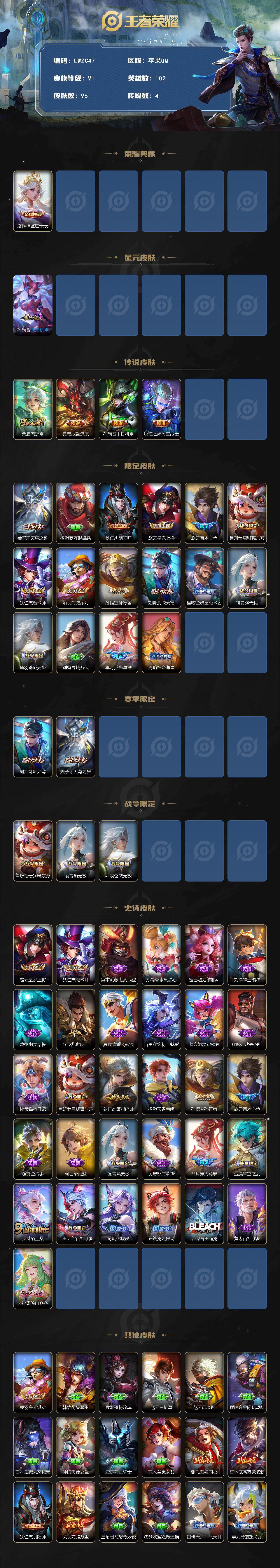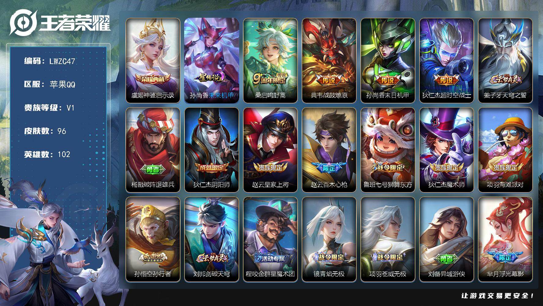 [15080760]可二次【特价出售/店主推荐/4市标】:苹果Q-V6-最强王者段位-102英雄-96皮肤-1典藏皮肤-1星元-4传说-31史诗
