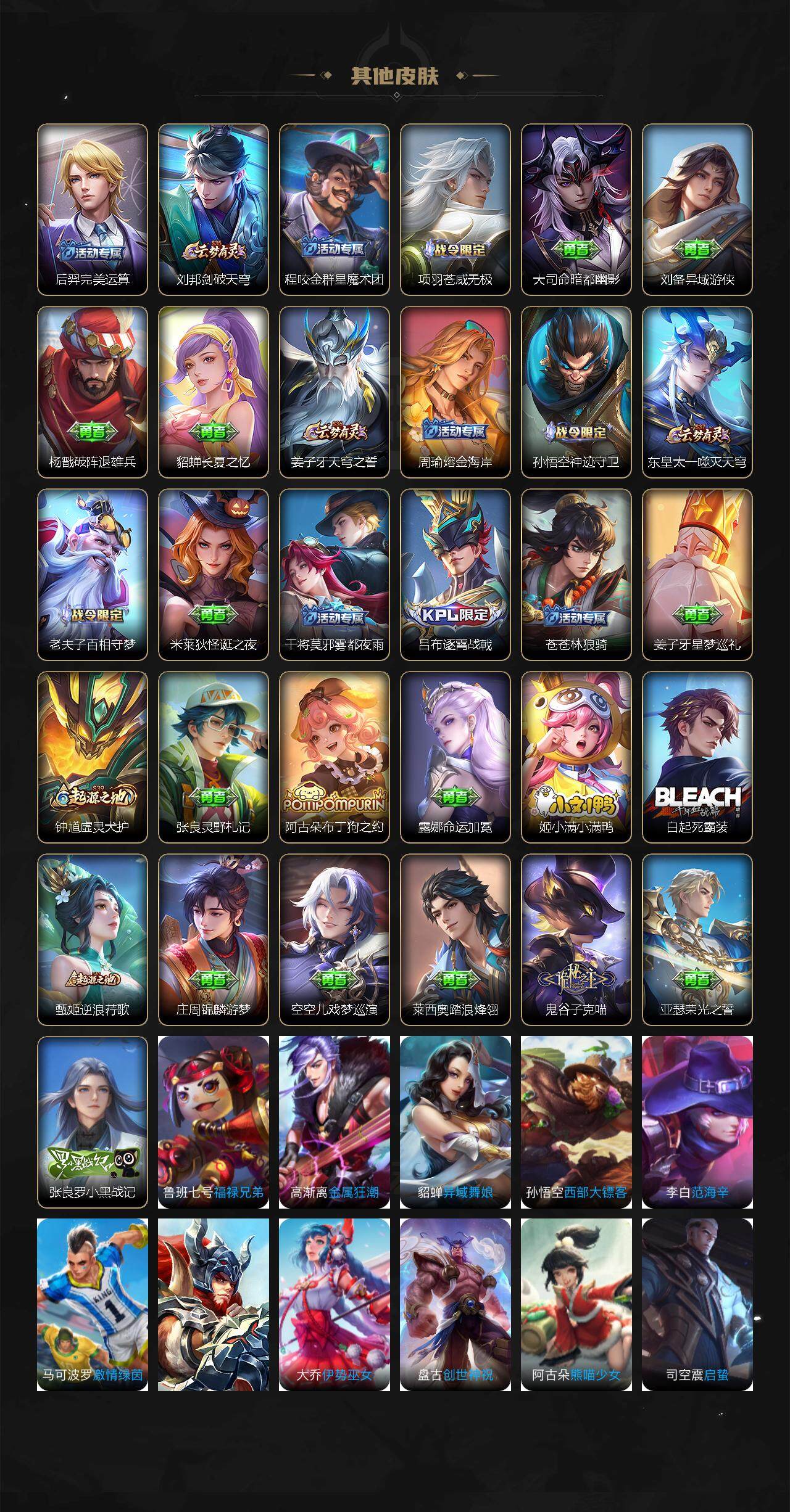 【其他皮肤】:项羽海滩派对,韩信街头霸王,露娜哥特玫瑰,赵云白执事,赵云忍炎影,程咬金星际陆战队,宫本武藏未来纪元,孙膑天使之翼,亚瑟死亡骑士,花木兰兔女郎,张飞五福同心,宫本武藏万象初新,狄仁杰阴阳师,关羽龙腾万里,王昭君幻想奇妙夜,沈梦溪鲨炮海盗猫,鲁班大师乓乓大师,李元芳妄想特派,后羿完美运算,刘邦剑破天穹,程咬金群星魔术团,项羽苍威无极,大司命暗都幽影,刘备异域游侠,杨戬破阵退雄兵,貂蝉长夏之忆,姜子牙天穹之誓,周瑜熔金海岸,孙悟空神迹守卫,东皇太一噬灭天穹,老夫子百相守梦,米莱狄怪诞之夜,干将莫邪雾都夜雨,吕布逐霄战戟,苍苍林狼骑,姜子牙星梦巡礼,钟馗虚灵犬护,张良灵野札记,阿古朵布丁狗之约,露娜命运加冕,姬小满小满鸭,白起死霸装,甄姬逆浪荇歌,庄周锦麟游梦,空空儿戏梦巡演,莱西奥踏浪烽翎,鬼谷子克喵,亚瑟荣光之誓,张良罗小黑战记,鲁班七号福禄兄弟,高渐离金属狂潮,貂蝉异域舞娘,孙悟空西部大镖客,李白范海辛,马可波罗激情绿茵,苍维京掠夺者,大乔伊势巫女,盘古创世神祝,阿古朵熊喵少女,司空震启蛰
