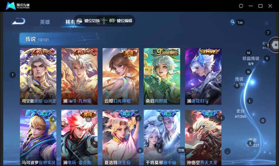 【传说皮肤】:司空震愿照山河定,澜愿照九州拓,云缨幻光神枪,桑启鸣野蒿,澜逐花归海,马可波罗妄想实况,澜电玩雷克斯,夏洛特浮生妄,干将莫邪画中仙,孙悟空齐天大圣,曜云鹰飞将,李信一念神魔,干将莫邪久胜战神
