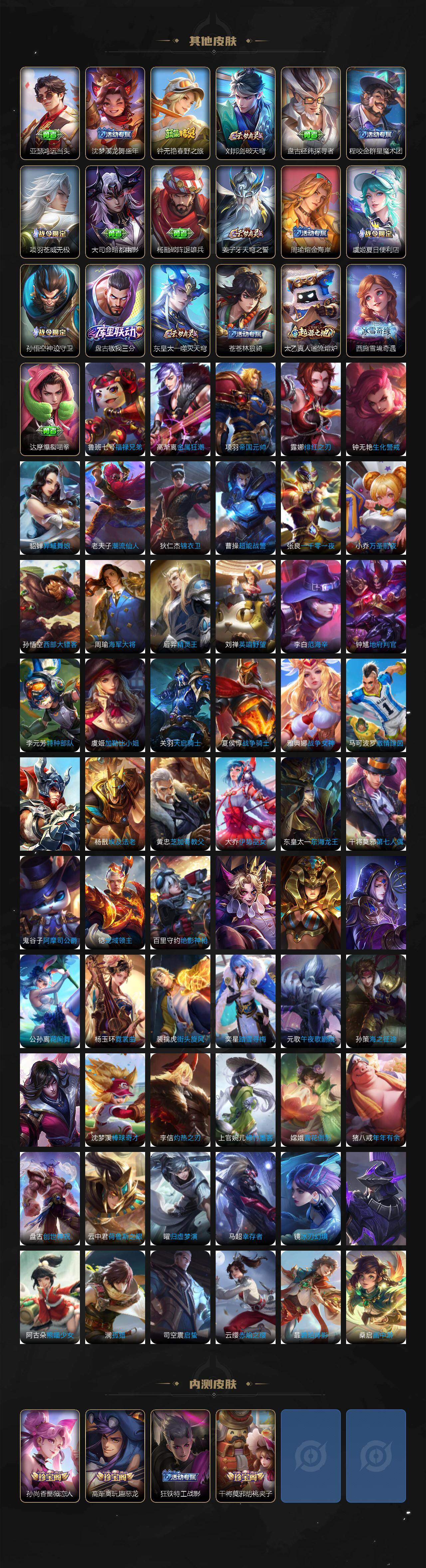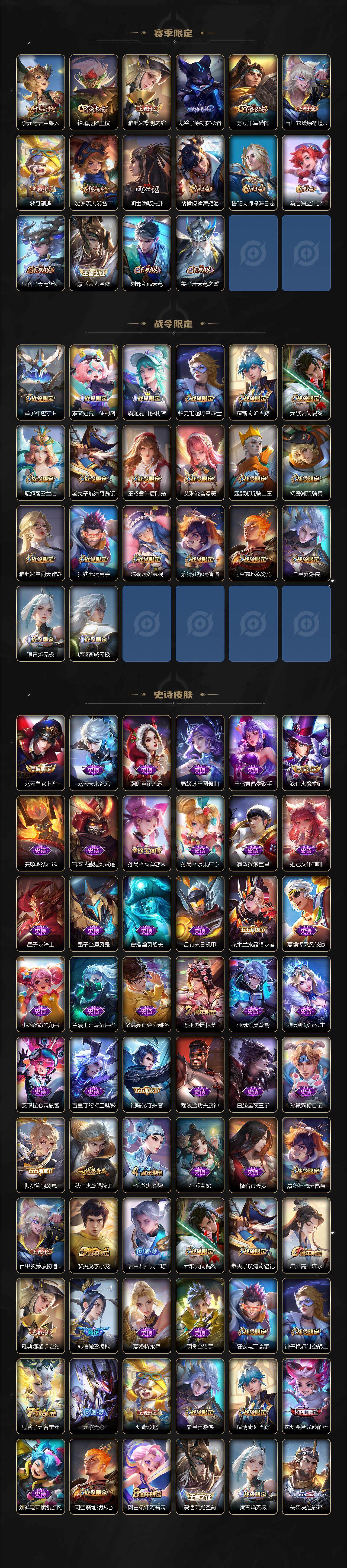 【限定皮肤】:蒙犽顽岩魄,蔡文姬夏日便利店,虞姬夏日便利店,姜子牙天穹之誓,杨戬破阵退雄兵,狄仁杰阴阳师,赵云皇家上将,墨子神迹守卫,孙尚香蔷薇恋人,庄周高山流水,高渐离玩趣恶龙,钟无艳超时空战士,扁鹊奇幻香踪,元歌云间偶戏,元歌无心,甄姬游园惊梦,甄姬落雪兰心,马可波罗妄想实况,狄仁杰魔术师,狄仁杰万华元夜,达摩沙漠行僧,项羽海滩派对,老夫子醍醐杖,老夫子航海奇遇记,程咬金演武夺筹,韩信傲雪梅枪,王昭君午后时光,兰陵王金庭之子,亚瑟潮玩骑士王,孙悟空齐天大圣,李元芳云中旅人,钟馗驱傩正仪,杨戬潮玩骑兵,干将莫邪胡桃夹子,干将莫邪画中仙,雅典娜单词大作战,雅典娜黎明之约,鬼谷子原初探秘者,鬼谷子五谷丰年,苏烈千军破阵,百里玄策原初追逐者,梦奇顽趣,沈梦溪大漠名商,沈梦溪匿光破解者,明世隐疑决卦,裴擒虎李小龙,裴擒虎擒涛扼浪,狂铁电玩高手,云中君纤云弄巧,上官婉儿梁祝,嫦娥暖冬兔眠,蒙犽狂想玩偶喵,鲁班大师探海日志,桑启海盐诗旅,夏洛特浮生妄,暃星界游侠,艾琳流音漫舞,司空震地狱燃心,阿古朵江河有灵,张良古海寻踪,蒙恬荣光圣徽,鬼谷子天穹祈灯,沈梦溪龙舞盛年,刘邦剑破天穹,程咬金群星魔术团,关羽决胜骁骑,镜青焰无极,项羽苍威无极,周瑜熔金海岸