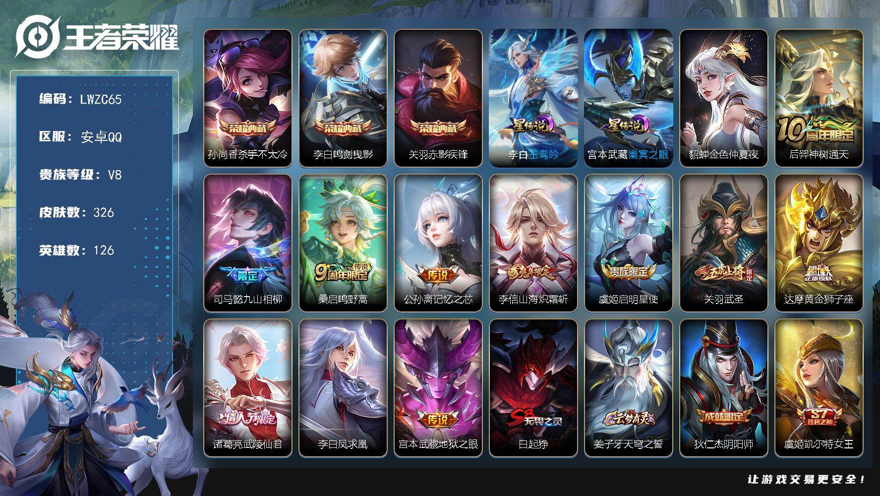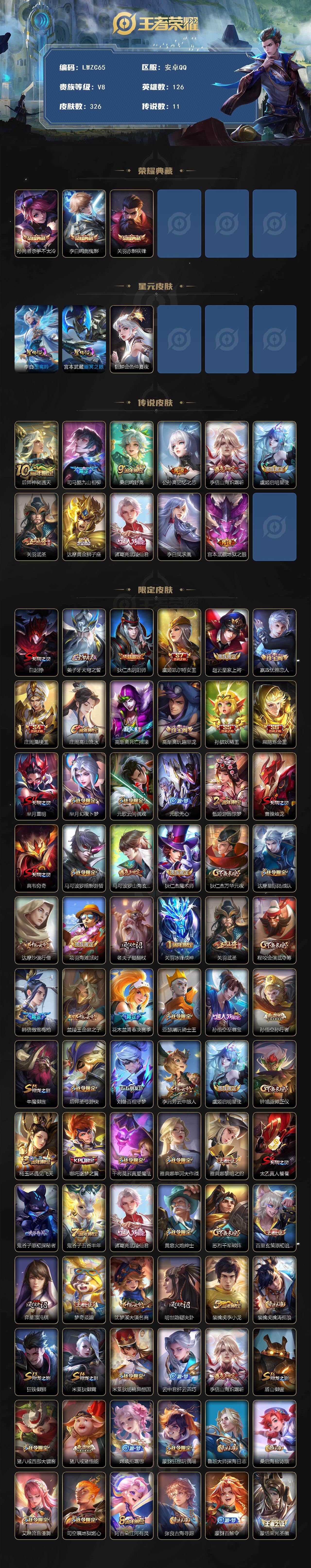 [15080816]【店主推荐捡漏号!可直接换绑】安卓Q-V8-最强王者段位39段对抗路小国标哪吒-126英雄-326皮肤-3典藏皮肤-11传说-85史诗-3星元 【英雄全皮】:孙权全皮,蒙恬全皮,空空儿全皮 【荣耀典藏】:孙尚香杀手不太冷,李白鸣剑曳影,关羽赤影疾锋 【传说皮肤】:后羿神树通天,司马懿九山相柳,桑启鸣野蒿,公孙离记忆之芯,李信山海炽霜斩,虞姬启明星使,关羽武圣,达摩黄金狮子座,诸葛亮武陵仙君,李白凤求凰,宫本武藏地狱之眼 【限定皮肤】:白起狰,姜子牙天穹之誓,狄仁杰阴阳师,虞姬凯尔特女王,赵云皇家上将,嬴政优雅恋人,庄周蜃楼王,庄周高山流水,高渐离死亡摇滚,高渐离玩趣恶龙,孙膑妖精王,扁鹊炼金王,芈月重明,芈月幻夜卜梦,元歌云间偶戏,元歌无心,甄姬游园惊梦,曹操烛龙,典韦穷奇,马可波罗暗影游猎,马可波罗山海玄木吟,狄仁杰魔术师,狄仁杰万华元夜,达摩星际陆战队,达摩沙漠行僧,项羽海滩派对,老夫子醍醐杖,关羽冰锋战神,关羽武圣,程咬金演武夺筹,韩信傲雪梅枪,兰陵王金庭之子,花木兰青春决赛季,亚瑟潮玩骑士王,孙悟空至尊宝,孙悟空孙行者,牛魔御旌,后羿圣弓游侠,刘备百相守梦,李元芳云中旅人,虞姬启明星使,钟馗驱傩正仪,杨玉环遇见飞天,哪吒逐梦之翼,干将莫邪真爱魔法,雅典娜单词大作战,雅典娜黎明之约,太乙真人饕餮,鬼谷子原初探秘者,鬼谷子五谷丰年,诸葛亮武陵仙君,黄忠火炮绅士,苏烈千军破阵,百里玄策原初追逐者,弈星混沌棋,梦奇顽趣,沈梦溪大漠名商,明世隐疑决卦,裴擒虎李小龙,裴擒虎擒涛扼浪,狂铁御狮,米莱狄御霄,米莱狄胡桃异想国,云中君纤云弄巧,李信山海炽霜斩,盾山御銮,猪八戒西部大镖客,猪八戒猪悟能,嫦娥拒霜思,蒙犽狂想玩偶喵,鲁班大师探海日志,桑启海盐诗旅,艾琳流音漫舞,司空震地狱燃心,阿古朵江河有灵,张良古海寻踪,蒙犽百解令,蒙恬荣光圣徽,鬼谷子天穹祈灯,沈梦溪龙舞盛年,刘邦剑破天穹,周瑜熔金海岸 【年限皮肤】:李白凤求凰,马超神威,关羽武圣,马可波罗山海玄木吟,李信山海炽霜斩 【赛季限定】:庄周蜃楼王,孙膑妖精王,扁鹊炼金王,白起狰,芈月重明,曹操烛龙,典韦穷奇,狄仁杰万华元夜,达摩沙漠行僧,老夫子醍醐杖,程咬金演武夺筹,兰陵王金庭之子,张良古海寻踪,牛魔御旌,李元芳云中旅人,虞姬凯尔特女王,钟馗驱傩正仪,雅典娜黎明之约,太乙真人饕餮,鬼谷子原初探秘者,苏烈千军破阵,