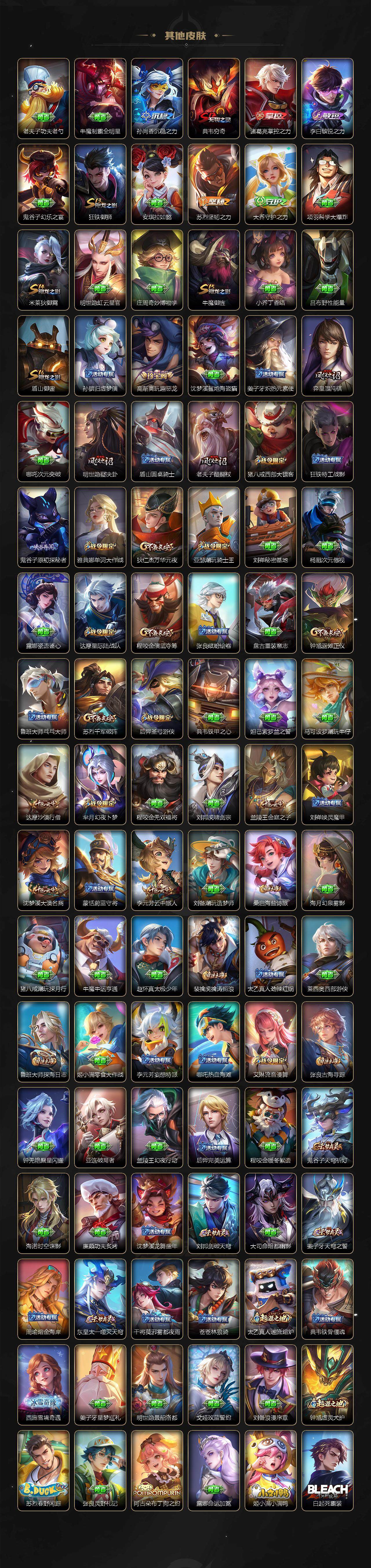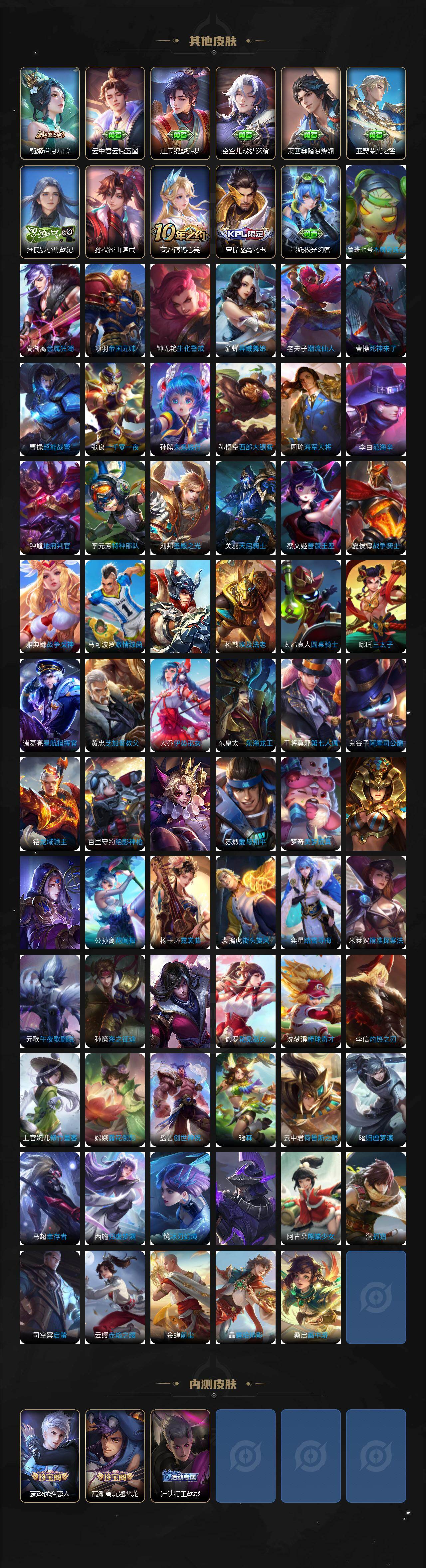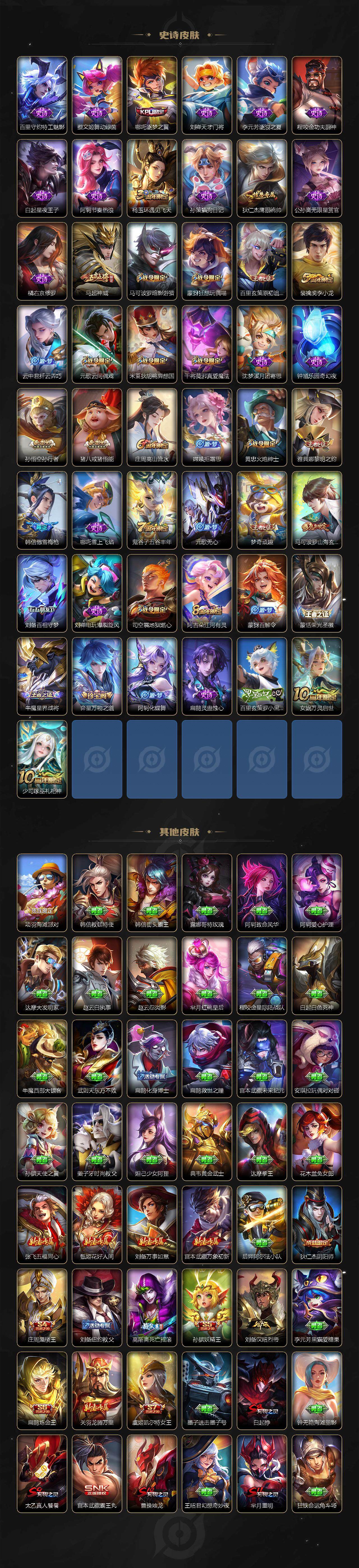 【限定皮肤】:白起狰,姜子牙天穹之誓,狄仁杰阴阳师,虞姬凯尔特女王,赵云皇家上将,嬴政优雅恋人,庄周蜃楼王,庄周高山流水,高渐离死亡摇滚,高渐离玩趣恶龙,孙膑妖精王,扁鹊炼金王,芈月重明,芈月幻夜卜梦,元歌云间偶戏,元歌无心,甄姬游园惊梦,曹操烛龙,典韦穷奇,马可波罗暗影游猎,马可波罗山海玄木吟,狄仁杰魔术师,狄仁杰万华元夜,达摩星际陆战队,达摩沙漠行僧,项羽海滩派对,老夫子醍醐杖,关羽冰锋战神,关羽武圣,程咬金演武夺筹,韩信傲雪梅枪,兰陵王金庭之子,花木兰青春决赛季,亚瑟潮玩骑士王,孙悟空至尊宝,孙悟空孙行者,牛魔御旌,后羿圣弓游侠,刘备百相守梦,李元芳云中旅人,虞姬启明星使,钟馗驱傩正仪,杨玉环遇见飞天,哪吒逐梦之翼,干将莫邪真爱魔法,雅典娜单词大作战,雅典娜黎明之约,太乙真人饕餮,鬼谷子原初探秘者,鬼谷子五谷丰年,诸葛亮武陵仙君,黄忠火炮绅士,苏烈千军破阵,百里玄策原初追逐者,弈星混沌棋,梦奇顽趣,沈梦溪大漠名商,明世隐疑决卦,裴擒虎李小龙,裴擒虎擒涛扼浪,狂铁御狮,米莱狄御霄,米莱狄胡桃异想国,云中君纤云弄巧,李信山海炽霜斩,盾山御銮,猪八戒西部大镖客,猪八戒猪悟能,嫦娥拒霜思,蒙犽狂想玩偶喵,鲁班大师探海日志,桑启海盐诗旅,艾琳流音漫舞,司空震地狱燃心,阿古朵江河有灵,张良古海寻踪,蒙犽百解令,蒙恬荣光圣徽,鬼谷子天穹祈灯,沈梦溪龙舞盛年,刘邦剑破天穹,周瑜熔金海岸