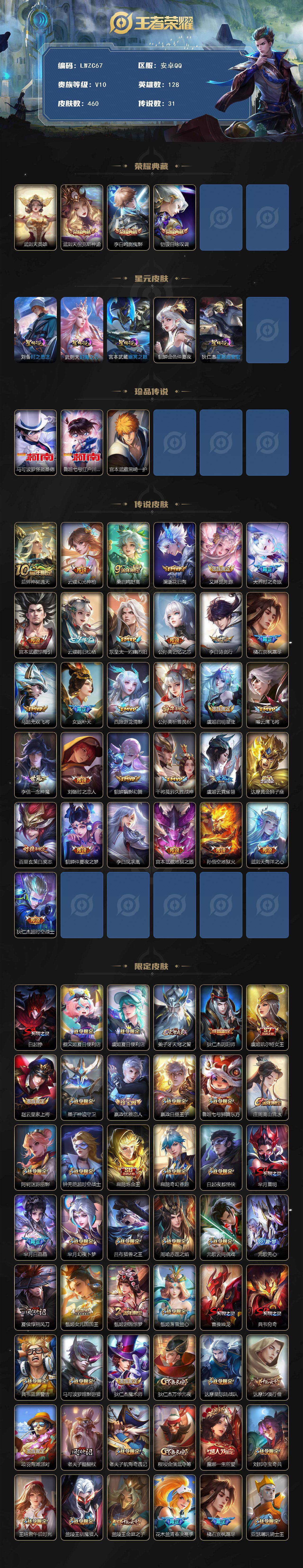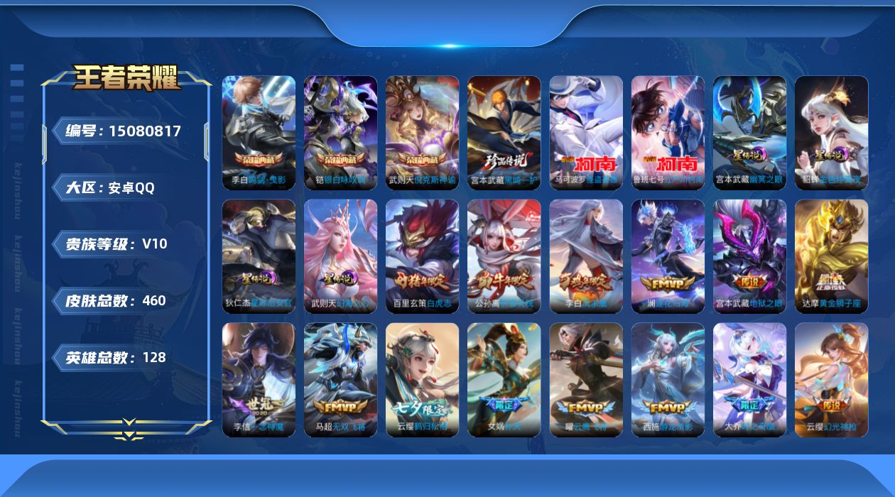 [15080817]可二次安卓Q-V10-最强王者段位-128英雄-460皮肤-3典藏皮肤-1典藏英雄-3珍品传说-31传说-5星元-155史诗