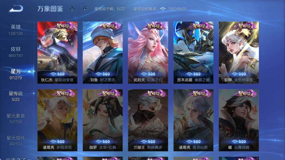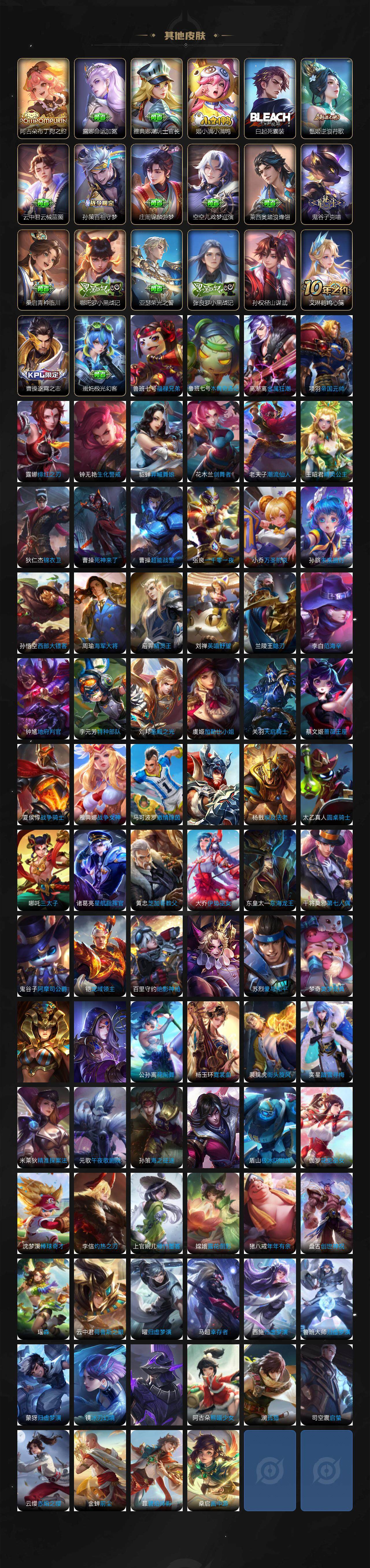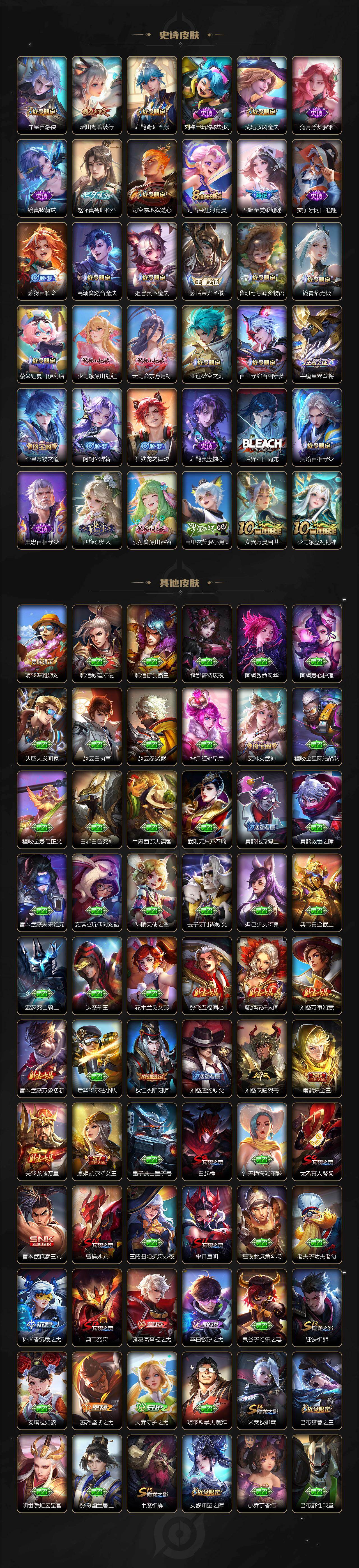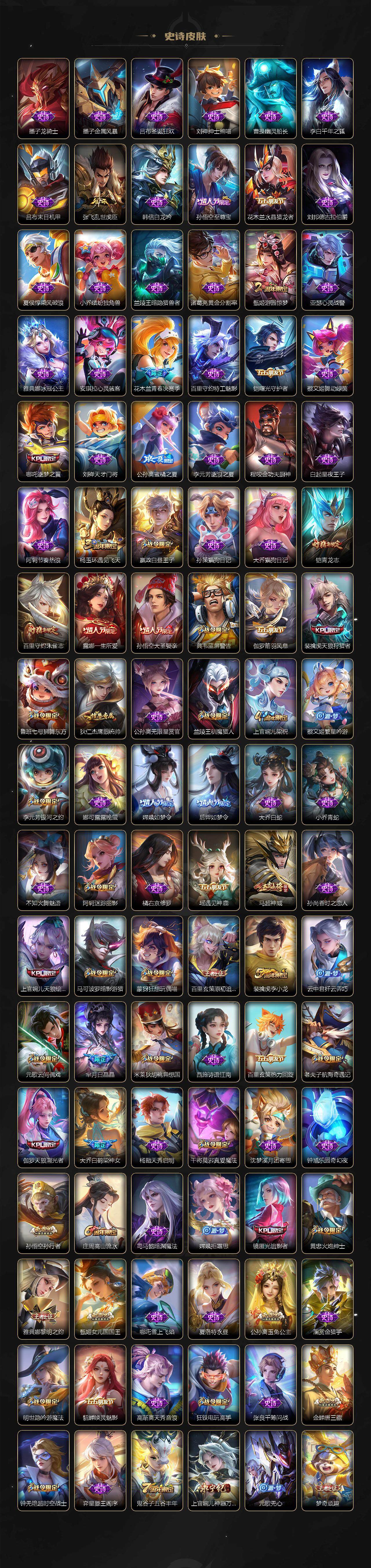 扁鹊炼金王,虞姬凯尔特女王,白起狰,太乙真人饕餮,曹操烛龙,芈月重明,典韦穷奇,狂铁御狮,米莱狄御霄,牛魔御旌,盾山御銮,夏侯惇朔风刀,明世隐疑决卦,老夫子醍醐杖,鬼谷子原初探秘者,狄仁杰万华元夜,程咬金演武夺筹,钟馗驱傩正仪,苏烈千军破阵,吕布猎兽之王,嬴政白昼王子,女娲朔望之晖,典韦蓝屏警告,钟馗神迹守卫,鲁班七号狮舞东方,沈梦溪星空之诺,李元芳银河之约,刘邦夺宝奇兵,马可波罗暗影游猎,蒙犽狂想玩偶喵,元歌云间偶戏,弈星混沌棋,达摩沙漠行僧,兰陵王金庭之子,沈梦溪大漠名商,李元芳云中旅人,桑启海盐诗旅,裴擒虎擒涛扼浪,鲁班大师探海日志,张良古海寻踪,项羽苍威无极,镜青焰无极