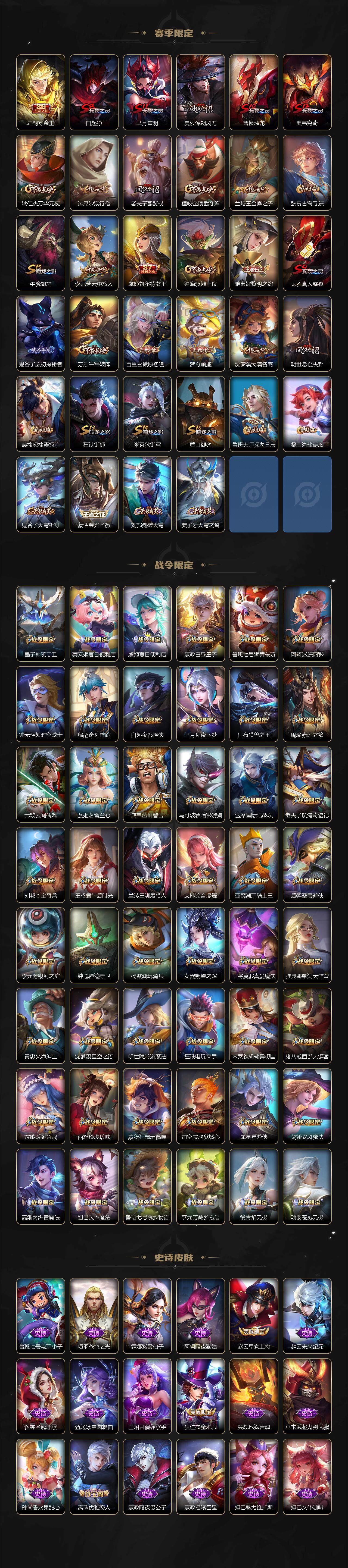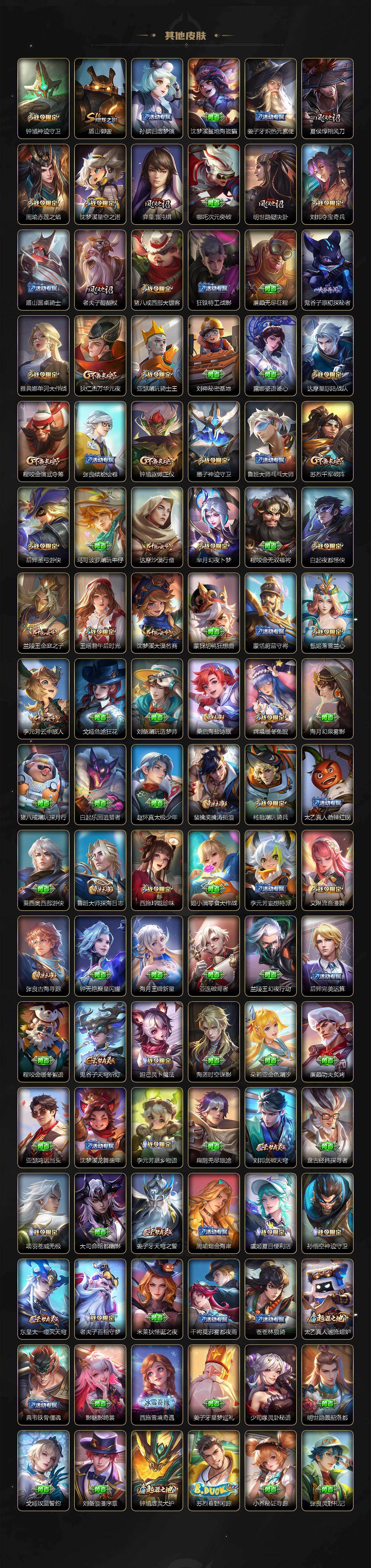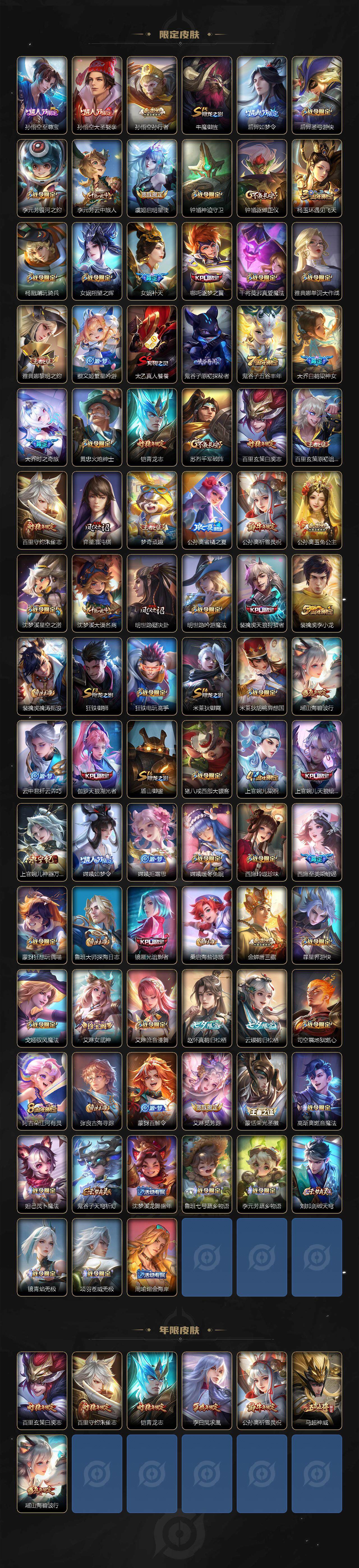 【限定皮肤】:白起狰,蔡文姬夏日便利店,虞姬夏日便利店,姜子牙天穹之誓,狄仁杰阴阳师,虞姬凯尔特女王,赵云皇家上将,墨子神迹守卫,嬴政优雅恋人,嬴政白昼王子,鲁班七号狮舞东方,庄周高山流水,阿轲迷踪丽影,钟无艳超时空战士,扁鹊炼金王,扁鹊奇幻香踪,白起夜都怪侠,芈月重明,芈月白晶晶,芈月幻夜卜梦,吕布猎兽之王,周瑜赤莲之焰,元歌云间偶戏,元歌无心,夏侯惇朔风刀,甄姬女儿国国王,甄姬游园惊梦,甄姬落雪兰心,曹操烛龙,典韦穷奇,典韦蓝屏警告,马可波罗暗影游猎,狄仁杰魔术师,狄仁杰万华元夜,达摩星际陆战队,达摩沙漠行僧,项羽海滩派对,老夫子醍醐杖,老夫子航海奇遇记,程咬金演武夺筹,露娜一生所爱,刘邦夺宝奇兵,王昭君午后时光,兰陵王驯魔猎人,兰陵王金庭之子,花木兰青春决赛季,橘右京枫霜尽,亚瑟潮玩骑士王,孙悟空至尊宝,孙悟空大圣娶亲,孙悟空孙行者,牛魔御旌,后羿如梦令,后羿圣弓游侠,李元芳银河之约,李元芳云中旅人,虞姬启明星使,钟馗神迹守卫,钟馗驱傩正仪,杨玉环遇见飞天,杨戬潮玩骑兵,女娲朔望之晖,女娲补天,哪吒逐梦之翼,干将莫邪真爱魔法,雅典娜单词大作战,雅典娜黎明之约,蔡文姬繁星吟游,太乙真人饕餮,鬼谷子原初探秘者,鬼谷子五谷丰年,大乔白鹤梁神女,大乔时之奇旅,黄忠火炮绅士,铠青