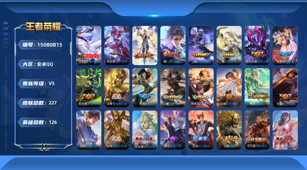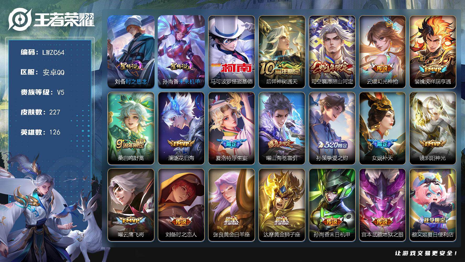 [15080815]【店主推荐捡漏号!可直接换绑】安卓Q-V5-最强王者段位-126英雄-227皮肤-1珍品传说-17传说-72史诗-2星元