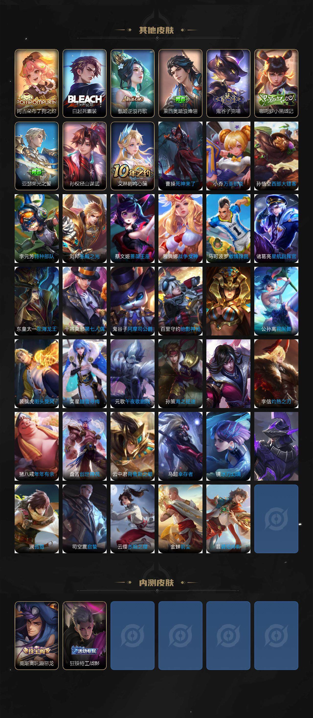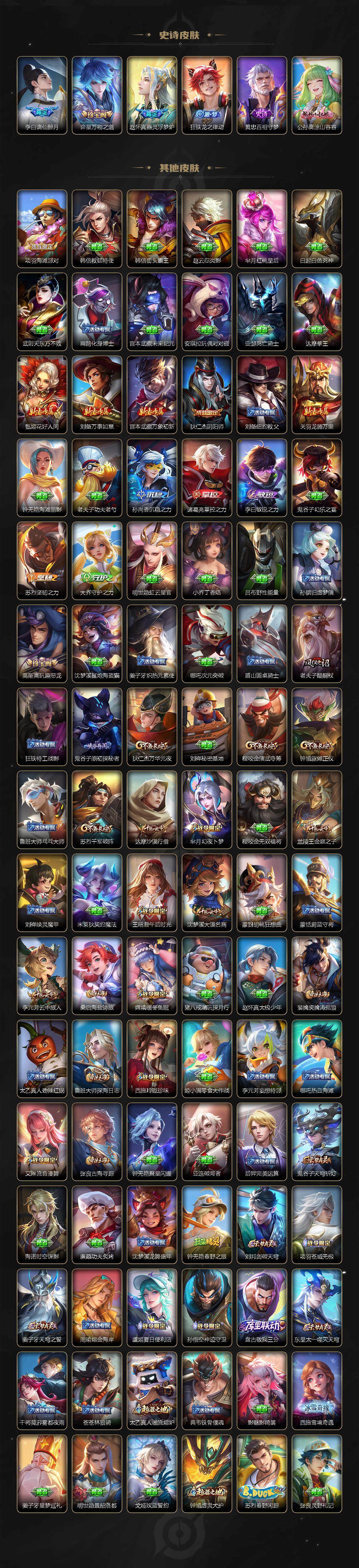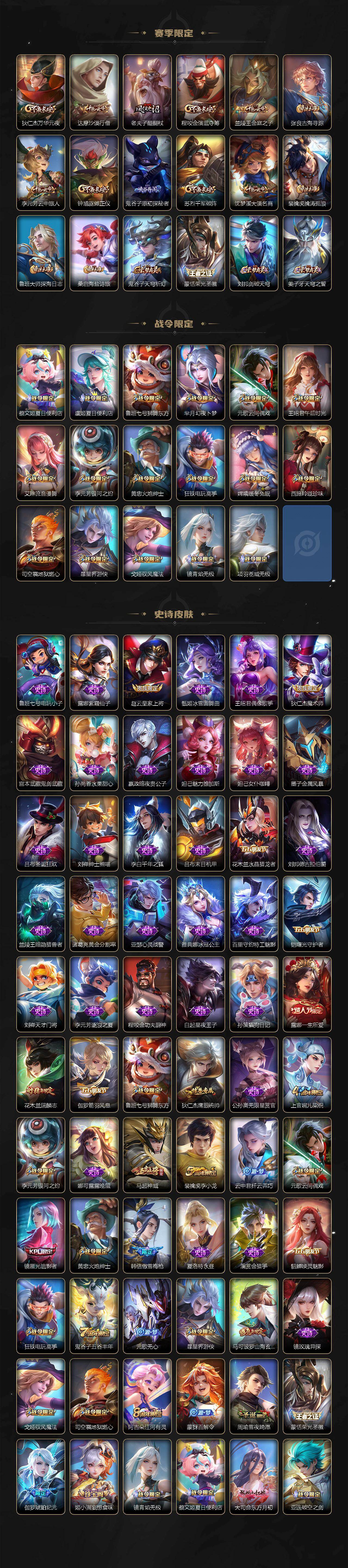 【限定皮肤】:蔡文姬夏日便利店,虞姬夏日便利店,姜子牙天穹之誓,李白谪仙醉月,狄仁杰阴阳师,赵云皇家上将,鲁班七号狮舞东方,高渐离玩趣恶龙,芈月幻夜卜梦,元歌云间偶戏,元歌无心,马可波罗山海玄木吟,狄仁杰魔术师,狄仁杰万华元夜,达摩沙漠行僧,项羽海滩派对,老夫子醍醐杖,程咬金演武夺筹,露娜一生所爱,韩信傲雪梅枪,王昭君午后时光,兰陵王金庭之子,花木兰瑞麟志,李元芳银河之约,李元芳云中旅人,钟馗驱傩正仪,女娲补天,鬼谷子原初探秘者,鬼谷子五谷丰年,黄忠火炮绅士,苏烈千军破阵,沈梦溪大漠名商,裴擒虎李小龙,裴擒虎擒涛扼浪,狂铁电玩高手,云中君纤云弄巧,孙策挚爱之约,上官婉儿梁祝,嫦娥暖冬兔眠,曜山海苍雷引,西施玲珑珍味,鲁班大师探海日志,镜匿光追影者,桑启海盐诗旅,夏洛特浮生妄,暃星界游侠,戈娅驭风魔法,艾琳流音漫舞,司空震地狱燃心,阿古朵江河有灵,张良古海寻踪,蒙犽百解令,蒙恬荣光圣徽,鬼谷子天穹祈灯,伽罗琥珀纪元,姬小满妄想食味,沈梦溪龙舞盛年,刘邦剑破天穹,镜青焰无极,项羽苍威无极,周瑜熔金海岸