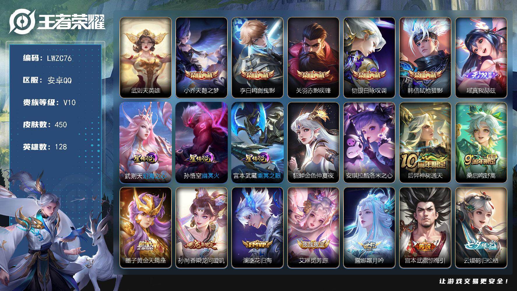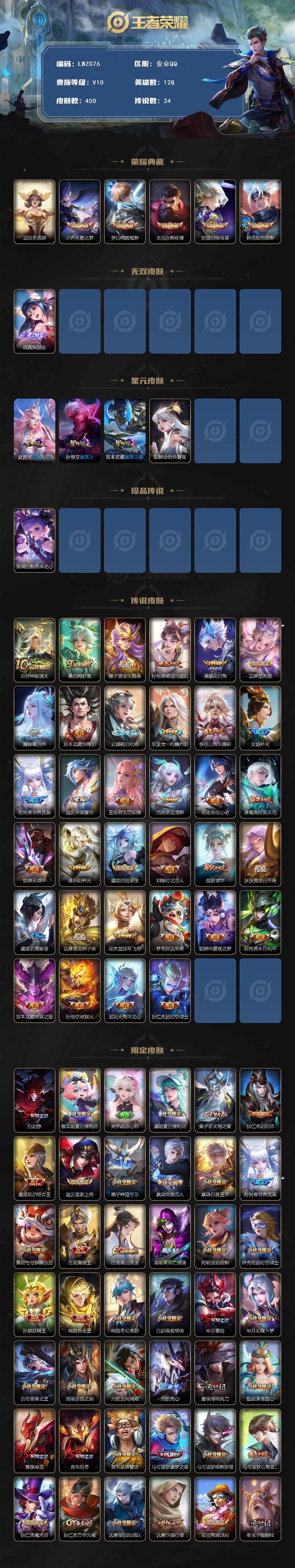[15080837]【特价出售/店主推荐】安卓Q-V10-最强王者段位-128英雄-450皮肤-5典藏皮肤-1典藏英雄-1无双-1珍品传说-34传说-135史诗
