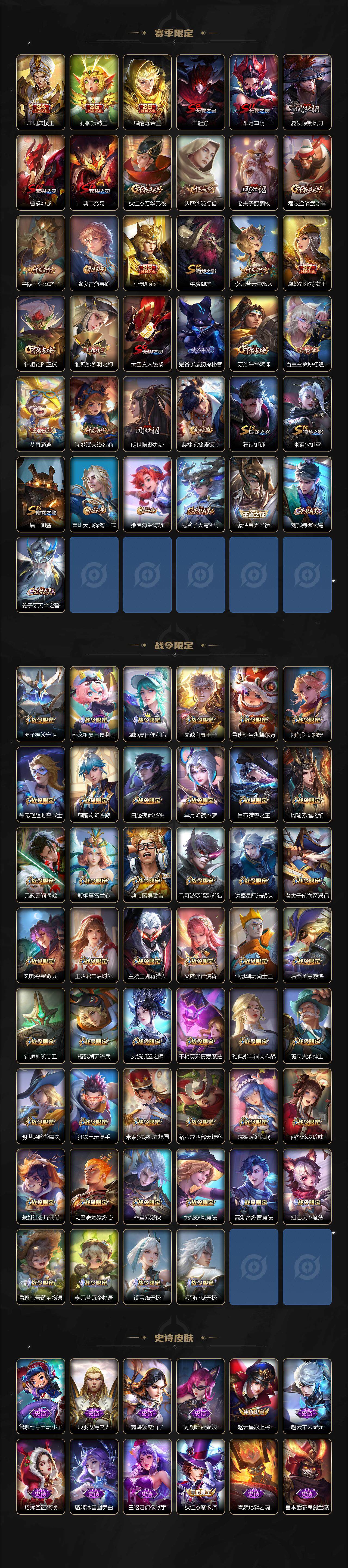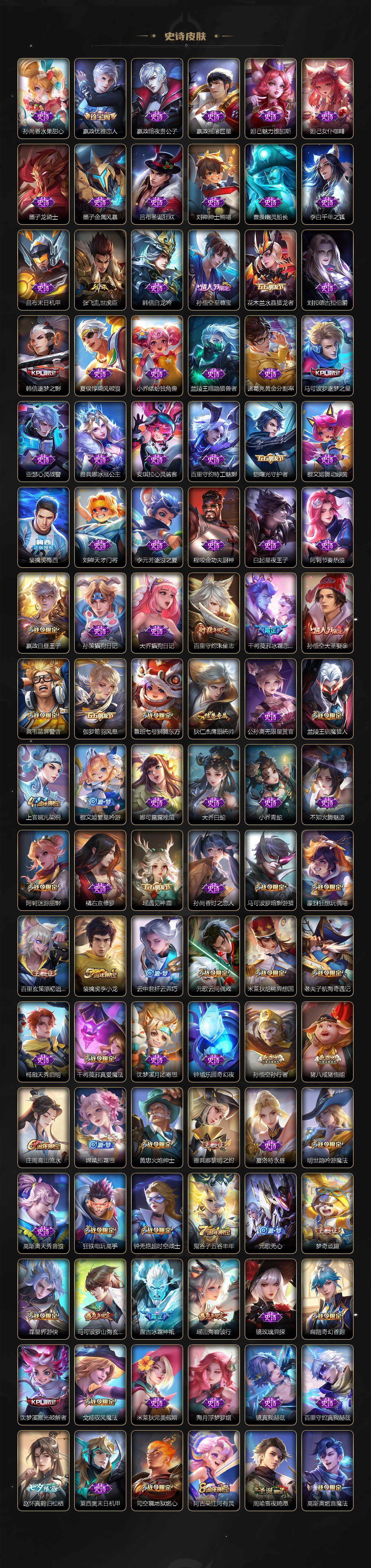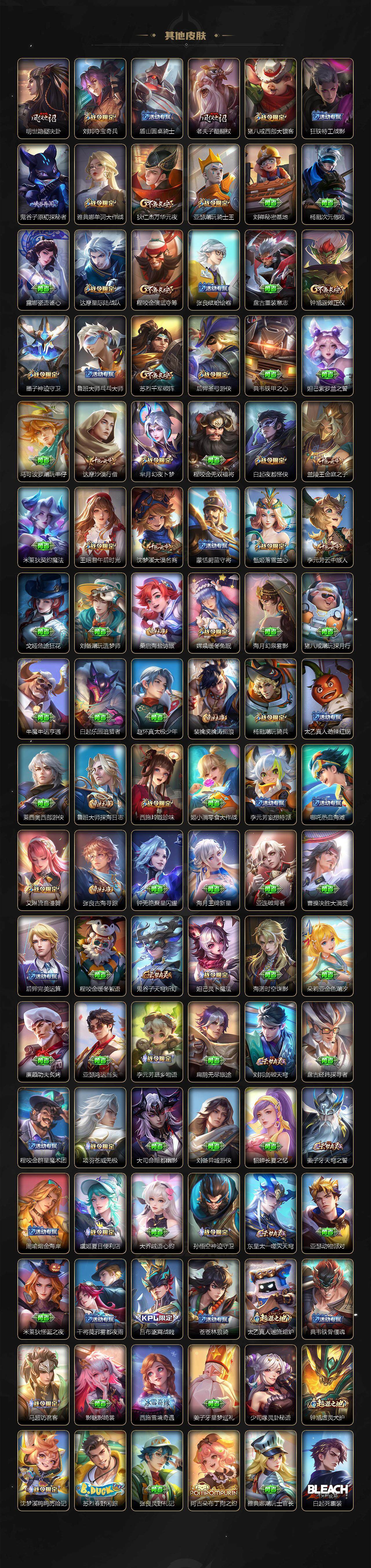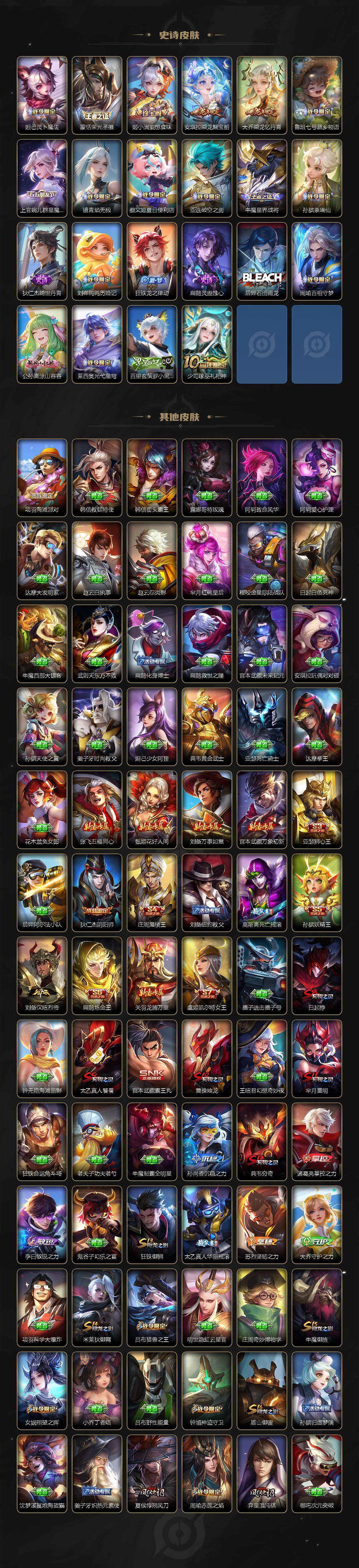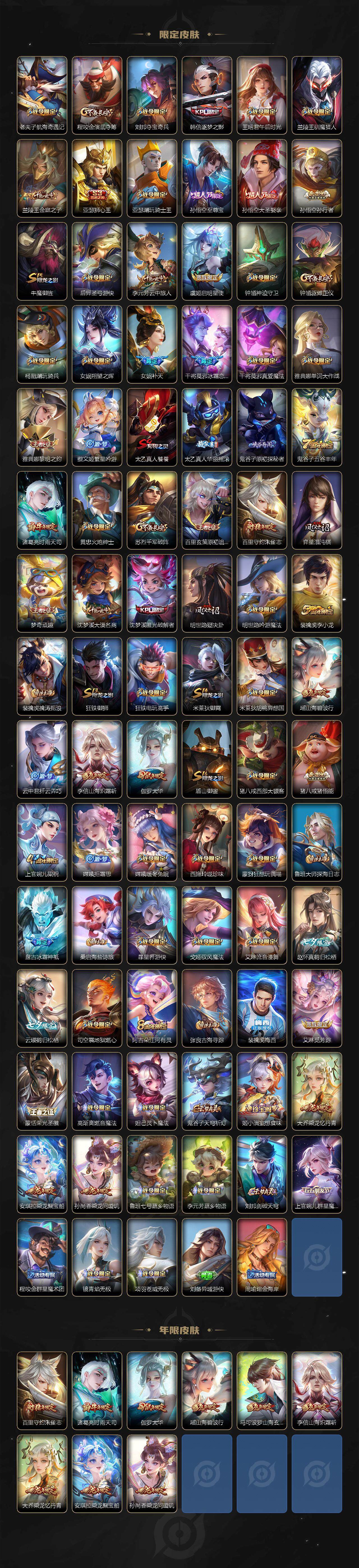 【限定皮肤】:白起狰,蔡文姬夏日便利店,大乔绒语心约,虞姬夏日便利店,姜子牙天穹之誓,狄仁杰阴阳师,虞姬凯尔特女王,赵云皇家上将,墨子神迹守卫,嬴政优雅恋人,嬴政白昼王子,孙尚香异界灵契,鲁班七号狮舞东方,庄周蜃楼王,庄周高山流水,高渐离死亡摇滚,阿轲迷踪丽影,钟无艳超时空战士,孙膑妖精王,扁鹊炼金王,扁鹊奇幻香踪,白起夜都怪侠,芈月重明,芈月幻夜卜梦,吕布猎兽之王,周瑜赤莲之焰,元歌云间偶戏,元歌无心,夏侯惇朔风刀,甄姬落雪兰心,曹操烛龙,典韦穷奇,典韦蓝屏警告,马可波罗逐梦之星,马可波罗暗影游猎,马可波罗山海玄木吟,狄仁杰魔术师,狄仁杰万华元夜,达摩星际陆战队,达摩沙漠行僧,项羽海滩派对,老夫子醍醐杖,老夫子航海奇遇记,程咬金演武夺筹,刘邦夺宝奇兵,韩信逐梦之影,王昭君午后时光,兰陵王驯魔猎人,兰陵王金庭之子,亚瑟狮心王,亚瑟潮玩骑士王,孙悟空至尊宝,孙悟空大圣娶亲,孙悟空孙行者,牛魔御旌,后羿圣弓游侠,李元芳云中旅人,虞姬启明星使,钟馗神迹守卫,钟馗驱傩正仪,杨戬潮玩骑兵,女娲朔望之晖,女娲补天,干将莫邪冰霜恋舞曲,干将莫邪真爱魔法,雅典娜单词大作战,雅典娜黎明之约,蔡文姬繁星吟游,太乙真人饕餮,太乙真人华丽摇滚,鬼谷子原初