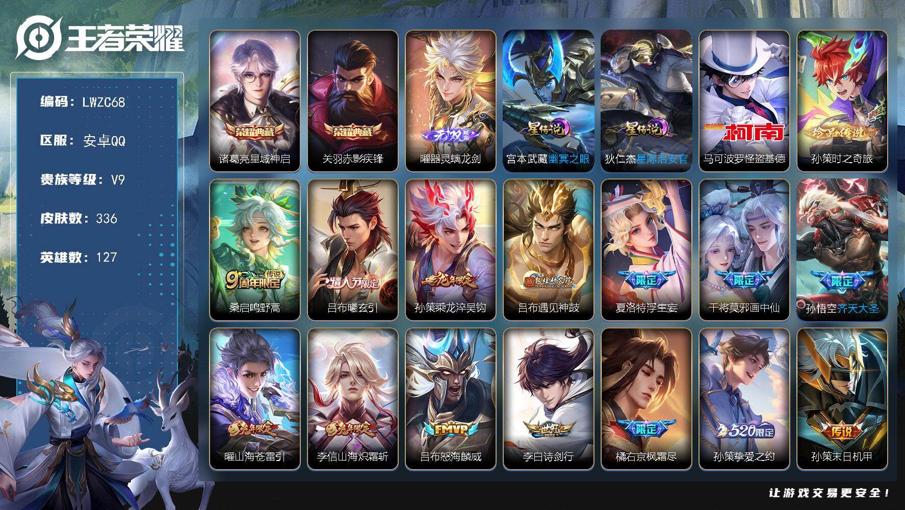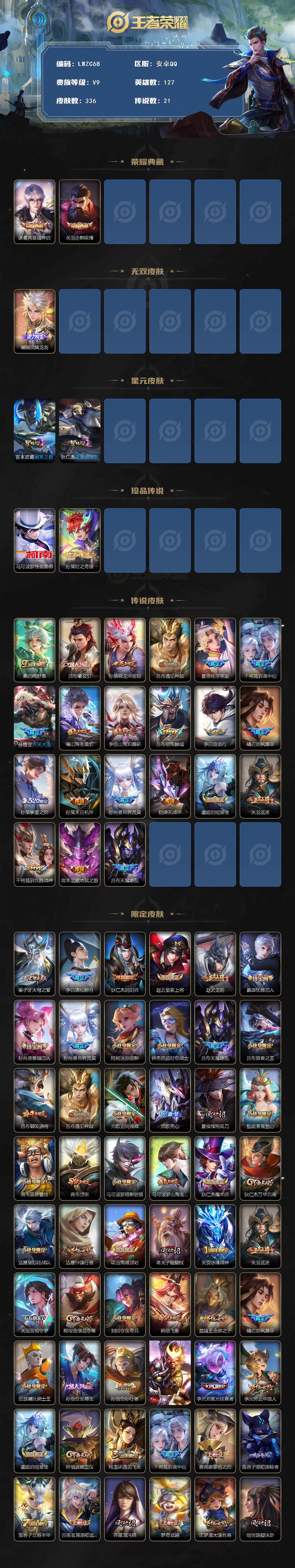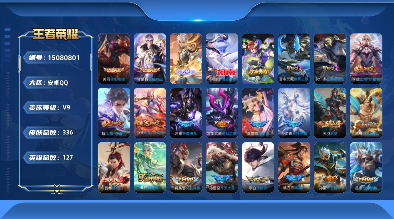 [15080801]【特价急出/详情看图】安卓Q-V9-最强王者段位-127英雄-336皮肤-2典藏皮肤-1无双-2珍品传说-2星元-21传说-103史诗