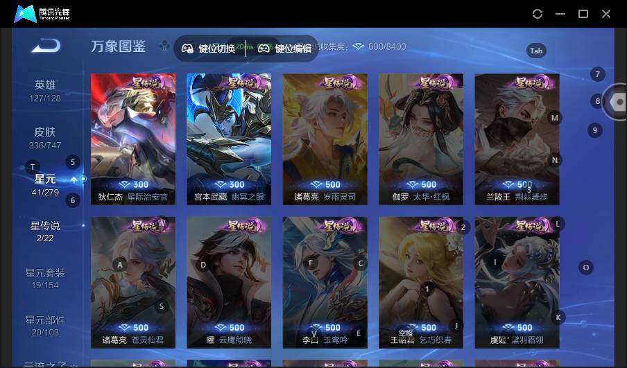 米莱狄御霄,夏侯惇朔风刀,明世隐疑决卦,老夫子醍醐杖,鬼谷子原初探秘者,狄仁杰万华元夜,程咬金演武夺筹,钟馗驱傩正仪,吕布猎兽之王,典韦蓝屏警告,刘邦夺宝奇兵,马可波罗暗影游猎,元歌云间偶戏,弈星混沌棋,达摩沙漠行僧,兰陵王金庭之子,沈梦溪大漠名商,李元芳云中旅人,桑启海盐诗旅,裴擒虎擒涛扼浪,鲁班大师探海日志,张良古海寻踪,项羽苍威无极,镜青焰无极