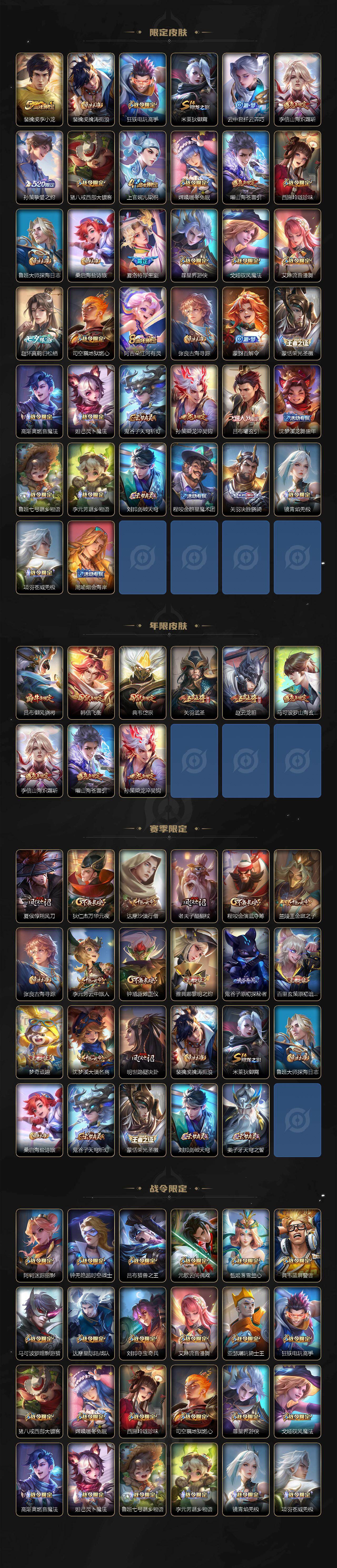 【限定皮肤】:姜子牙天穹之誓,李白谪仙醉月,狄仁杰阴阳师,赵云皇家上将,赵云龙胆,嬴政优雅恋人,孙尚香蔷薇恋人,孙尚香异界灵契,阿轲迷踪丽影,钟无艳超时空战士,吕布天魔缭乱,吕布猎兽之王,吕布御风骁将,吕布遇见神鼓,元歌云间偶戏,元歌无心,夏侯惇朔风刀,甄姬落雪兰心,典韦蓝屏警告,典韦岱宗,马可波罗暗影游猎,马可波罗山海玄木吟,狄仁杰魔术师,狄仁杰万华元夜,达摩星际陆战队,达摩沙漠行僧,项羽海滩派对,老夫子醍醐杖,关羽冰锋战神,关羽武圣,关羽百相守梦,程咬金演武夺筹,刘邦夺宝奇兵,韩信飞衡,兰陵王金庭之子,橘右京枫霜尽,亚瑟潮玩骑士王,孙悟空至尊宝,孙悟空孙行者,孙悟空齐天大圣,李元芳匿光侦查者,李元芳云中旅人,虞姬启明星使,钟馗驱傩正仪,杨玉环遇见飞天,干将莫邪画中仙,雅典娜黎明之约,鬼谷子原初探秘者,鬼谷子五谷丰年,百里玄策原初追逐者,弈星混沌棋,梦奇顽趣,沈梦溪大漠名商,明世隐疑决卦,裴擒虎李小龙,裴擒虎擒涛扼浪,狂铁电玩高手,米莱狄御霄,云中君纤云弄巧,李信山海炽霜斩,孙策挚爱之约,猪八戒西部大镖客,上官婉儿梁祝,嫦娥暖冬兔眠,曜山海苍雷引,西施玲珑珍味,鲁班大师探海日志,桑启海盐诗旅,夏洛特浮生妄,暃星界游侠,戈娅驭风魔法,艾琳流音漫舞,赵怀真鹤归松栖,司空震地狱燃心,阿古朵江河有灵,张良古海寻踪,蒙犽百解令,蒙恬荣光圣徽,高渐离燃音魔法,妲己灵卜魔法,鬼谷子天穹祈灯,孙策乘龙淬吴钩,吕布曦玄引,沈梦溪龙舞盛年,鲁班七号蔬乡物语,李元芳蔬乡物语,刘邦剑破天穹,程咬金群星魔术团,关羽决胜骁骑,镜青焰无极