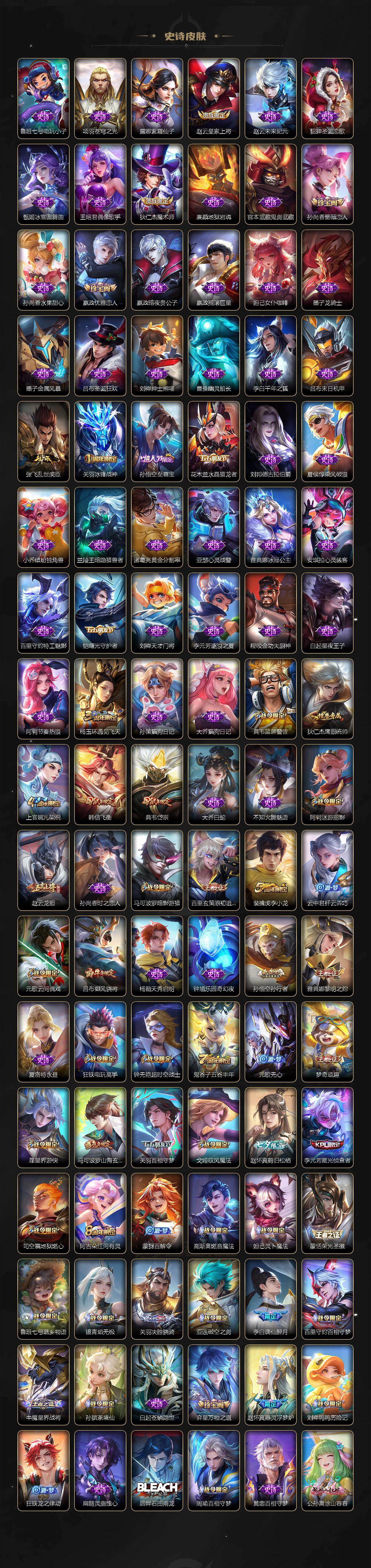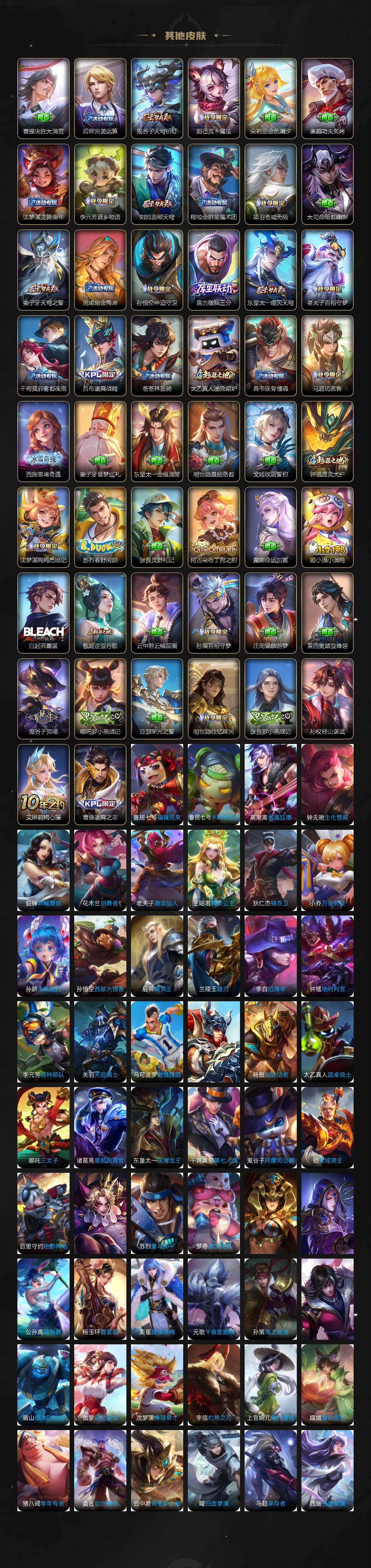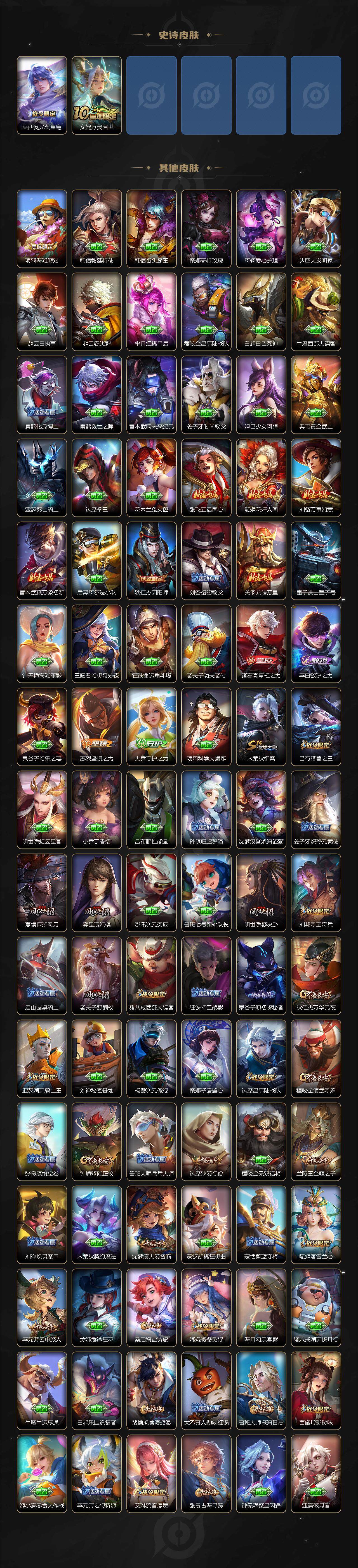 大乔白蛇,李元芳逐浪之夏,不知火舞魅语,大乔猫狗日记,孙策猫狗日记,阿轲节奏热浪,露娜紫霞仙子,诸葛亮黄金分割率,王昭君偶像歌手,项羽苍穹之光,孙尚香时之恋人,雅典娜冰冠公主,吕布末日机甲,鲁班七号电玩小子,墨子龙骑士,嬴政摇滚巨星,刘禅绅士熊喵,刘禅天才门将,白起星夜王子,安琪拉心灵骇客,程咬金功夫厨神,刘邦德古拉伯爵,兰陵王暗隐猎兽者,曹操幽灵船长,宫本武藏鬼剑武藏,亚瑟心灵战警,钟馗乐园奇幻夜,杨戬天秀·启明,廉颇地狱岩魂,小乔缤纷独角兽,夏侯惇乘风破浪,花木兰水晶猎龙者,铠曙光守护者,墨子金属风暴,百里玄策原初追逐者,吕布圣诞狂欢,貂蝉圣诞恋歌,百里守约特工魅影,嬴政暗夜贵公子,雅典娜黎明之约,李白千年之狐,夏洛特永昼,关羽百相守梦,赵怀真鹤归松栖,李元芳匿光侦查者,蒙犽百解令,高渐离燃音魔法,关羽决胜骁骑,李白谪仙醉月,白起苍鳞隐世,赵怀真器灵·浮梦炉