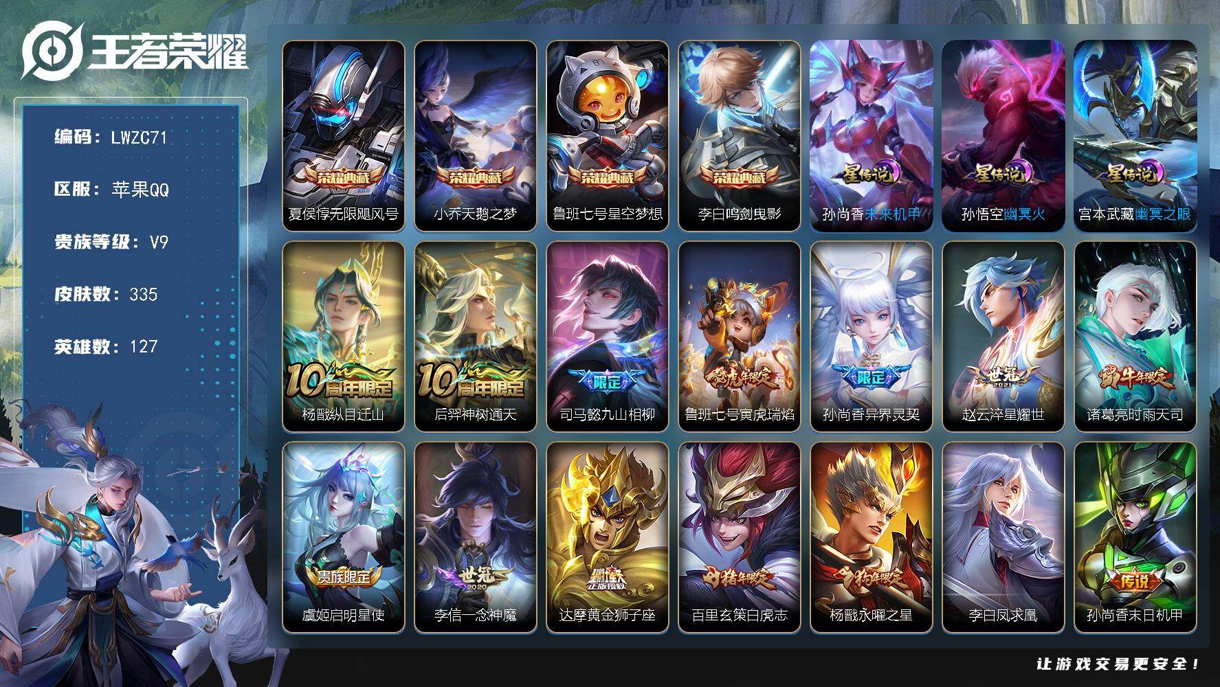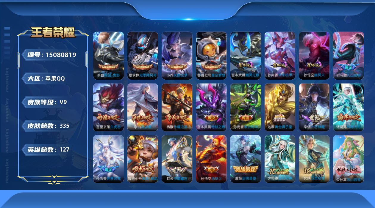 - [14204875]【店主推荐捡漏号!可直接换绑】对抗路40段,苹果Q-V7-最强王者段位-125英雄-233皮肤-1典藏皮肤-1珍品传说-1星传说-22传说-60史诗 【英雄全皮】:李信全皮 【荣耀典藏】:关羽赤影疾锋 【珍品传说】:孙策时之奇旅 【传说皮肤】:杨戬纵目迁山,后羿神树通天,司空震愿照山河定,澜愿照九州拓,裴擒虎祥瑞亨通,桑启鸣野蒿,露娜霜月吟,李信山海炽霜斩,吕布怒海麟威,马超无双飞将,镜炽阳神光,曜云鹰飞将,李信一念神魔,刘备时之恋人,伽罗太华,貂蝉猫影幻舞,干将莫邪久胜战神,虞姬云霓雀翎,达摩黄金狮子座,宫本武藏地狱之眼,孙悟空地狱火,狄仁杰超时空战士 【限定皮肤】:白起狰,狄仁杰阴阳师,虞姬凯尔特女王,赵云皇家上将,赵云引擎之心,孙尚香蔷薇恋人,高渐离死亡摇滚,扁鹊炼金王,芈月重明,吕布御风骁将,元歌云间偶戏,元歌无心,曹操烛龙,曹操天狼征服者,典韦穷奇,马可波罗山海玄木吟,狄仁杰魔术师,狄仁杰万华元夜,达摩沙漠行僧,项羽海滩派对,老夫子醍醐杖,程咬金演武夺筹,亚瑟潮玩骑士王,牛魔御旌,后羿辉光之辰,李元芳银河之约,李元芳云中旅人,钟馗驱傩正仪,干将莫邪胡桃夹子,雅典娜黎明之约,太乙真人饕餮,太乙真人华丽摇滚,鬼谷子原初探秘者,苏烈千军破阵,百里玄策原初追逐者,百里守约朱雀志,弈星混沌棋,梦奇顽趣,沈梦溪星空之诺,明世隐疑决卦,裴擒虎李小龙,裴擒虎擒涛扼浪,狂铁御狮,米莱狄御霄,李信山海炽霜斩,伽罗太华,盾山御銮,鲁班大师探海日志,桑启海盐诗旅,张良古海寻踪,蒙犽百解令,蒙恬荣光圣徽,鬼谷子天穹祈灯,沈梦溪龙舞盛年,刘邦剑破天穹 【年限皮肤】:百里守约朱雀志,后羿辉光之辰,吕布御风骁将,伽罗太华,马可波罗山海玄木吟,李信山海炽霜斩 【赛季限定】:扁鹊炼金王,白起狰,芈月重明,曹操烛龙,典韦穷奇,狄仁杰万华元夜,达摩沙漠行僧,老夫子醍醐杖,程咬金演武夺筹,张良古海寻踪,牛魔御旌,李元芳云中旅人,虞姬凯尔特女王,钟馗驱傩正仪,雅典娜黎明之约,太乙真人饕餮,鬼谷子原初探秘者,苏烈千军破阵,百里玄策原初追逐者,弈星混沌棋,梦奇顽趣,明世隐疑决卦,裴擒虎擒涛扼浪,狂铁御狮,米莱狄御霄,盾山御銮,鲁班大师探海日志,桑启海盐诗旅,鬼谷子天穹祈灯,蒙恬荣光圣徽,刘邦剑破天穹 【战令限定】:元歌云间偶戏,亚瑟潮玩骑士王,李元芳银河之约,沈梦溪星空之诺 【史诗皮肤】:露娜紫霞仙子