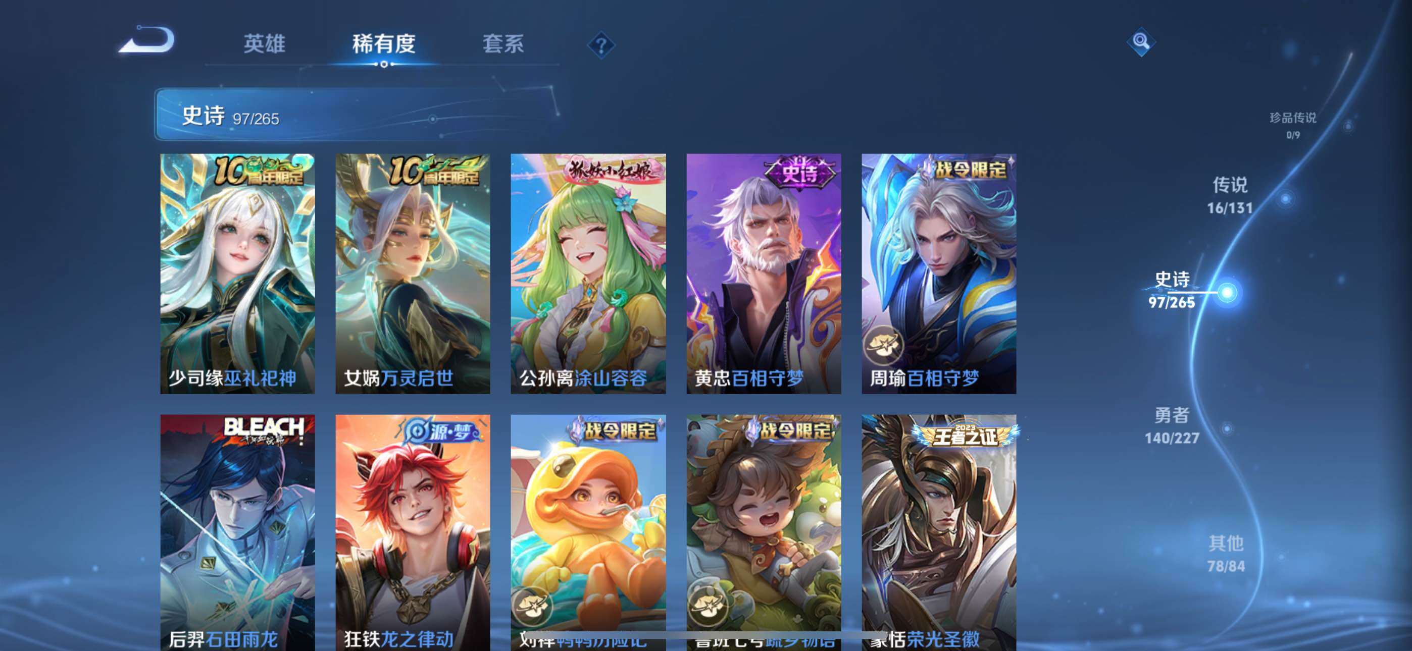 - PX_2113914-实名: 可修改 贵族等级: V7 英雄数: 123 皮肤数: 185 珍品传说: 黑崎一护 传说皮: 黄金狮子座,一念神魔,云霓雀翎,末日机甲-孙尚香,地狱火,超时空战士-狄仁杰,大乔-时之奇旅,祥瑞亨通 限定皮: 李小龙,孙行者,五谷丰年,山海·玄木吟,鸣野蒿,陌上桑,逐霄战戟,愿照·千秋盛,愿照·山河定,愿照·九州拓