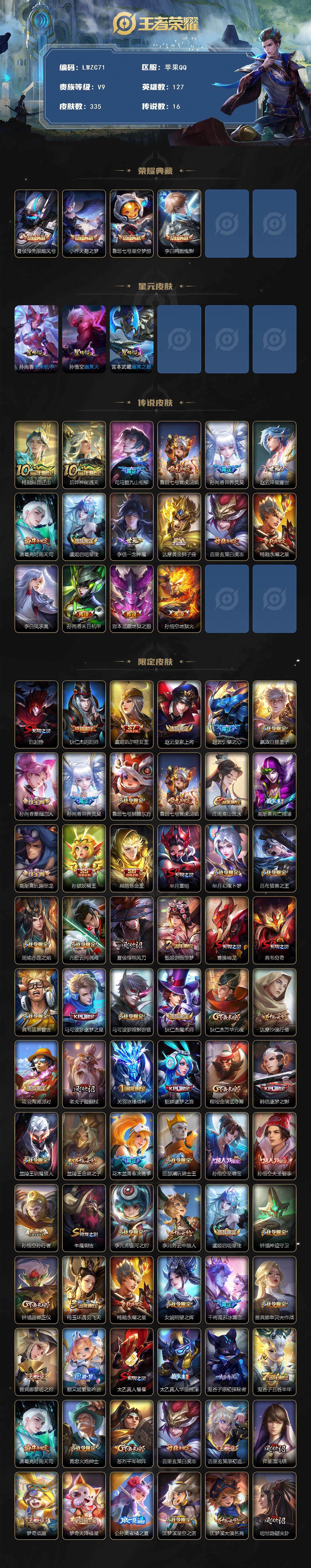 [15080819]【特价出售/店主推荐】打野38段、发育路37段,对抗路36段、中路31段,苹果Q-V9-最强王者段位-127英雄-335皮肤-4典藏皮肤-3星传说-16传说-97史诗 【英雄全皮】:鬼谷子全皮,猪八戒全皮 【荣耀典藏】:夏侯惇无限飓风号,小乔天鹅之梦,鲁班七号星空梦想,李白鸣剑曳影 【传说皮肤】:杨戬纵目迁山,后羿神树通天,司马懿九山相柳,鲁班七号寅虎瑞焰,孙尚香异界灵契,赵云淬星耀世,诸葛亮时雨天司,虞姬启明星使,李信一念神魔,达摩黄金狮子座,百里玄策白虎志,杨戬永曜之星,李白凤求凰,孙尚香末日机甲,宫本武藏地狱之眼,孙悟空地狱火 【限定皮肤】:白起狰,狄仁杰阴阳师,虞姬凯尔特女王,赵云皇家上将,赵云引擎之心,嬴政白昼王子,孙尚香蔷薇恋人,孙尚香异界灵契,鲁班七号狮舞东方,鲁班七号寅虎瑞焰,庄周高山流水,高渐离死亡摇滚,高渐离玩趣恶龙,孙膑妖精王,扁鹊炼金王,芈月重明,芈月幻夜卜梦,吕布猎兽之王,周瑜赤莲之焰,元歌云间偶戏,夏侯惇朔风刀,甄姬游园惊梦,曹操烛龙,典韦穷奇,典韦蓝屏警告,马可波罗逐梦之星,马可波罗暗影游猎,狄仁杰魔术师,狄仁杰万华元夜,达摩沙漠行僧,项羽海滩派对,老夫子醍醐杖,关羽冰锋战神,貂蝉逐梦之音,程咬金演武夺筹,韩信逐梦之影,兰陵王驯魔猎人,兰陵王金庭之子,花木兰青春决赛季,亚瑟潮玩骑士王,孙悟空至尊宝,孙悟空大圣娶亲,孙悟空孙行者,牛魔御旌,李元芳银河之约,李元芳云中旅人,虞姬启明星使,钟馗神迹守卫,钟馗驱傩正仪,杨玉环遇见飞天,杨戬永曜之星,女娲朔望之晖,干将莫邪冰霜恋舞曲,雅典娜单词大作战,雅典娜黎明之约,蔡文姬繁星吟游,太乙真人饕餮,太乙真人华丽摇滚,鬼谷子原初探秘者,鬼谷子五谷丰年,诸葛亮时雨天司,黄忠火炮绅士,苏烈千军破阵,百里玄策白虎志,百里玄策原初追逐者,弈星混沌棋,梦奇顽趣,梦奇天降福星,公孙离蜜橘之夏,沈梦溪星空之诺,沈梦溪大漠名商,明世隐疑决卦,裴擒虎李小龙,裴擒虎擒涛扼浪,狂铁御狮,米莱狄御霄,云中君纤云弄巧,盾山御銮,猪八戒西部大镖客,猪八戒猪悟能,上官婉儿梁祝,嫦娥暖冬兔眠,蒙犽狂想玩偶喵,鲁班大师探海日志,桑启海盐诗旅,张良古海寻踪,裴擒虎梅西,蒙恬荣光圣徽,高渐离燃音魔法,妲己灵卜魔法,鬼谷子天穹祈灯,鲁班七号蔬乡物语,李元芳蔬乡物语,刘邦剑破天穹 【年限皮肤】:百里玄策白虎志,鲁班七号寅虎瑞焰,李白凤求凰,