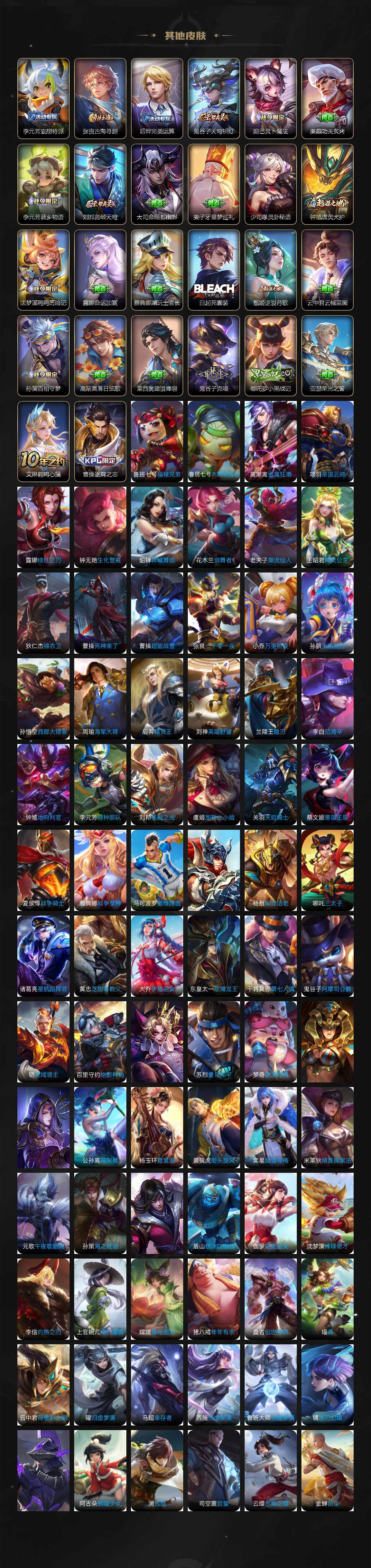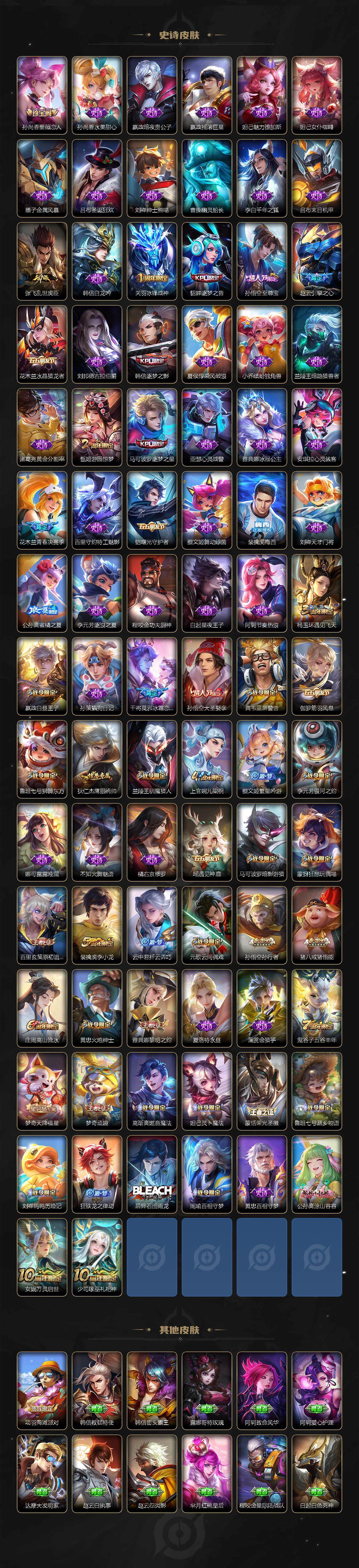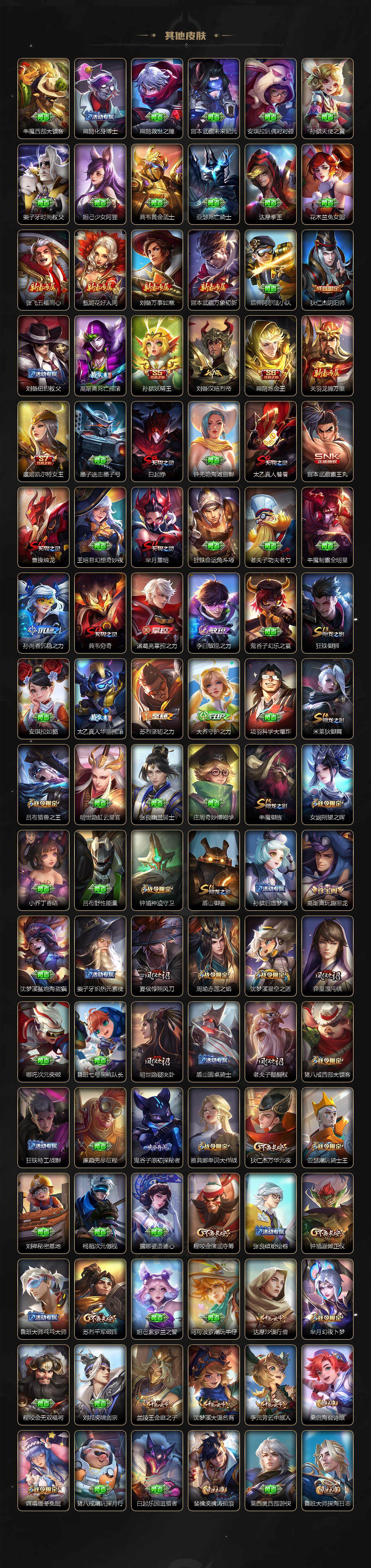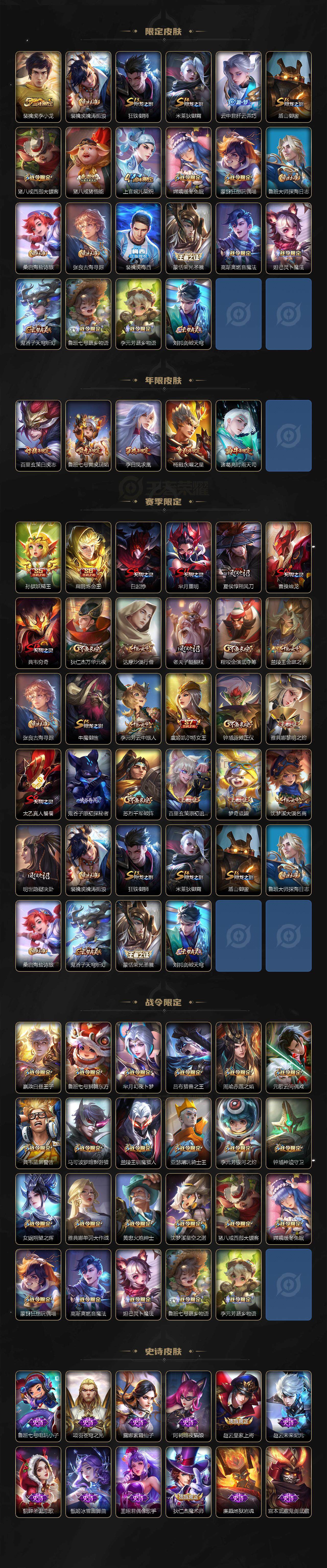 【限定皮肤】:白起狰,狄仁杰阴阳师,虞姬凯尔特女王,赵云皇家上将,赵云引擎之心,嬴政白昼王子,孙尚香蔷薇恋人,孙尚香异界灵契,鲁班七号狮舞东方,鲁班七号寅虎瑞焰,庄周高山流水,高渐离死亡摇滚,高渐离玩趣恶龙,孙膑妖精王,扁鹊炼金王,芈月重明,芈月幻夜卜梦,吕布猎兽之王,周瑜赤莲之焰,元歌云间偶戏,夏侯惇朔风刀,甄姬游园惊梦,曹操烛龙,典韦穷奇,典韦蓝屏警告,马可波罗逐梦之星,马可波罗暗影游猎,狄仁杰魔术师,狄仁杰万华元夜,达摩沙漠行僧,项羽海滩派对,老夫子醍醐杖,关羽冰锋战神,貂蝉逐梦之音,程咬金演武夺筹,韩信逐梦之影,兰陵王驯魔猎人,兰陵王金庭之子,花木兰青春决赛季,亚瑟潮玩骑士王,孙悟空至尊宝,孙悟空大圣娶亲,孙悟空孙行者,牛魔御旌,李元芳银河之约,李元芳云中旅人,虞姬启明星使,钟馗神迹守卫,钟馗驱傩正仪,杨玉环遇见飞天,杨戬永曜之星,女娲朔望之晖,干将莫邪冰霜恋舞曲,雅典娜单词大作战,雅典娜黎明之约,蔡文姬繁星吟游,太乙真人饕餮,太乙真人华丽摇滚,鬼谷子原初探秘者,鬼谷子五谷丰年,诸葛亮时雨天司,黄忠火炮绅士,苏烈千军破阵,百里玄策白虎志,百里玄策原初追逐者,弈星混沌棋,梦奇顽趣,梦奇天降福星,公孙离蜜橘之夏,沈梦溪星空之诺,沈梦溪大漠名商,明世隐疑决卦,裴擒虎李小龙,裴擒虎擒涛扼浪,狂铁御狮,米莱狄御霄,云中君纤云弄巧,盾山御銮,猪八戒西部大镖客,猪八戒猪悟能,上官婉儿梁祝,嫦娥暖冬兔眠,蒙犽狂想玩偶喵,鲁班大师探海日志,桑启海盐诗旅,张良古海寻踪,裴擒虎梅西,蒙恬荣光圣徽,高渐离燃音魔法,妲己灵卜魔法,鬼谷子天穹祈灯,鲁班七号蔬乡物语,李元芳蔬乡物语,刘邦剑破天穹