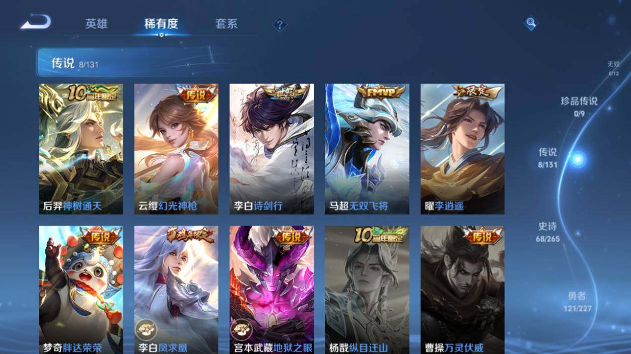 【传说皮肤】:后羿神树通天,云缨幻光神枪,李白诗剑行,马超无双飞将,曜李逍遥 ,梦奇胖达荣荣,李白凤求凰,宫本武藏地狱之眼