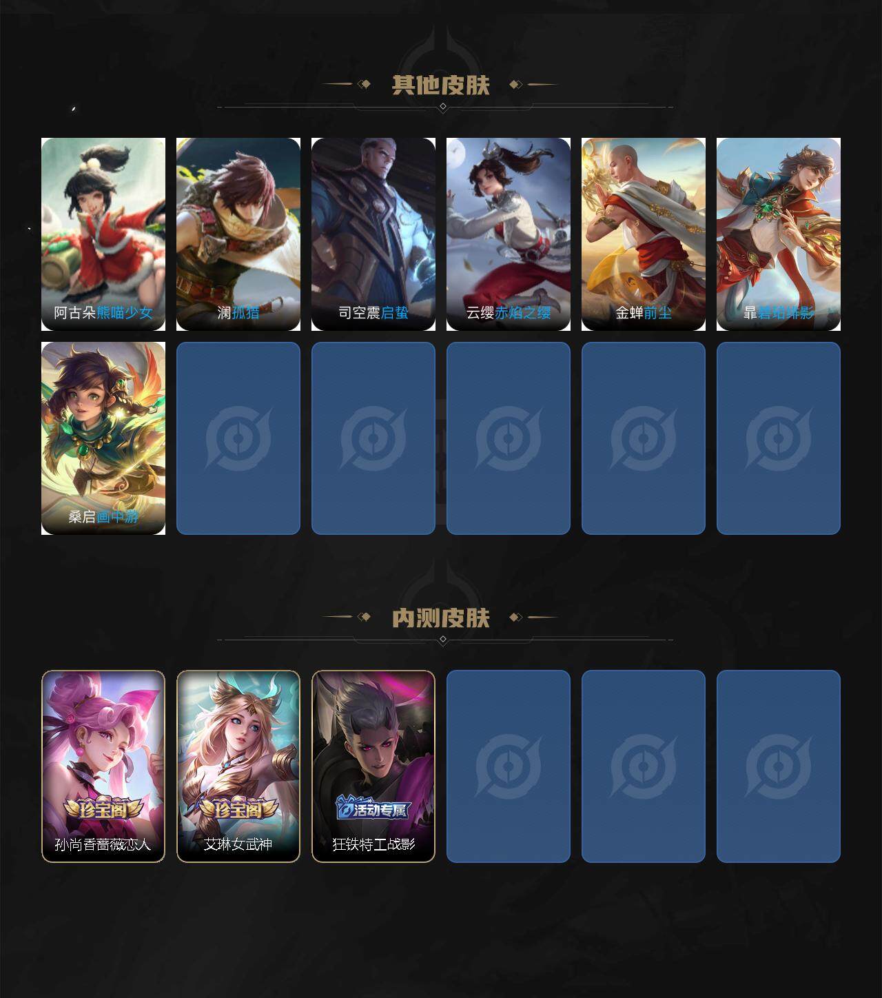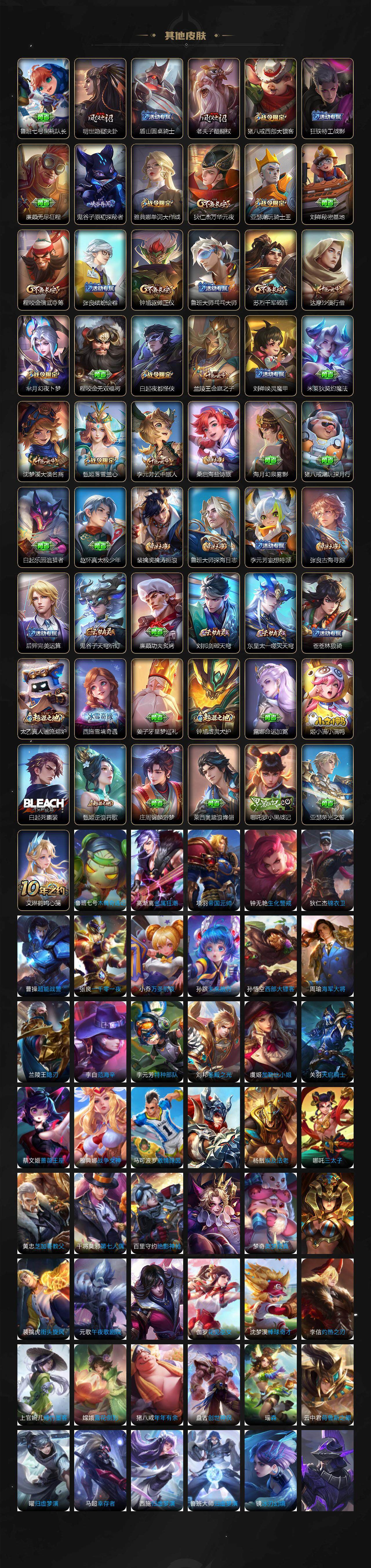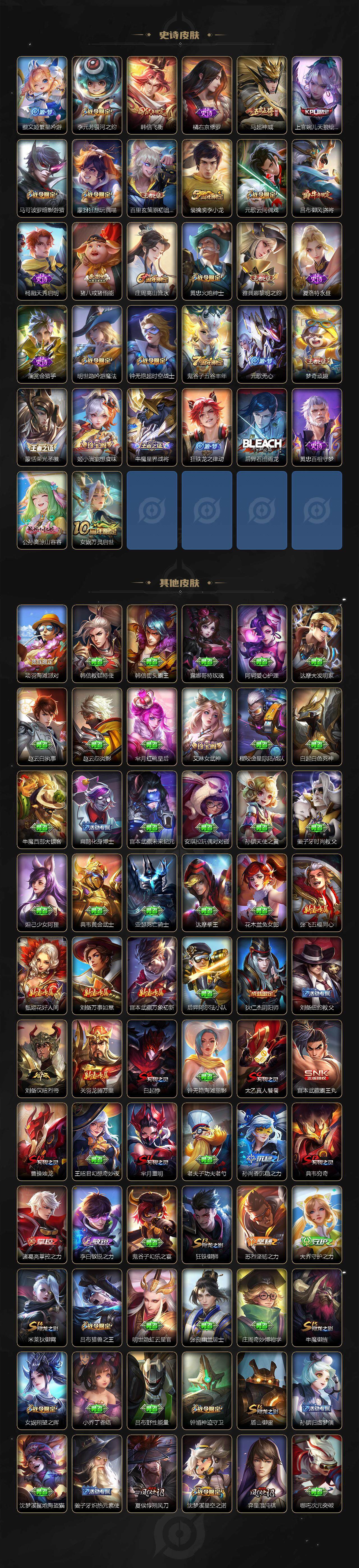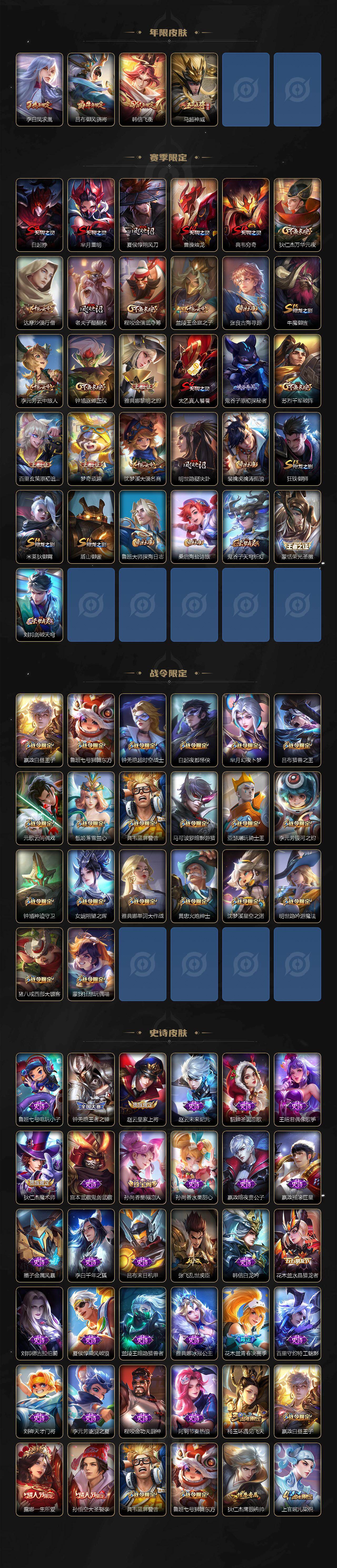 【限定皮肤】:白起狰,狄仁杰阴阳师,赵云皇家上将,嬴政白昼王子,孙尚香蔷薇恋人,鲁班七号狮舞东方,庄周高山流水,钟无艳王者之锤,钟无艳超时空战士,白起夜都怪侠,芈月重明,芈月幻夜卜梦,吕布猎兽之王,吕布御风骁将,元歌云间偶戏,元歌无心,夏侯惇朔风刀,甄姬落雪兰心,曹操烛龙,典韦穷奇,典韦蓝屏警告,马可波罗暗影游猎,狄仁杰魔术师,狄仁杰万华元夜,达摩沙漠行僧,项羽海滩派对,老夫子醍醐杖,程咬金演武夺筹,露娜一生所爱,韩信飞衡,兰陵王金庭之子,花木兰青春决赛季,亚瑟潮玩骑士王,孙悟空大圣娶亲,牛魔御旌,李元芳银河之约,李元芳云中旅人,钟馗神迹守卫,钟馗驱傩正仪,杨玉环遇见飞天,女娲朔望之晖,雅典娜单词大作战,雅典娜黎明之约,蔡文姬繁星吟游,太乙真人饕餮,鬼谷子原初探秘者,鬼谷子五谷丰年,黄忠火炮绅士,苏烈千军破阵,百里玄策原初追逐者,弈星混沌棋,梦奇顽趣,沈梦溪星空之诺,沈梦溪大漠名商,明世隐疑决卦,明世隐吟游魔法,裴擒虎李小龙,裴擒虎擒涛扼浪,狂铁御狮,米莱狄御霄,盾山御銮,猪八戒西部大镖客,猪八戒猪悟能,上官婉儿梁祝,上官婉儿天狼绘梦者,曜李逍遥 ,蒙犽狂想玩偶喵,鲁班大师探海日志,桑启海盐诗旅,艾琳女武神,张良古海寻踪,蒙恬荣光圣徽,鬼谷子天穹祈灯,姬小满妄想食味,刘邦剑破天穹