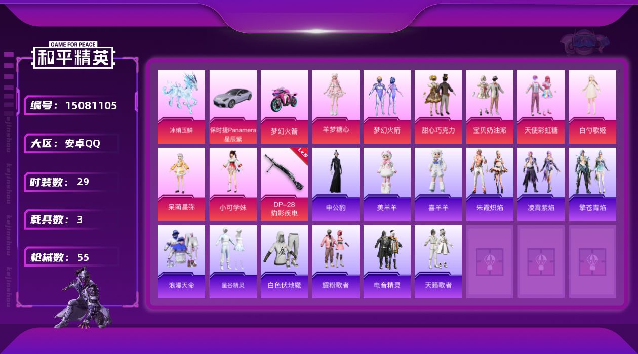 [15081105]可二次【店主推荐捡漏号!可直接换绑】 安卓 手Q-8粉装-1特效枪-3载具-3粉色飞行器-1.8w热力值-1王牌印记-29套装-55枪皮【热门品类】:粉装-梦幻火箭,套装-浪漫天命【粉色载具】:保时捷Panamera(星辰紫),双人摩托-梦幻火箭,冰绡玉鳞【粉色套装】:粉装-甜心巧克力,粉装-宝贝奶油派,粉装-天使彩虹糖,粉装-梦幻火箭,角色-白勺歌姬,角色-呆萌星弥,角色-小可学妹,角色-羊梦糖心【粉色枪皮等级】:DP-28-豹影疾电(五级)【粉色飞行器】:梦幻火箭飞行器,灵珠游龙飞行器