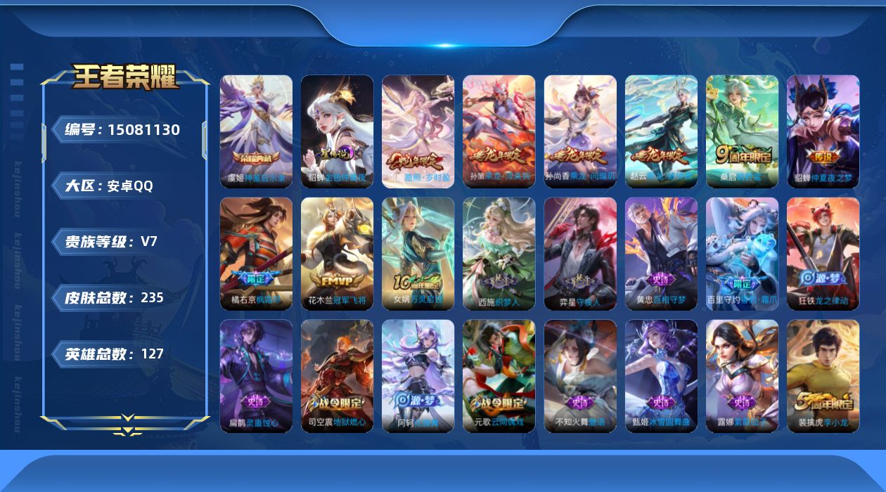 [15081130]可二次【店主推荐捡漏号!可直接换绑】安卓Q-V7-至尊星耀III段位-127英雄-235皮肤-1典藏皮肤-9传说-64史诗-1星元 【英雄全皮】:鬼谷子全皮,空空儿全皮 【荣耀典藏】:虞姬神鉴启示录 【传说皮肤】:后羿神树通天,虞姬愿照岁时盈,桑启鸣野蒿,孙尚香乘龙问璇玑,孙策乘龙淬吴钩,赵云乘龙铭钟鼎,橘右京枫霜尽,花木兰冠军飞将,貂蝉仲夏夜之梦 【限定皮肤】:大乔绒语心约,狄仁杰阴阳师,赵云皇家上将,孙尚香蔷薇恋人,扁鹊奇幻香踪,元歌云间偶戏,夏侯惇朔风刀,狄仁杰魔术师,狄仁杰万华元夜,达摩星际陆战队,达摩沙漠行僧,项羽海滩派对,老夫子醍醐杖,程咬金演武夺筹,兰陵王金庭之子,橘右京枫霜尽,亚瑟潮玩骑士王,李元芳云中旅人,钟馗驱傩正仪,杨戬潮玩骑兵,干将莫邪胡桃夹子,蔡文姬繁星吟游,鬼谷子原初探秘者,鬼谷子五谷丰年,苏烈千军破阵,弈星混沌棋,沈梦溪大漠名商,明世隐疑决卦,裴擒虎李小龙,裴擒虎擒涛扼浪,米莱狄胡桃异想国,云中君纤云弄巧,伽罗天狼溯光者,嫦娥拒霜思,鲁班大师探海日志,桑启海盐诗旅,艾琳女武神,艾琳流音漫舞,司空震地狱燃心,阿古朵江河有灵,张良古海寻踪,蒙犽百解令,高渐离燃音魔法,鬼谷子天穹祈灯,孙尚香乘龙问璇玑,孙策乘龙淬吴钩,赵云乘龙铭钟鼎,刘邦剑破天穹,程咬金群星魔术团,镜青焰无极,项羽苍威无极,周瑜熔金海岸 【年限皮肤】:孙尚香乘龙问璇玑,孙策乘龙淬吴钩,赵云乘龙铭钟鼎 【赛季限定】:夏侯惇朔风刀,狄仁杰万华元夜,达摩沙漠行僧,老夫子醍醐杖,程咬金演武夺筹,兰陵王金庭之子,张良古海寻踪,李元芳云中旅人,钟馗驱傩正仪,鬼谷子原初探秘者,苏烈千军破阵,弈星混沌棋,沈梦溪大漠名商,明世隐疑决卦,裴擒虎擒涛扼浪,鲁班大师探海日志,桑启海盐诗旅,鬼谷子天穹祈灯,刘邦剑破天穹 【战令限定】:扁鹊奇幻香踪,元歌云间偶戏,达摩星际陆战队,艾琳流音漫舞,亚瑟潮玩骑士王,杨戬潮玩骑兵,米莱狄胡桃异想国,司空震地狱燃心,高渐离燃音魔法,镜青焰无极,项羽苍威无极 【史诗皮肤】:露娜紫霞仙子,阿轲暗夜猫娘,赵云皇家上将,赵云未来纪元,貂蝉圣诞恋歌,甄姬冰雪圆舞曲,王昭君偶像歌手,狄仁杰魔术师,廉颇地狱岩魂,宫本武藏鬼剑武藏,孙尚香蔷薇恋人,孙尚香水果甜心,嬴政摇滚巨星,妲己魅力维加斯,妲己女仆咖啡,墨子龙骑士,墨子金属风暴,吕布圣诞狂欢,曹操幽灵船长,吕布末日机甲,张飞